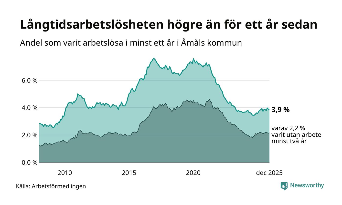 Andelen långtidsarbetslösa i Åmål är den näst högsta i Västra Götalands län, bara i Gullspång är andelen högre 4,3 procent.I Öckerö finns länets lägsta långtidsarbetslöshet, 0,9 procent. I Västra Götaland som helhet hade 22 562 personer (2,5 procent) varit arbetslösa i minst ett år i december. Det är 180 personer fler än månaden innan.