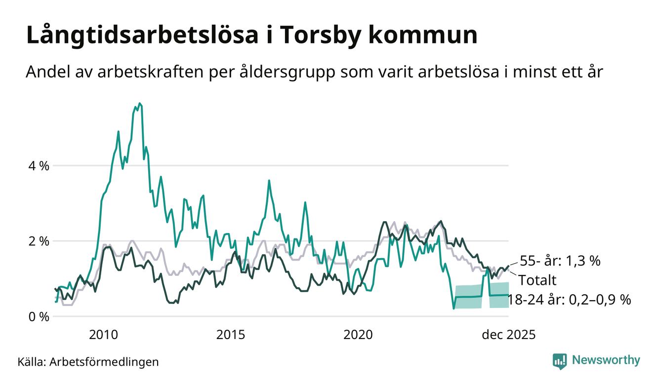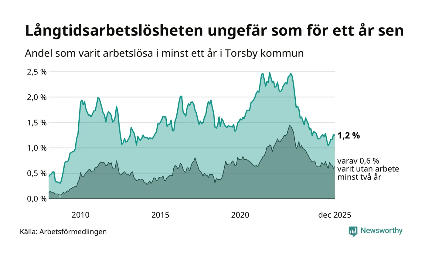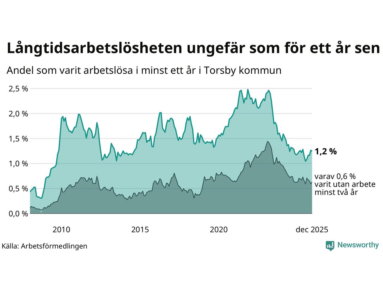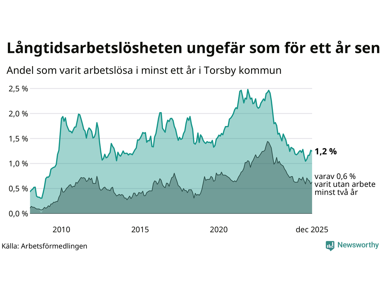 I december hade 63 Torsbybor varit arbetslösa i minst ett år, vilket är en färre än månaden innan. Det är den första månaden sedan juli 2025 som antalet arbetslösa minskar. 63 personer motsvarar 1,2 procent av arbetskraften i kommunen – andelen långtidsarbetslösa är ungefär på samma nivå som för ett år sedan.