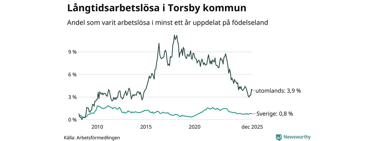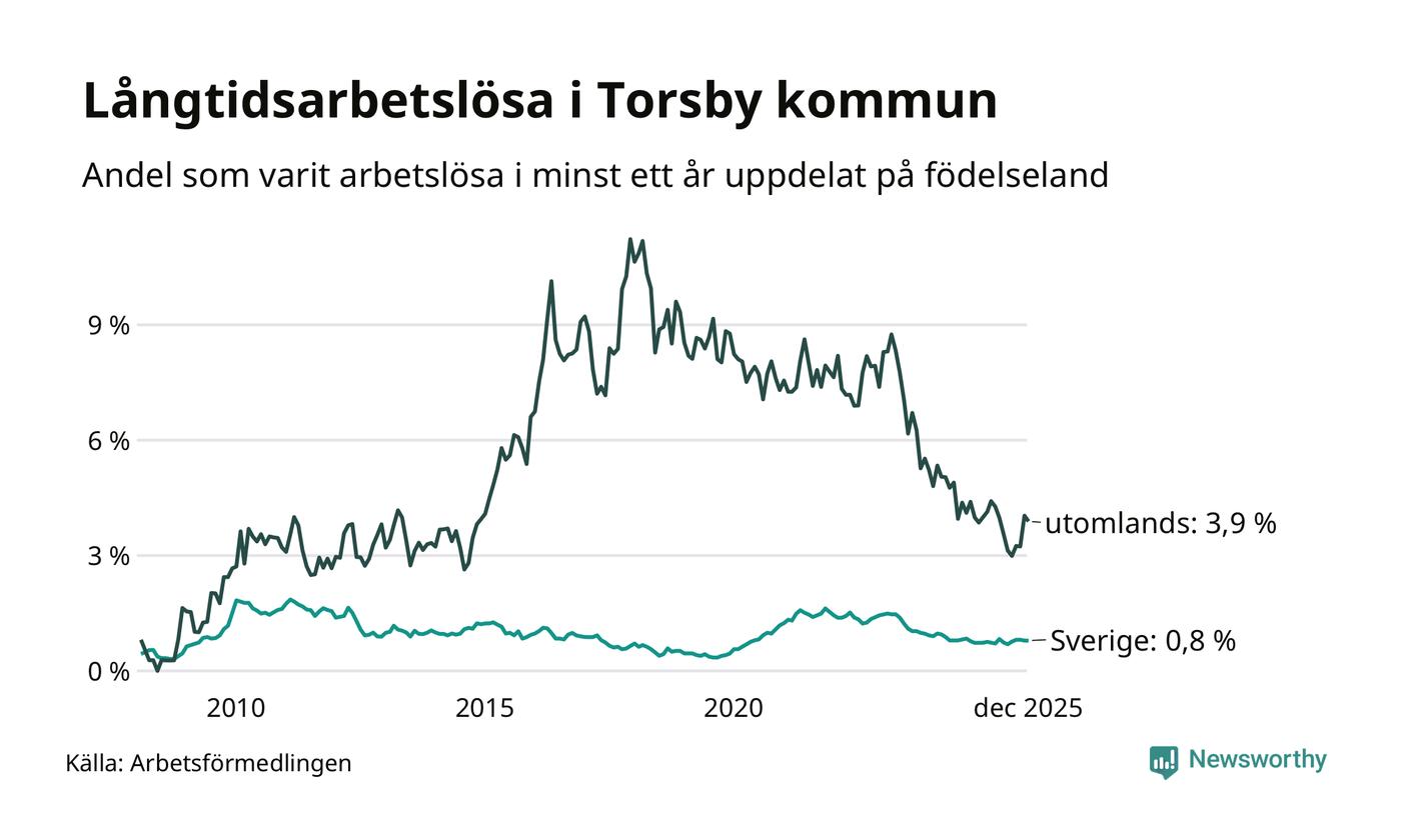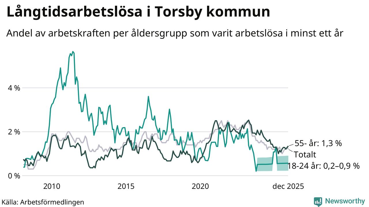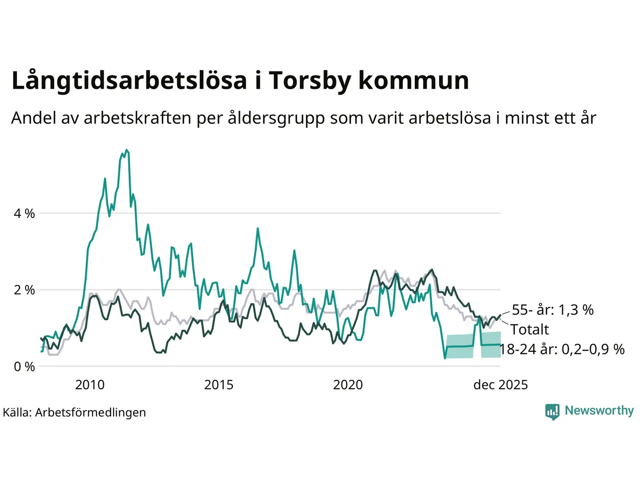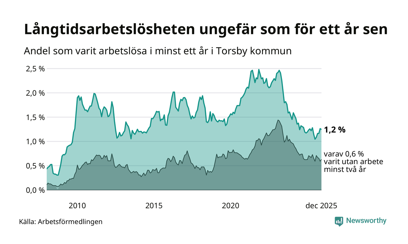 I december hade 63 Torsbybor varit arbetslösa i minst ett år, vilket är en färre än månaden innan. Det är den första månaden sedan juli 2025 som antalet arbetslösa minskar. 63 personer motsvarar 1,2 procent av arbetskraften i kommunen – andelen långtidsarbetslösa är ungefär på samma nivå som för ett år sedan.