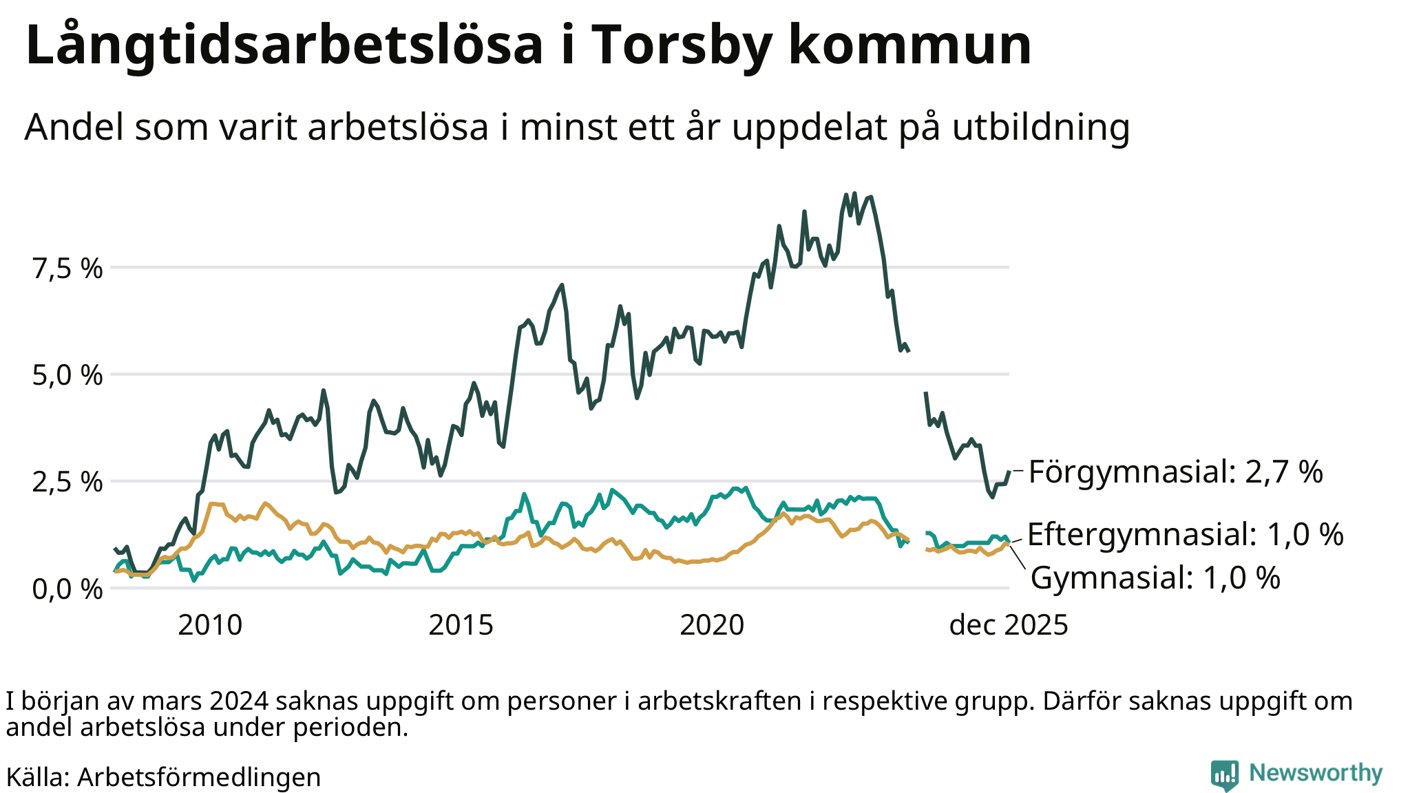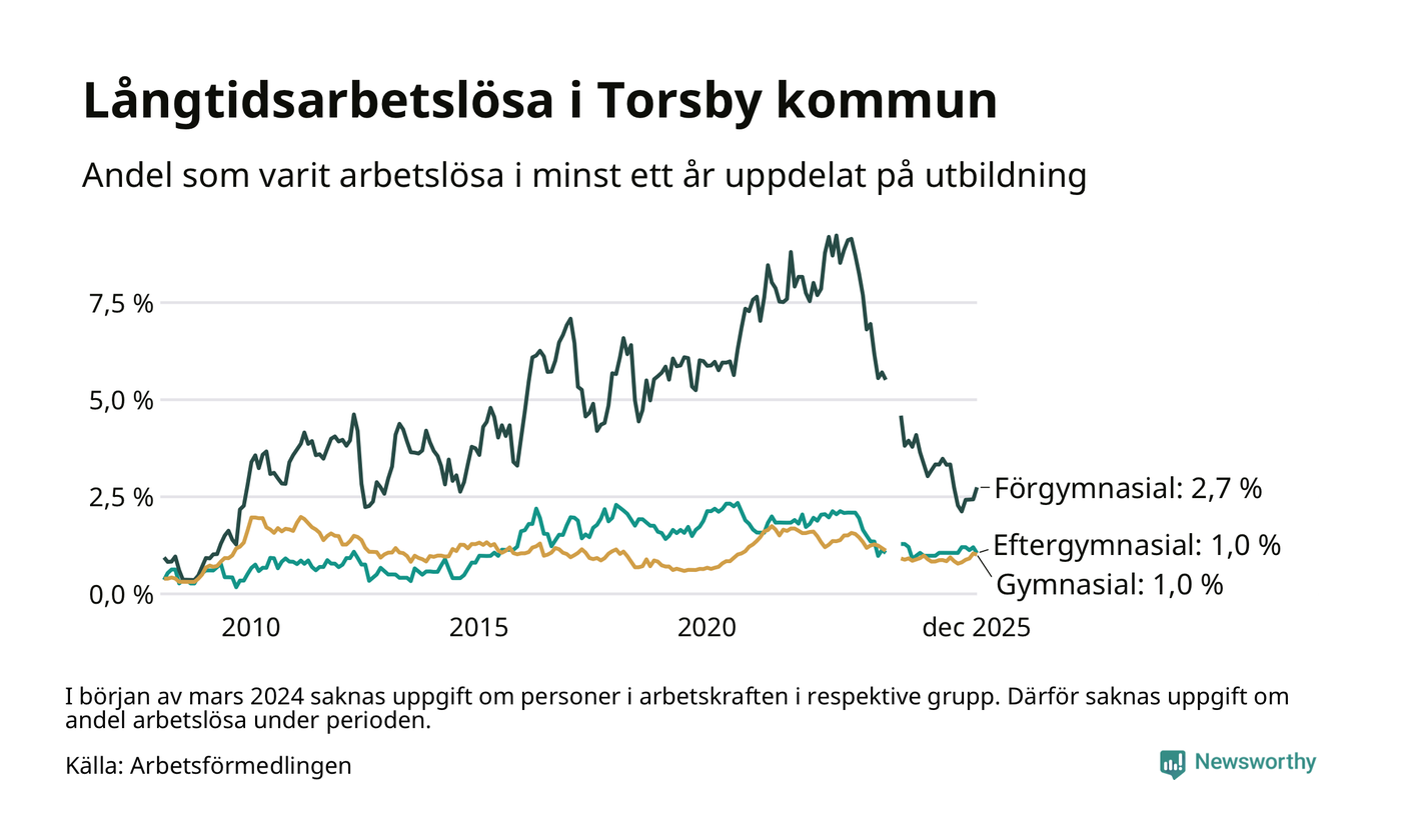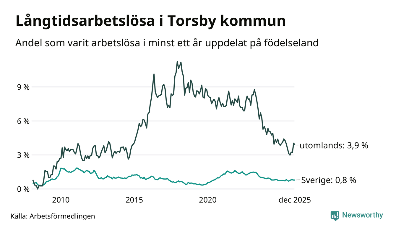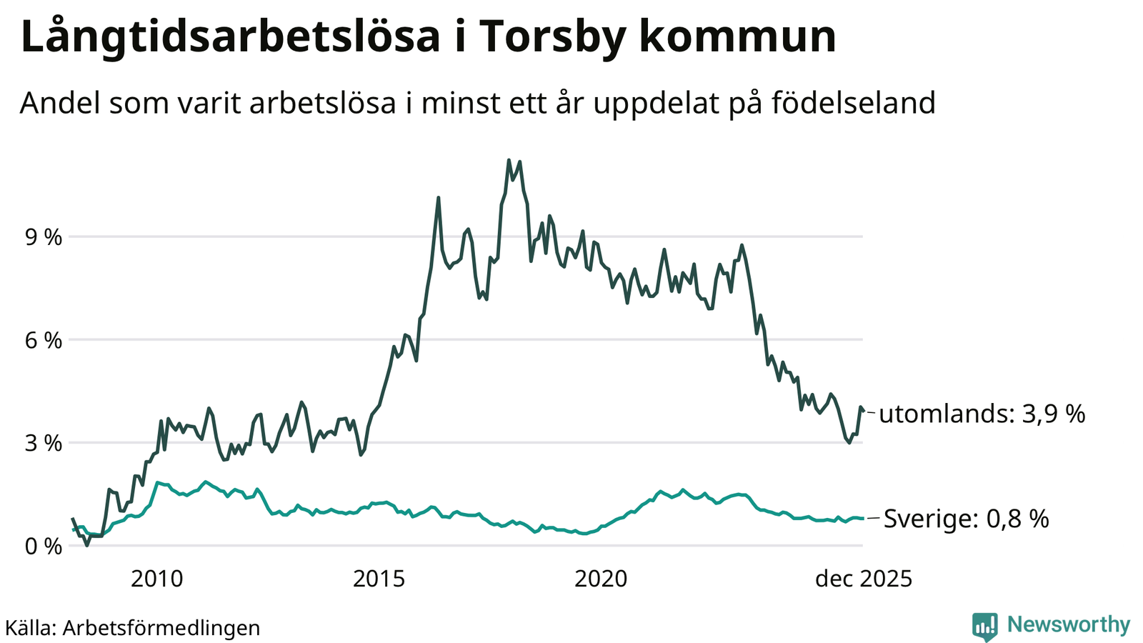 I december hade 63 Torsbybor varit arbetslösa i minst ett år, vilket är en färre än månaden innan. Det är den första månaden sedan juli 2025 som antalet arbetslösa minskar. 63 personer motsvarar 1,2 procent av arbetskraften i kommunen – andelen långtidsarbetslösa är ungefär på samma nivå som för ett år sedan.