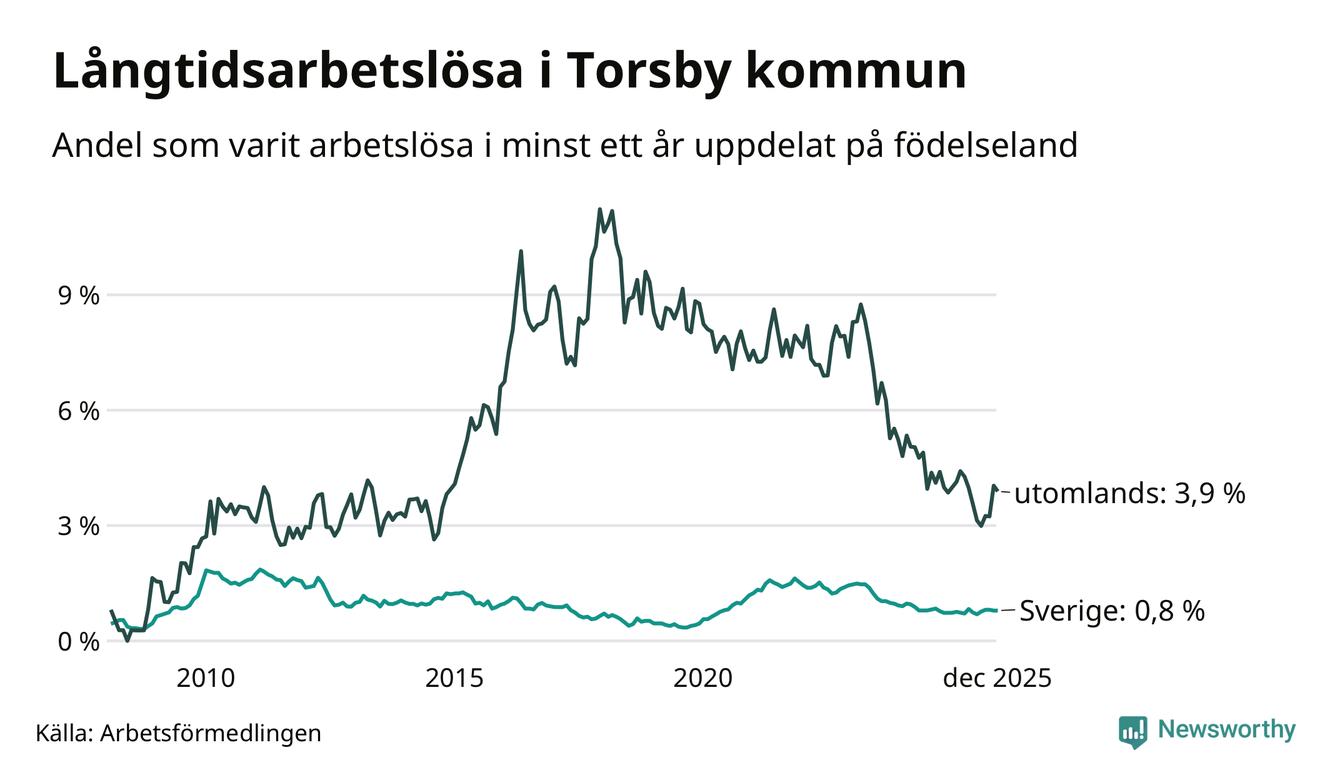 34 av de långtidsarbetslösa i Torsby är födda i Sverige, medan 29 är födda utomlands. Det innebär att långtidsarbetslösheten bland Sverigefödda är 0,8 procent, medan den är fem gånger så hög – 3,9 procent – bland födda utomlands. Även i riket som helhet är arbetslösheten högre bland utrikesfödda.