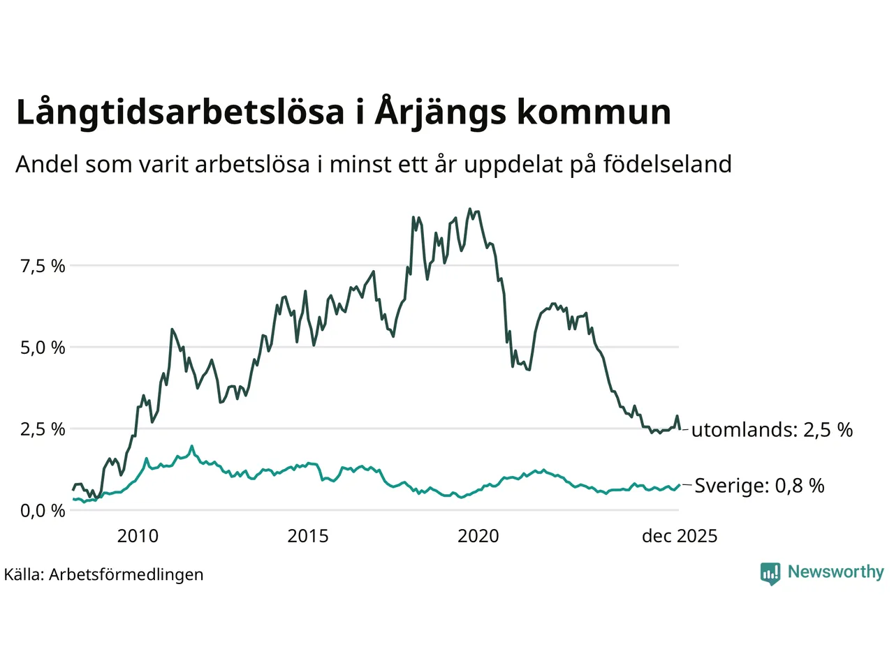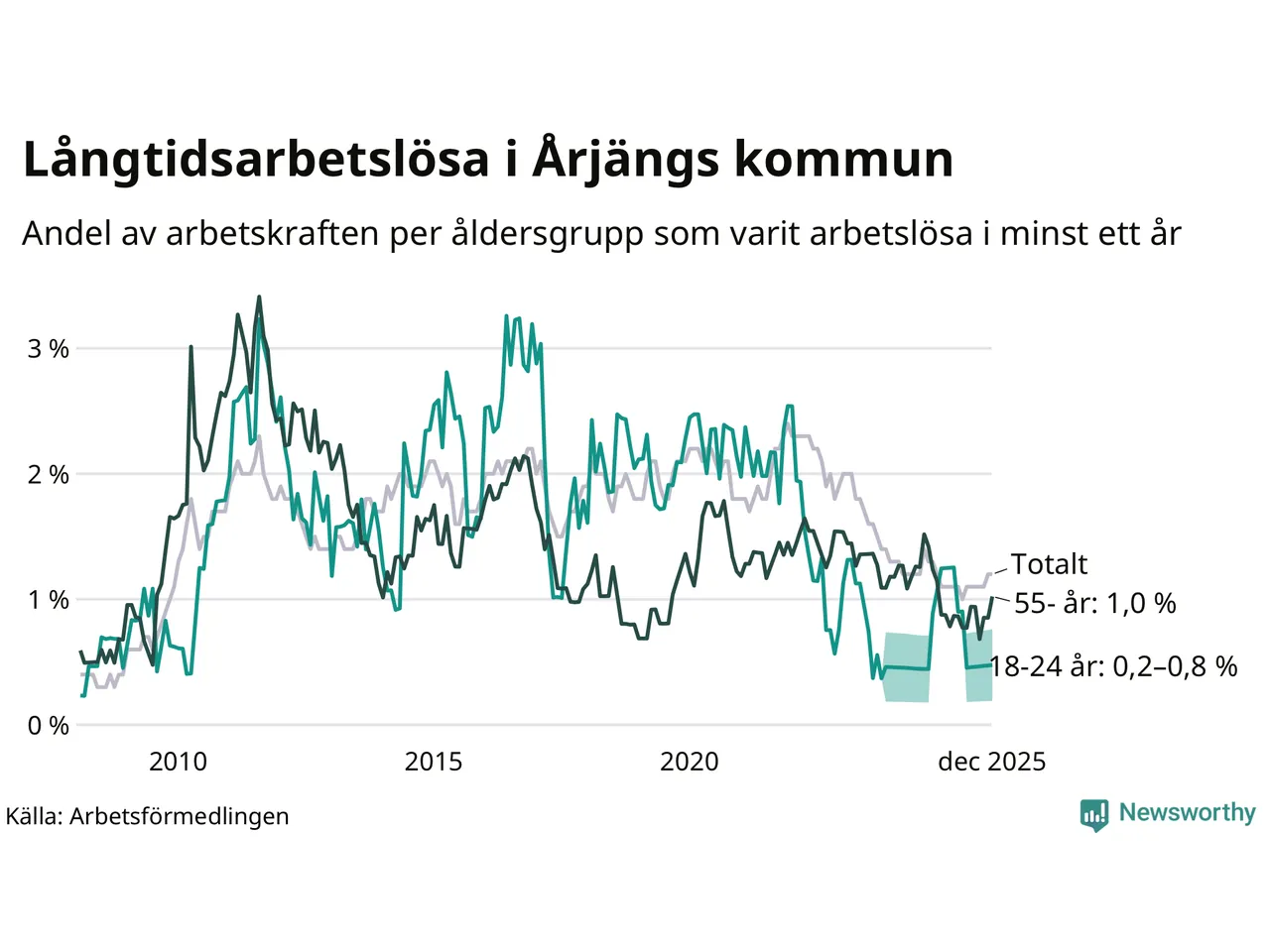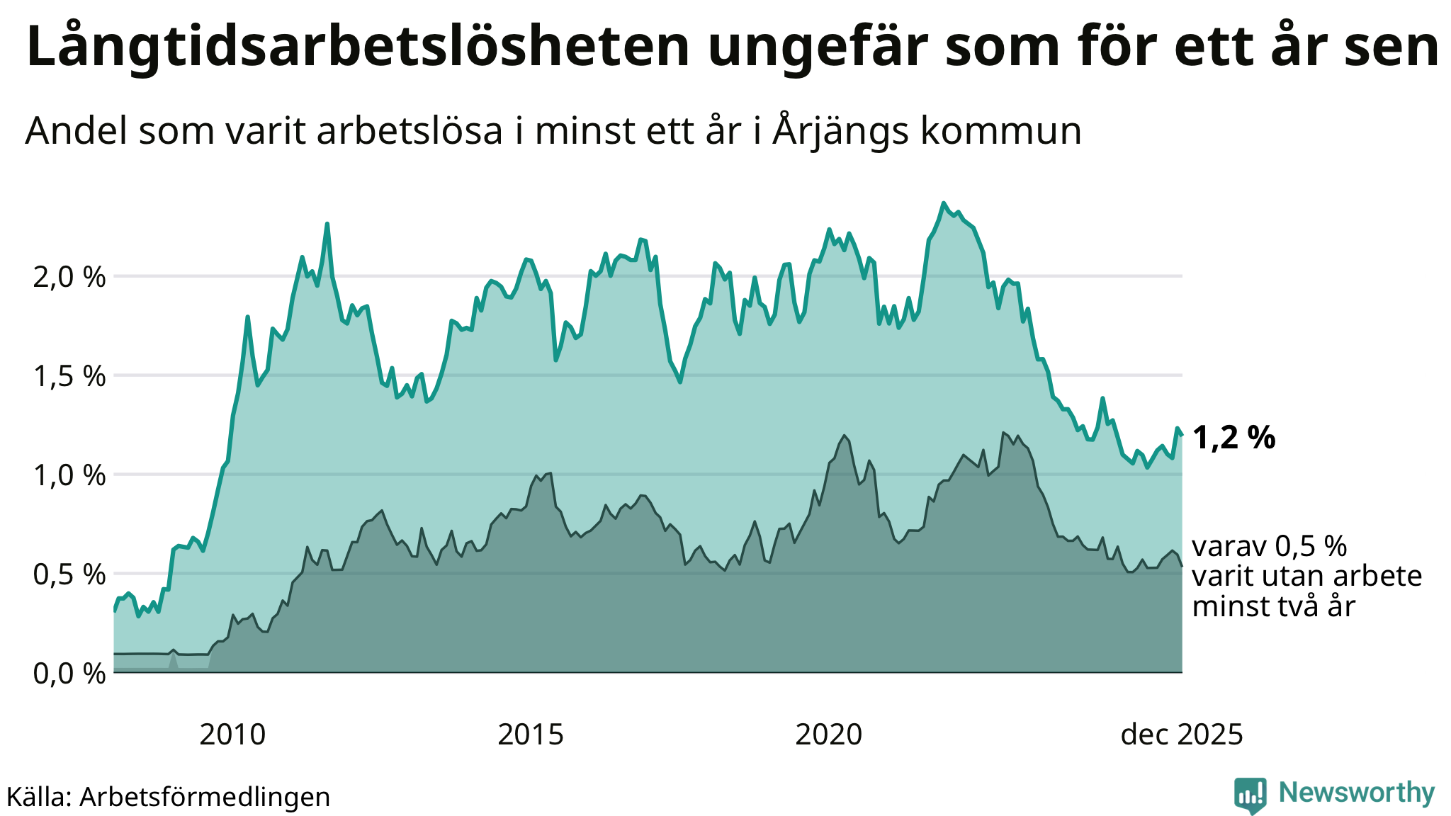 | Andel arbetslösa i minst två år | 0,5 % | 1,3 % | 1,5 % |