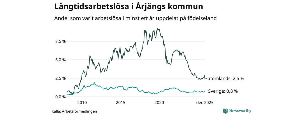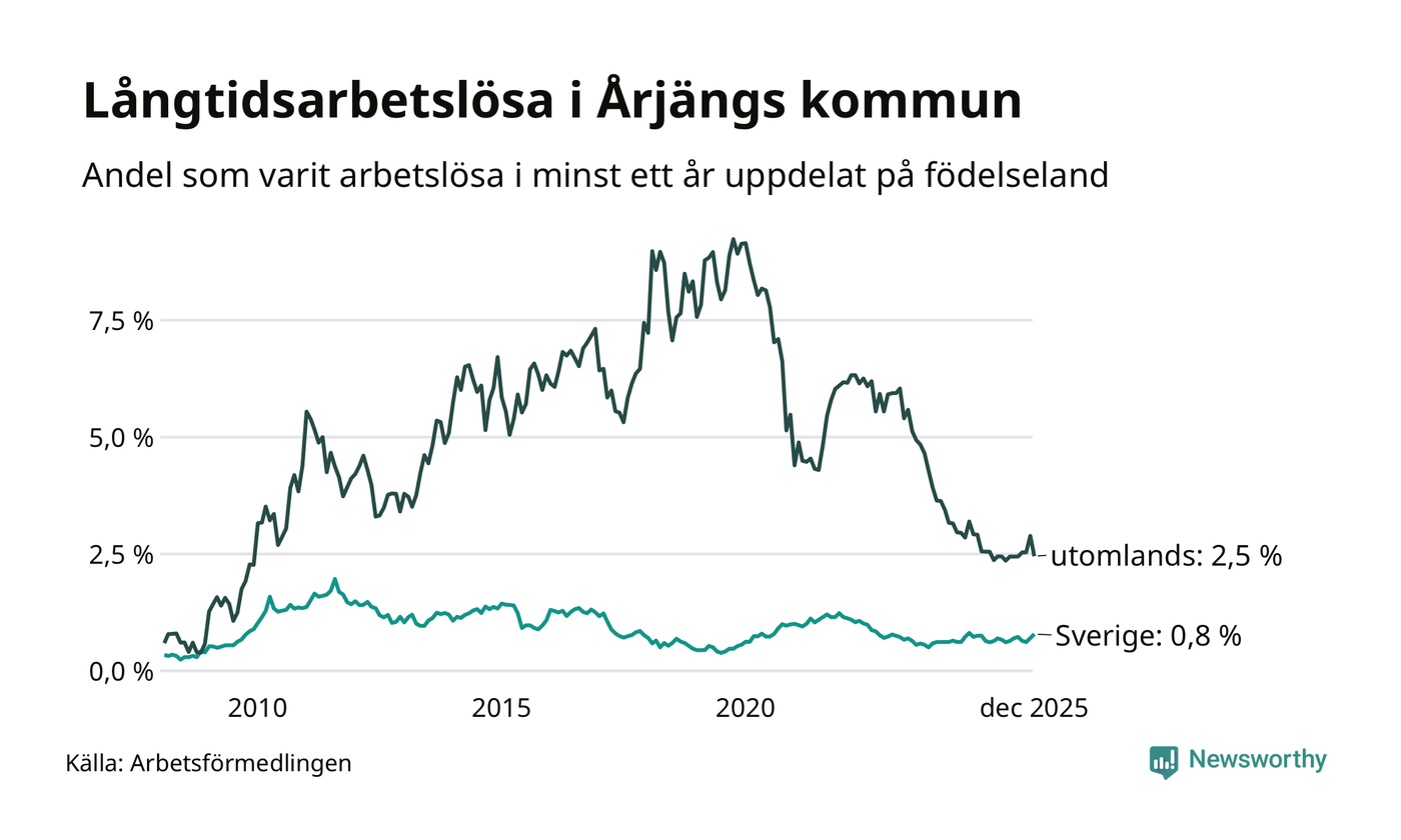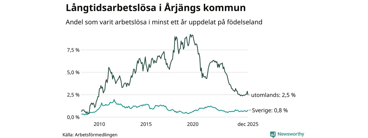 28 av de långtidsarbetslösa i Årjäng är födda i Sverige, medan 28 är födda utomlands. Det innebär att långtidsarbetslösheten bland Sverigefödda är 0,8 procent, medan den är tre gånger så hög – 2,5 procent – bland födda utomlands. Även i riket som helhet är arbetslösheten högre bland utrikesfödda.
