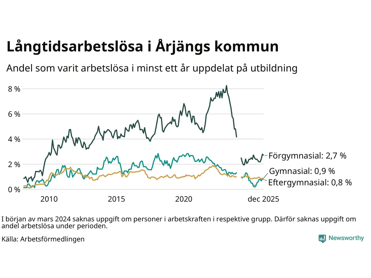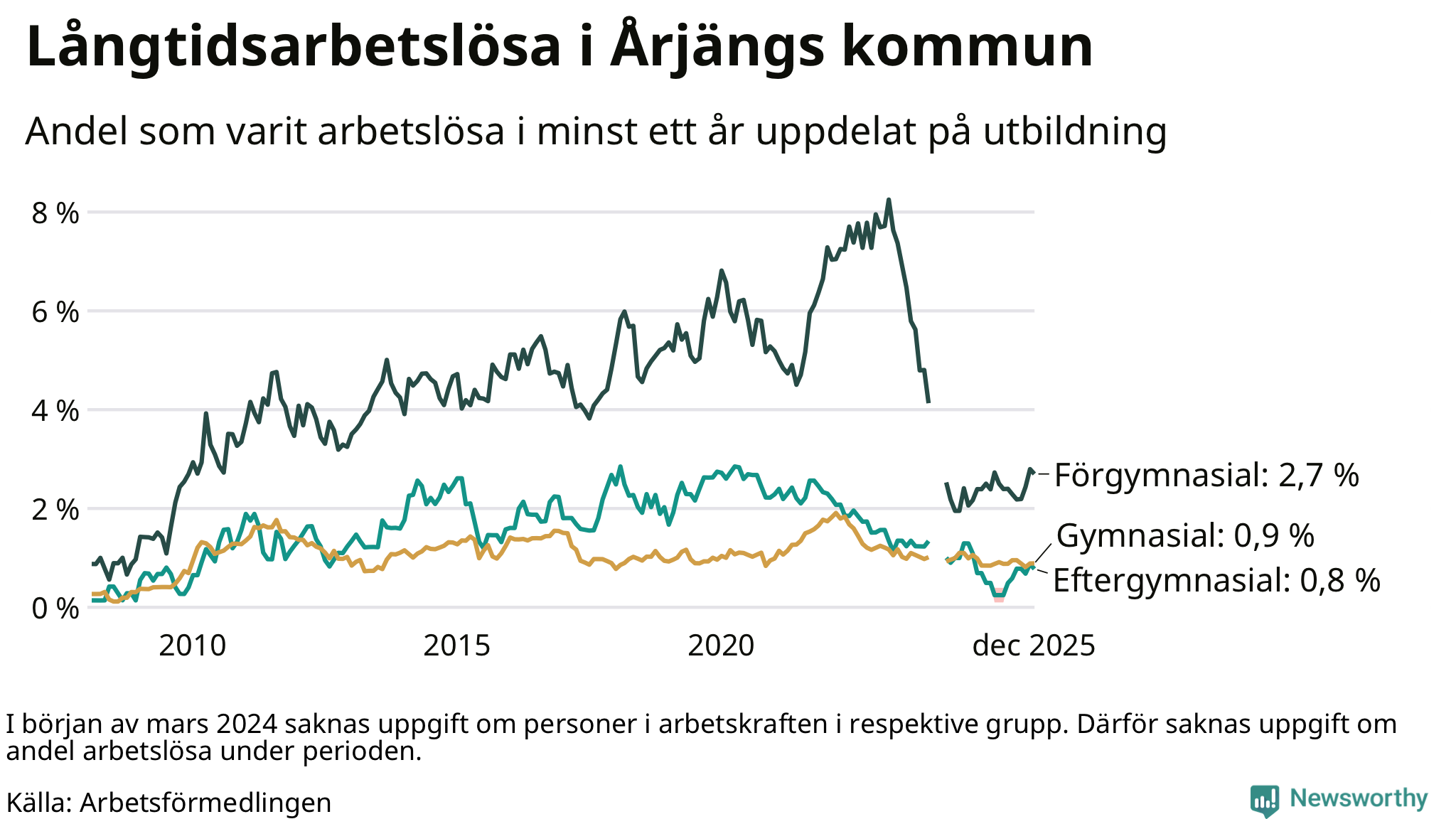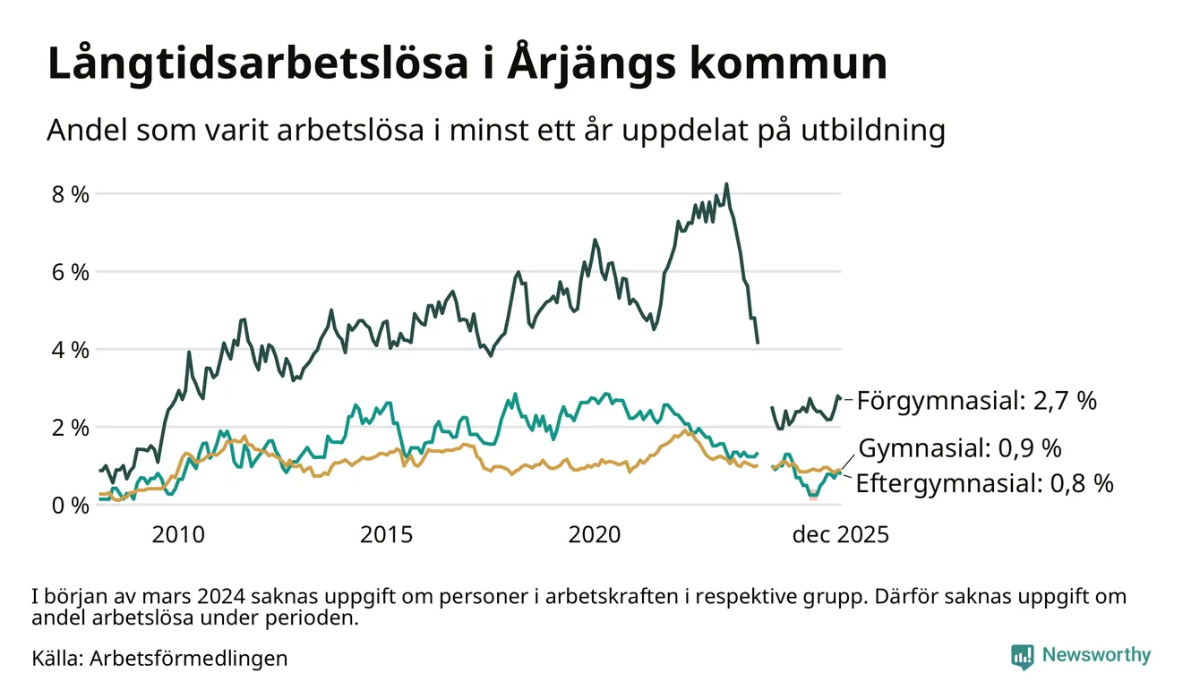 | Andel arbetslösa i minst ett år | 1,2 % | 2,4 % | 2,9 % |