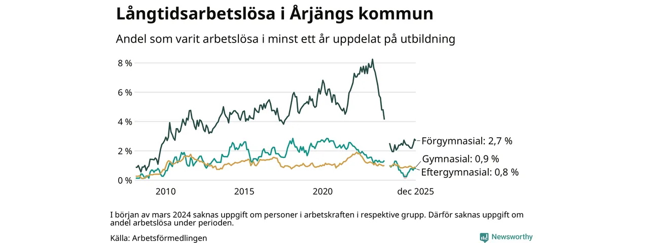 I december hade 56 Årjängsbor varit arbetslösa i minst ett år, vilket är två färre än månaden innan. 56 personer motsvarar 1,2 procent av arbetskraften i kommunen – andelen långtidsarbetslösa är ungefär på samma nivå som för ett år sedan.