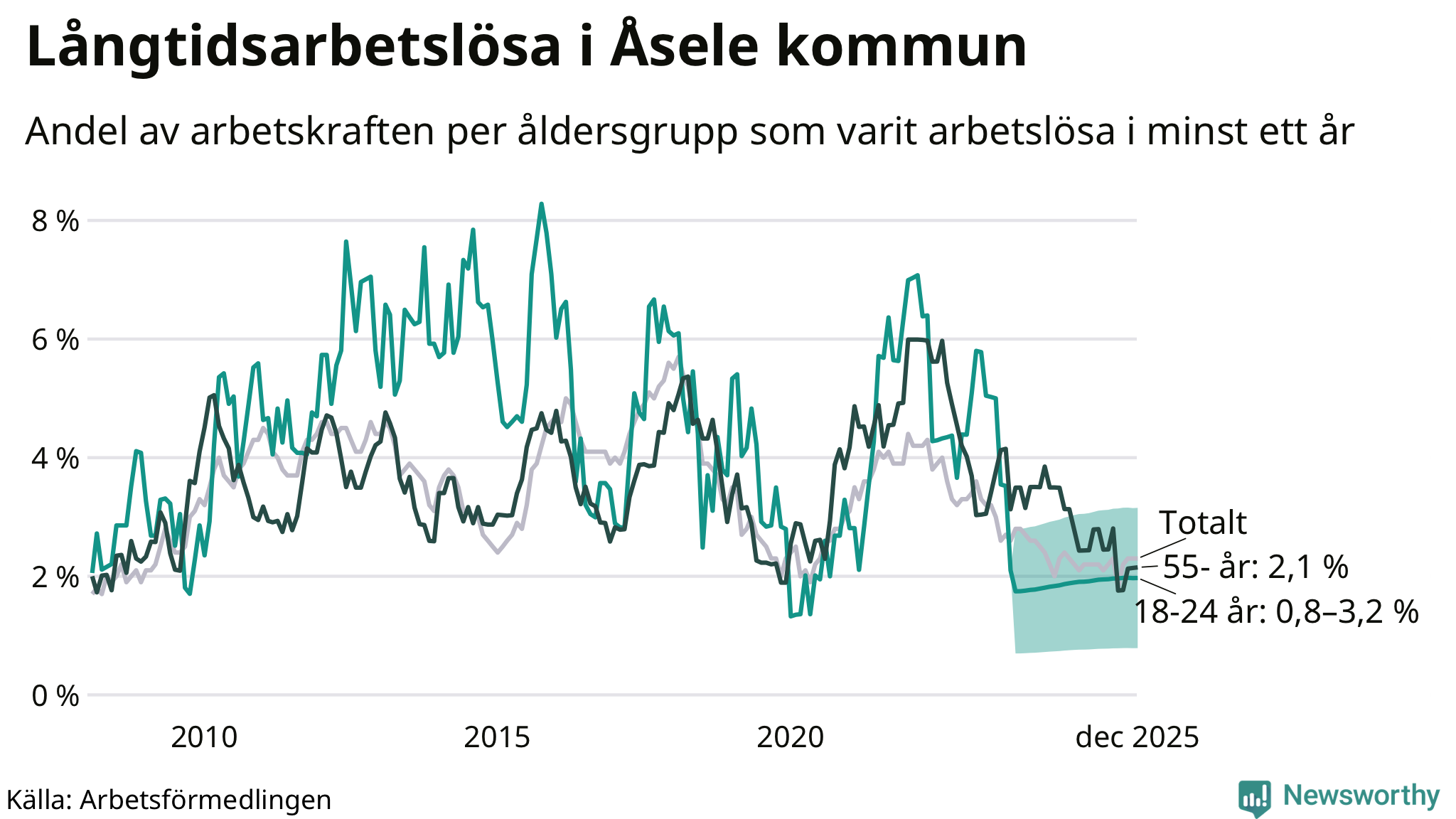 I december hade 27 Åselebor varit arbetslösa i minst ett år, vilket är en fler än månaden innan. Det är den fjärde månaden i rad med ökande antal långtidsarbetslösa. 27 personer motsvarar 2,3 procent av arbetskraften i kommunen – andelen långtidsarbetslösa är ungefär på samma nivå som för ett år sedan.