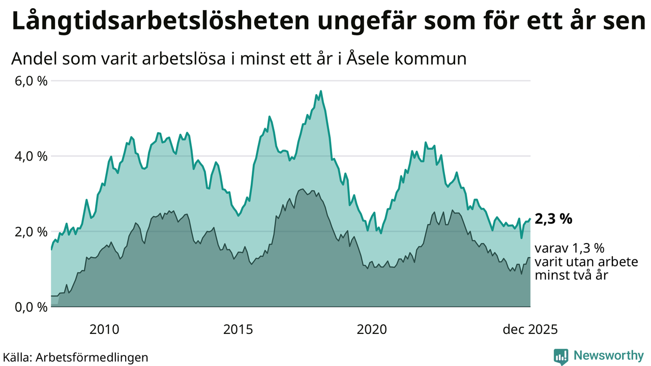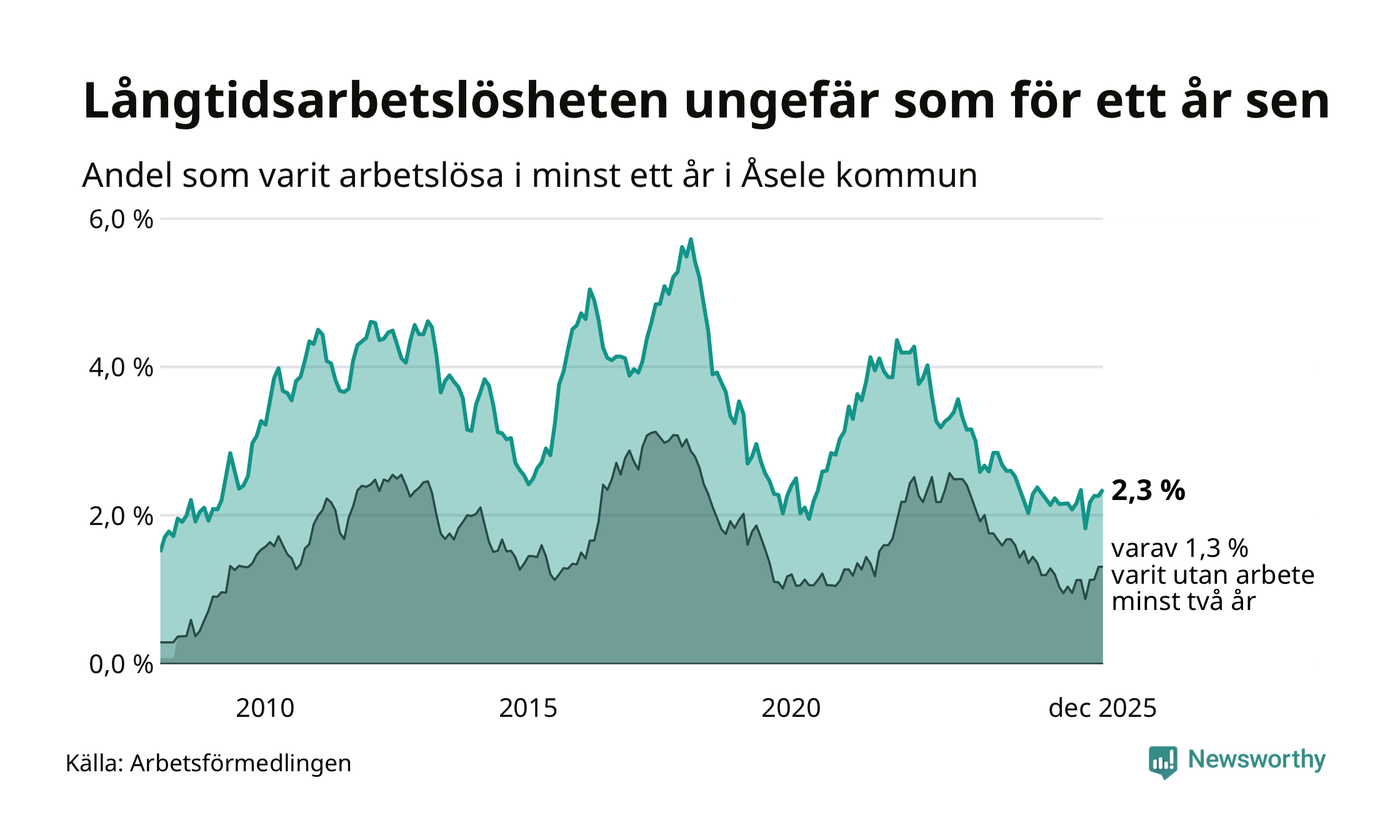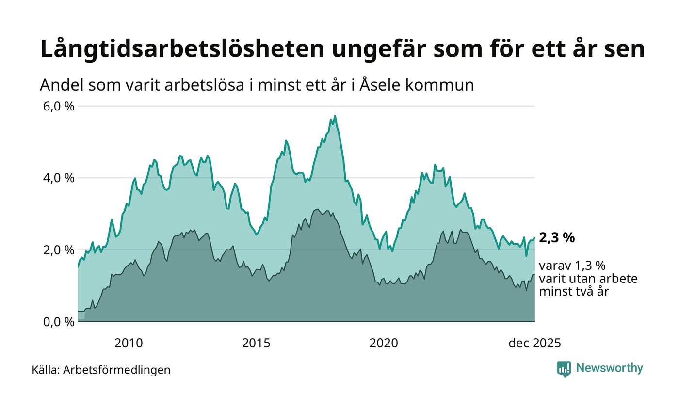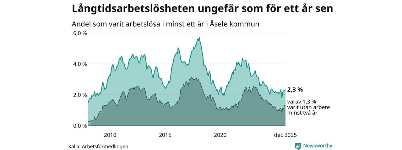 Andelen långtidsarbetslösa i Åsele är den högsta i Västerbottens län. I Vindeln och Sorsele finns länets lägsta långtidsarbetslöshet, 0,7 procent. I Västerbotten som helhet hade 1 858 personer (1,3 procent) varit arbetslösa i minst ett år i december. Det är tolv personer fler än månaden innan.