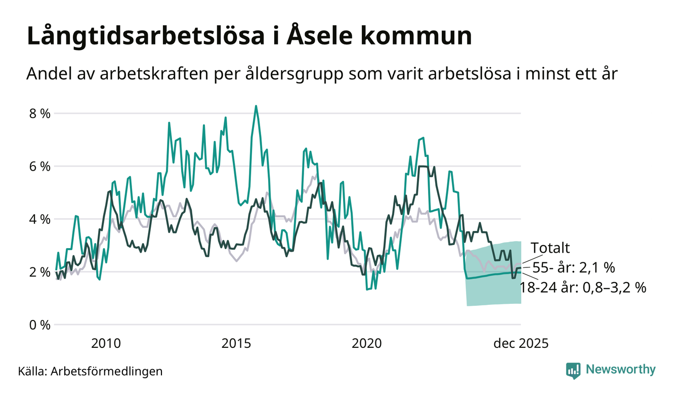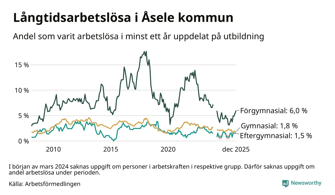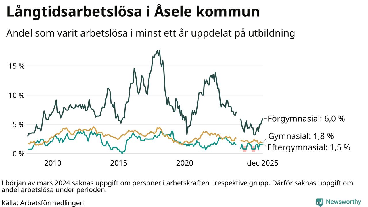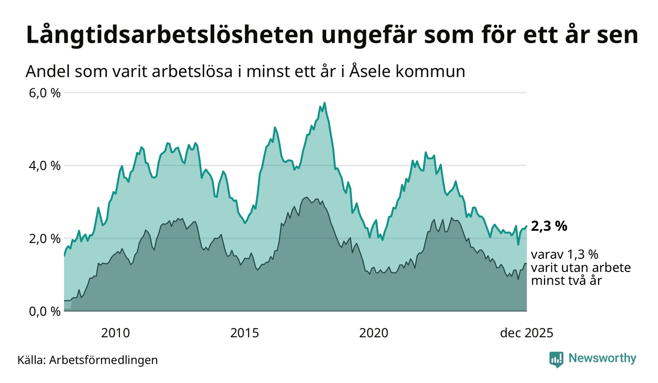 Andelen långtidsarbetslösa i Åsele är den högsta i Västerbottens län. I Vindeln och Sorsele finns länets lägsta långtidsarbetslöshet, 0,7 procent. I Västerbotten som helhet hade 1 858 personer (1,3 procent) varit arbetslösa i minst ett år i december. Det är tolv personer fler än månaden innan.