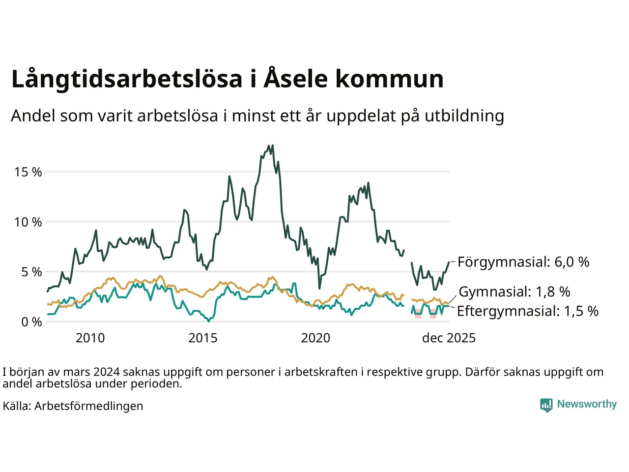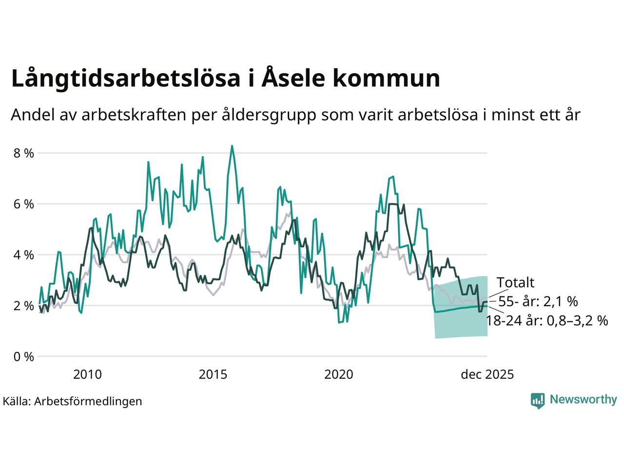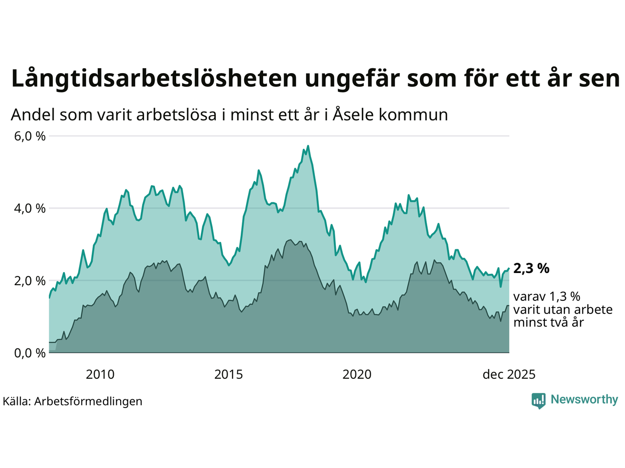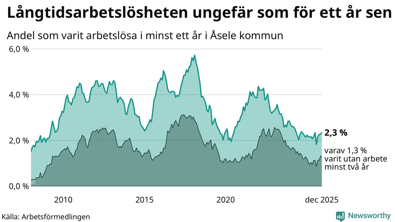 Andelen som varit utan arbete i minst ett år i Åsele var ungefär lika stor i december jämfört med samma månad för ett år sedan. Det visar Arbetsfömedlingens senaste månadsstatistik.