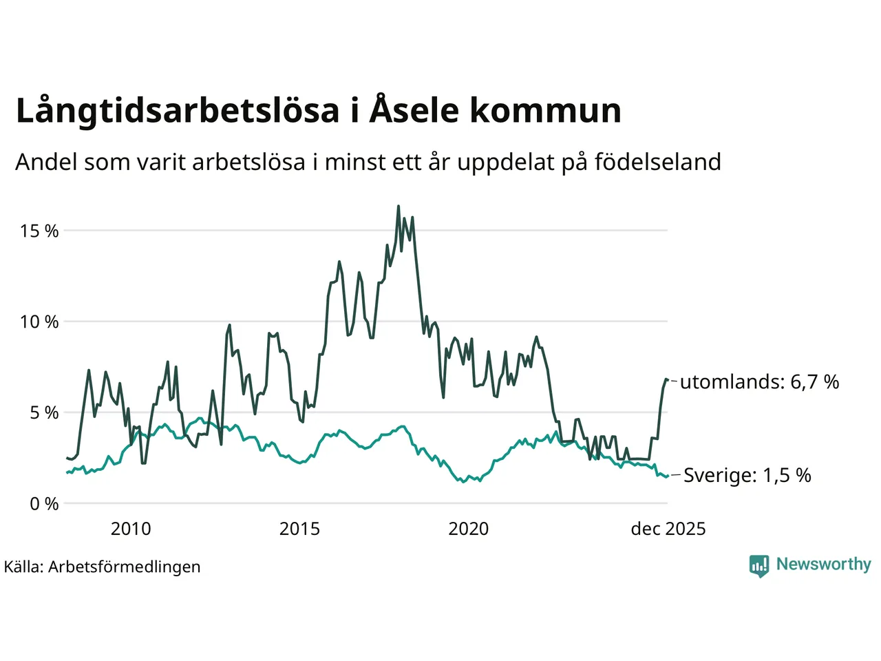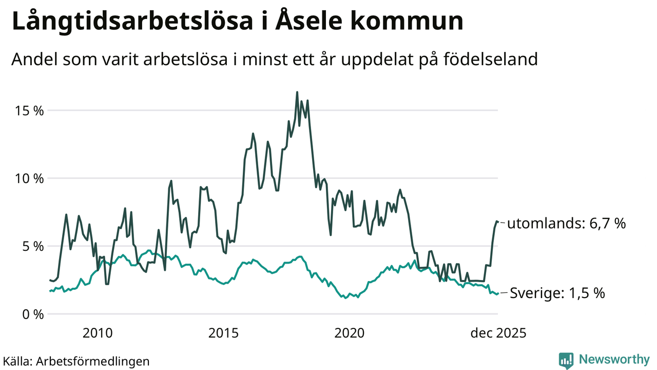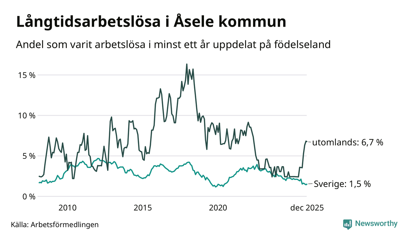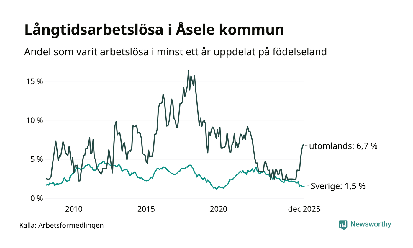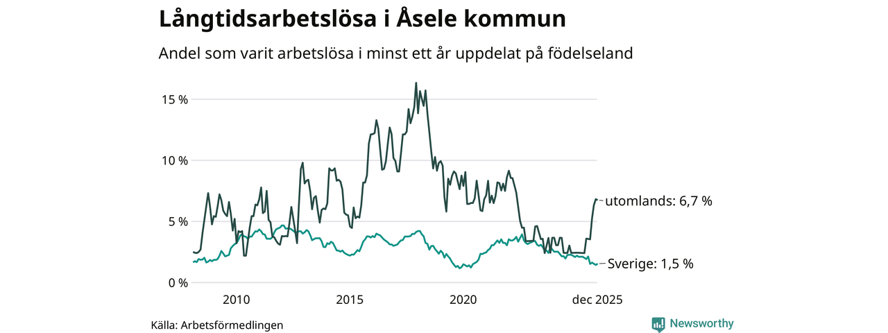 15 av de långtidsarbetslösa i Åsele är födda i Sverige, medan tolv är födda utomlands. Det innebär att långtidsarbetslösheten bland Sverigefödda är 1,5 procent, medan den är fyra gånger så hög – 6,7 procent – bland födda utomlands. Även i riket som helhet är arbetslösheten högre bland utrikesfödda.