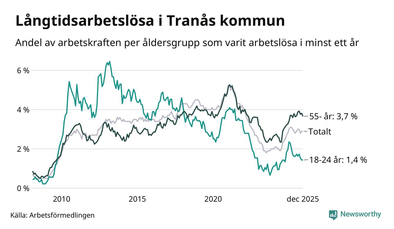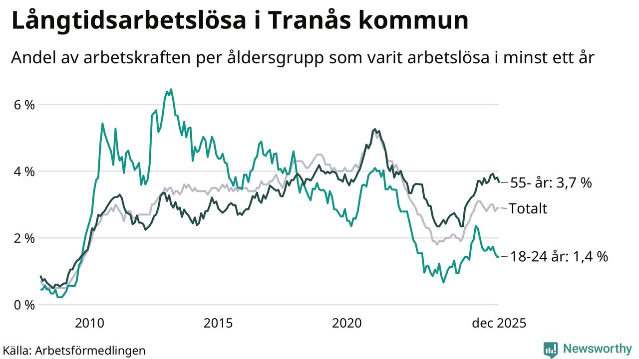 Av de 252 personerna som varit arbetslösa i mer än ett år i Tranås kommun är 74 personer mellan 55 och 651 år och 14 är mellan 18 och 24 år. För den äldre gruppen är andelen arbetslösa 3,7 procent medan den i den yngre gruppen är 1,4 procent. Även i riket som helhet är långtidsarbetslösheten högre i gruppen äldre.