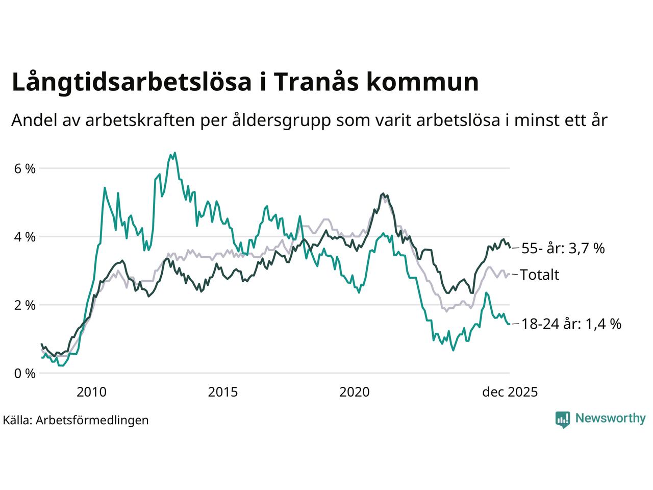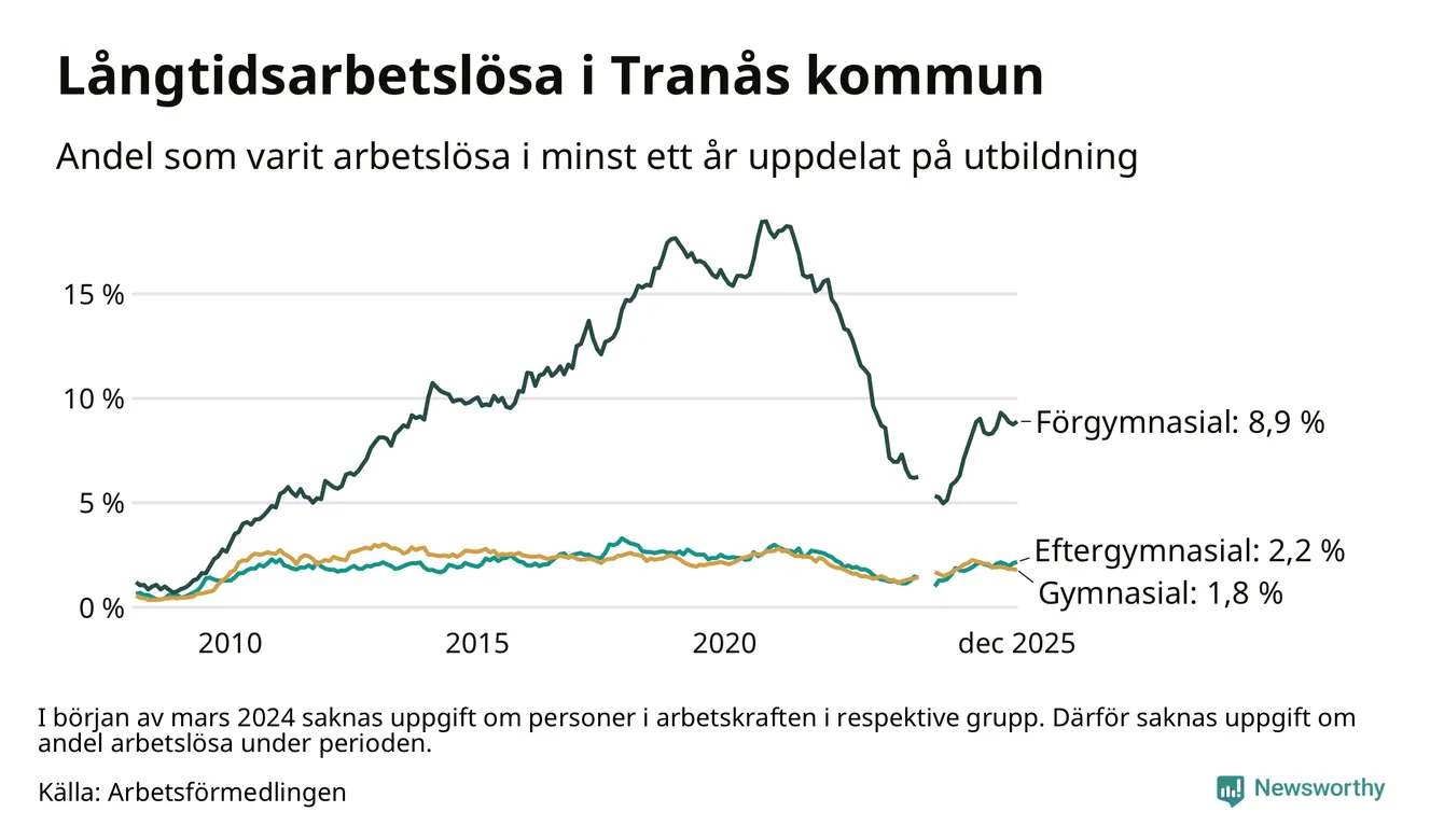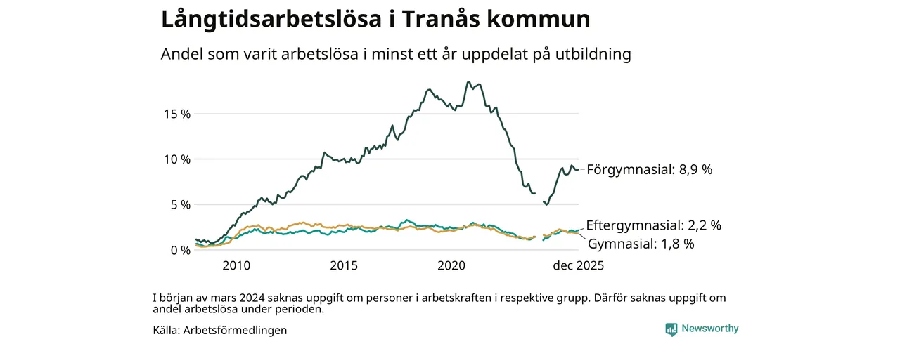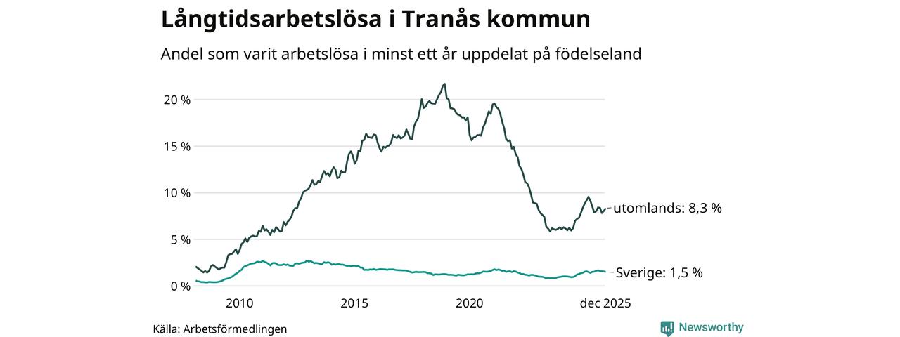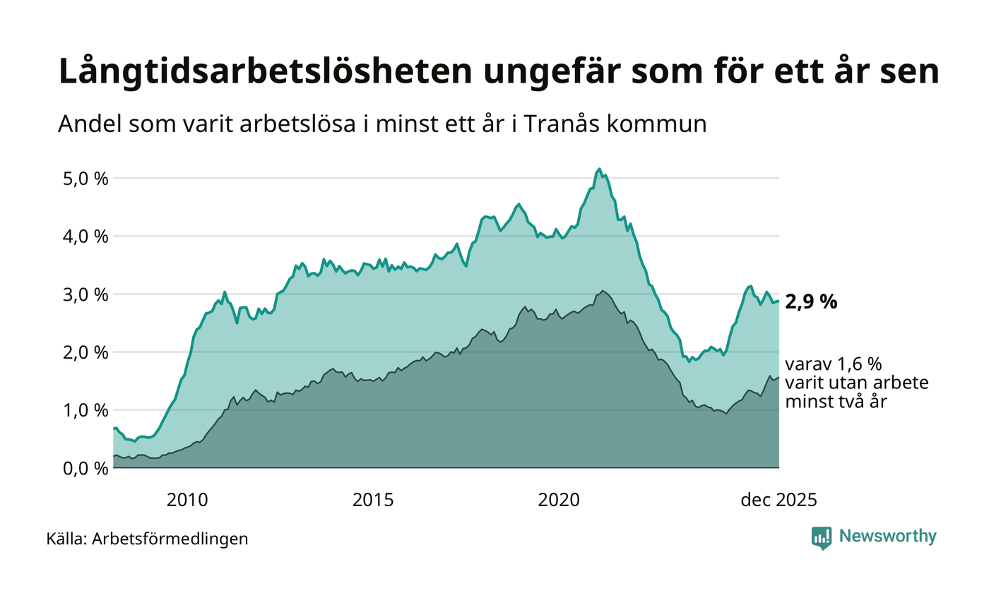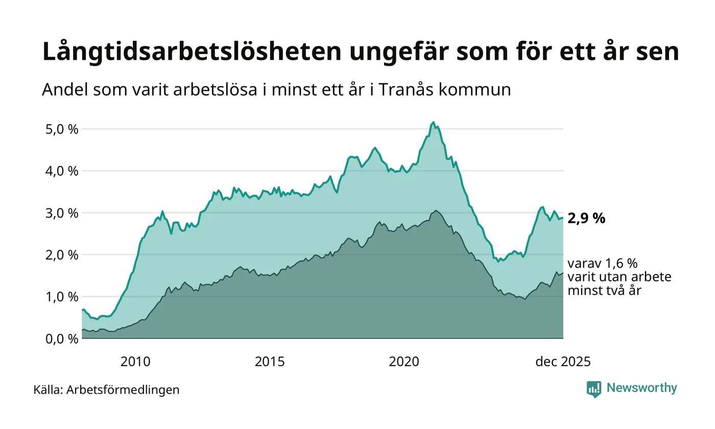 I december hade 252 Tranåsbor varit arbetslösa i minst ett år, vilket är en fler än månaden innan. 252 personer motsvarar 2,9 procent av arbetskraften i kommunen – andelen långtidsarbetslösa är ungefär på samma nivå som för ett år sedan.