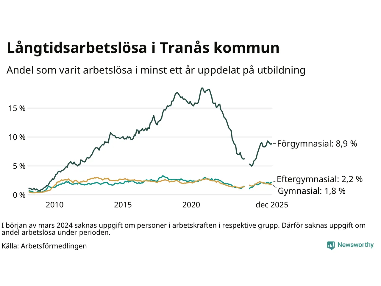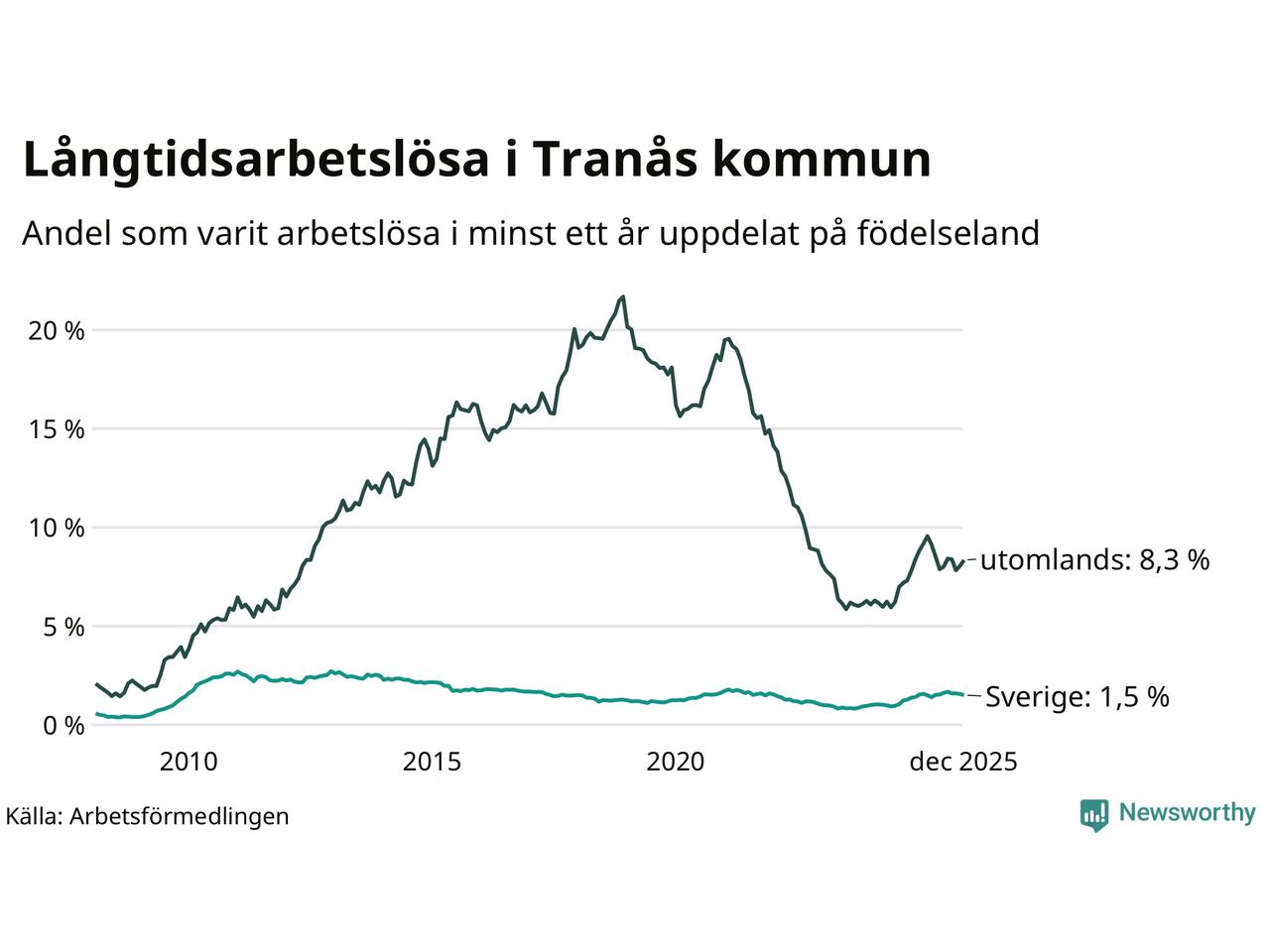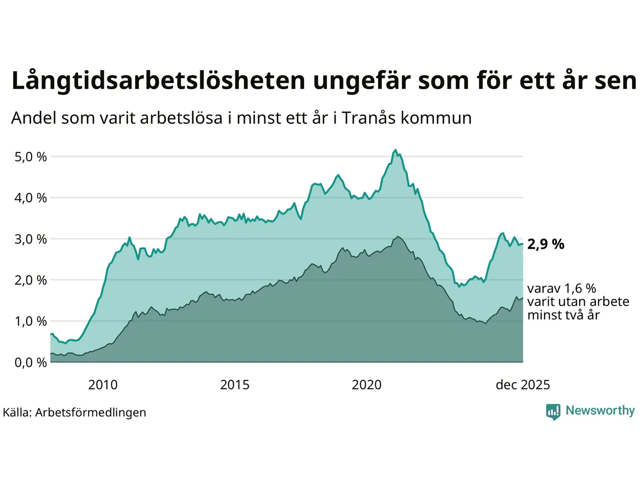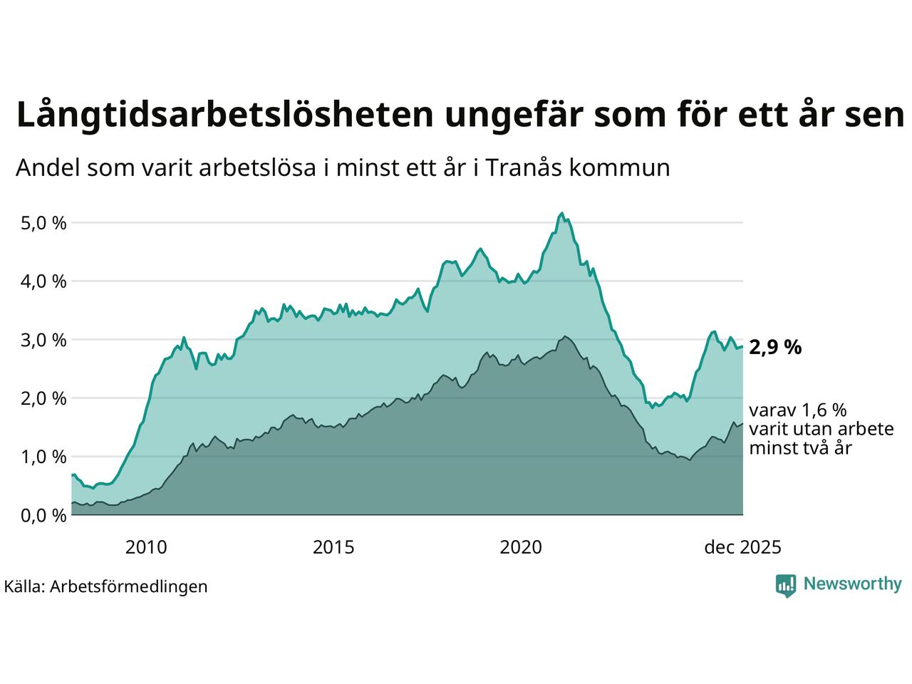 I december hade 252 Tranåsbor varit arbetslösa i minst ett år, vilket är en fler än månaden innan. 252 personer motsvarar 2,9 procent av arbetskraften i kommunen – andelen långtidsarbetslösa är ungefär på samma nivå som för ett år sedan.