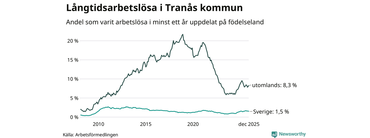 105 av de långtidsarbetslösa i Tranås är födda i Sverige, medan 147 är födda utomlands. Det innebär att långtidsarbetslösheten bland Sverigefödda är 1,5 procent, medan den är sex gånger så hög – 8,3 procent – bland födda utomlands. Även i riket som helhet är arbetslösheten högre bland utrikesfödda.