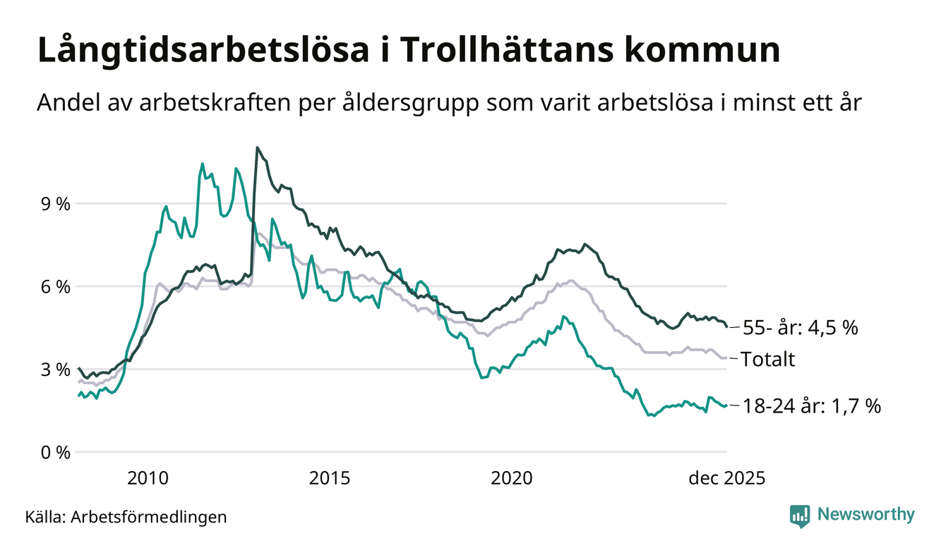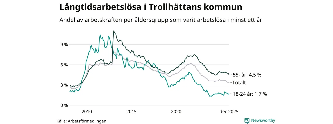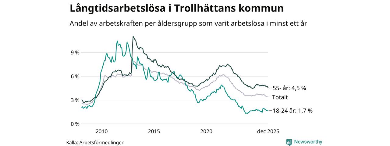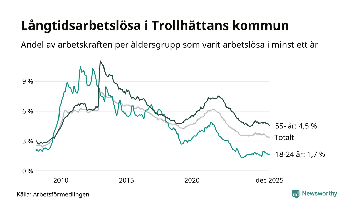 Av de 1 009 personerna som varit arbetslösa i mer än ett år i Trollhättans kommun är 285 personer mellan 55 och 651 år och 57 är mellan 18 och 24 år. För den äldre gruppen är andelen arbetslösa 4,5 procent medan den i den yngre gruppen är 1,7 procent. Även i riket som helhet är långtidsarbetslösheten högre i gruppen äldre.