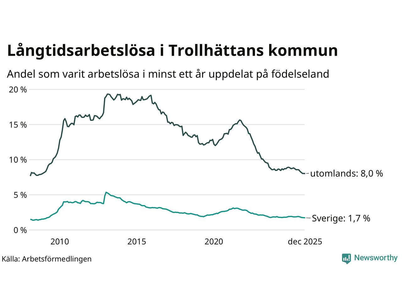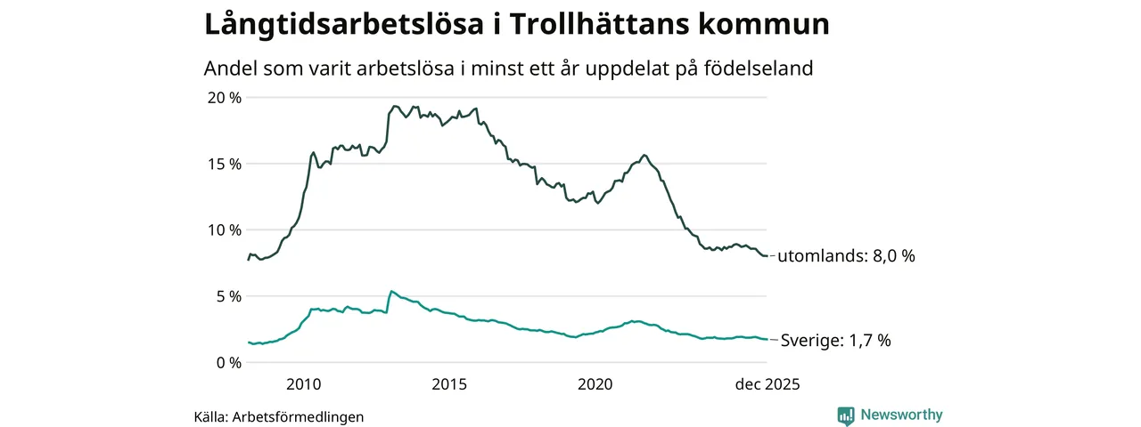 376 av de långtidsarbetslösa i Trollhättan är födda i Sverige, medan 633 är födda utomlands. Det innebär att långtidsarbetslösheten bland Sverigefödda är 1,7 procent, medan den är fem gånger så hög – 8,0 procent – bland födda utomlands. Även i riket som helhet är arbetslösheten högre bland utrikesfödda.