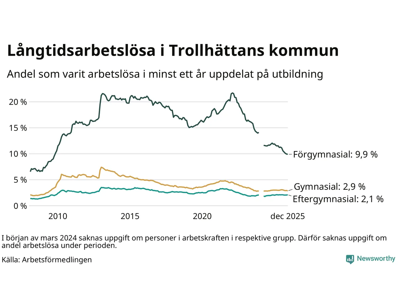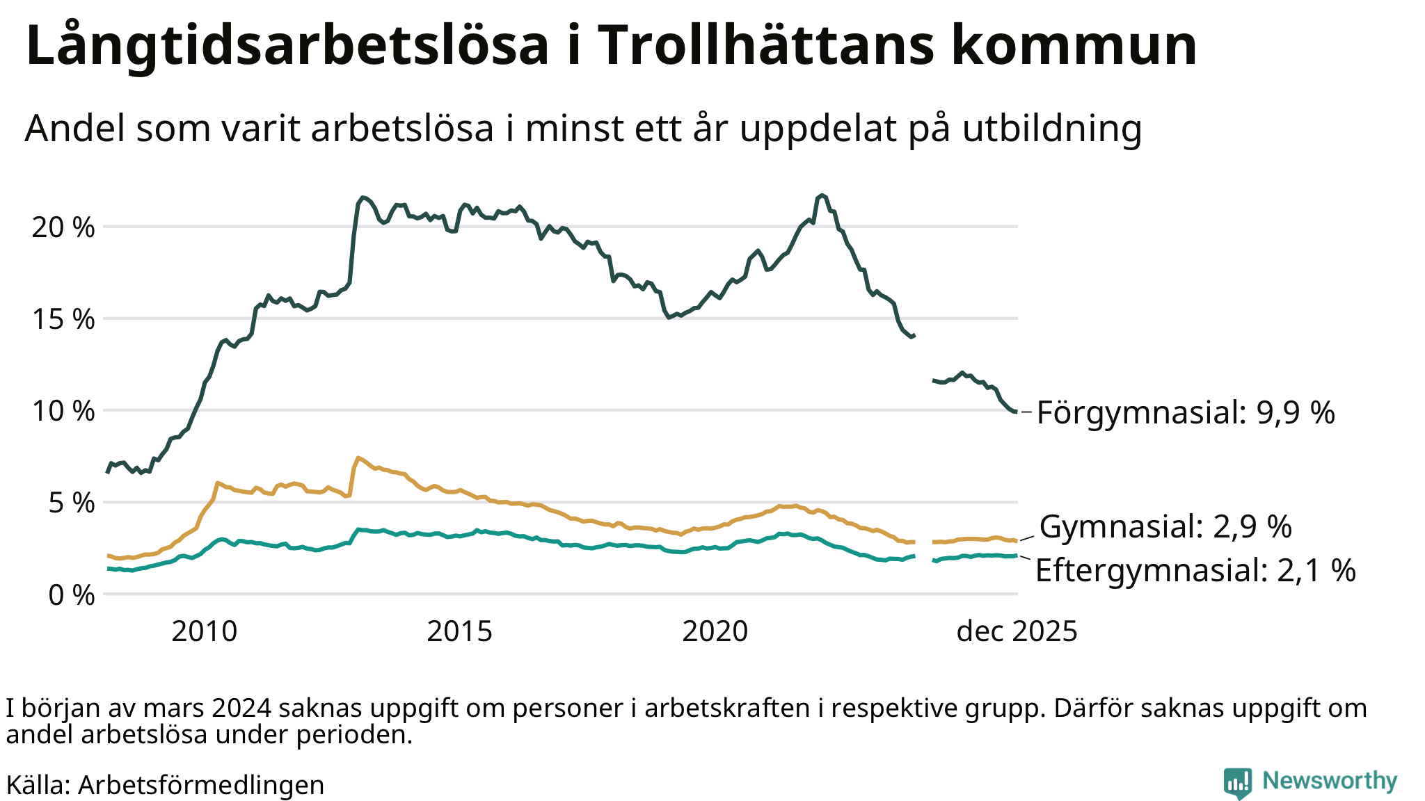| Andel arbetslösa i minst två år | 2,0 % | 1,3 % | 1,5 % |