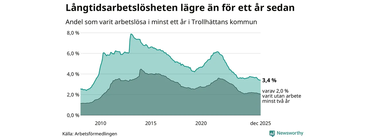 I december hade 1 009 Trollhättebor varit arbetslösa i minst ett år, vilket är fem färre än månaden innan. Det är den femte månaden i rad med minskande antal långtidsarbetslösa. 1 009 personer motsvarar 3,4 procent av arbetskraften i kommunen – andelen långtidsarbetslösa är 0,3 procentenheter lägre än samma månad för ett år sedan.