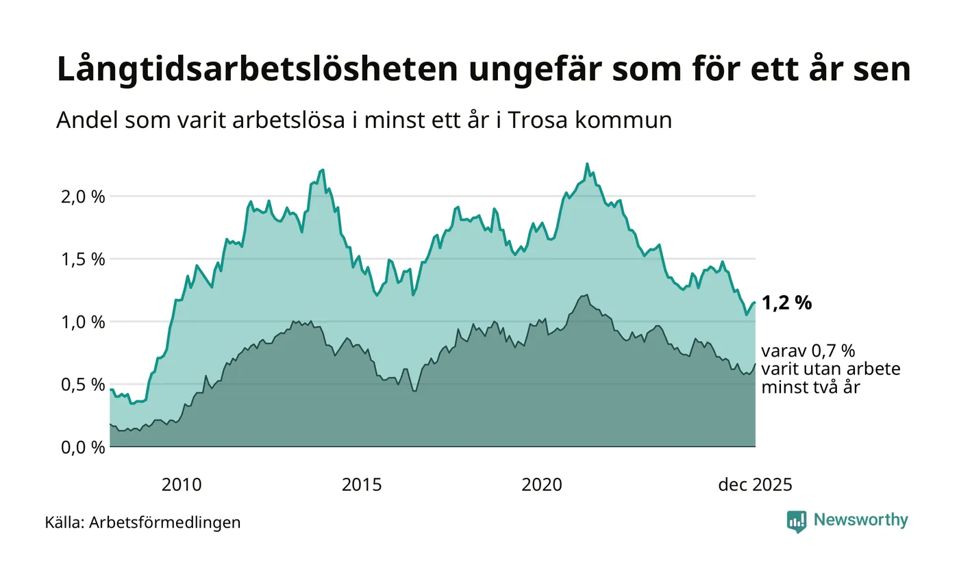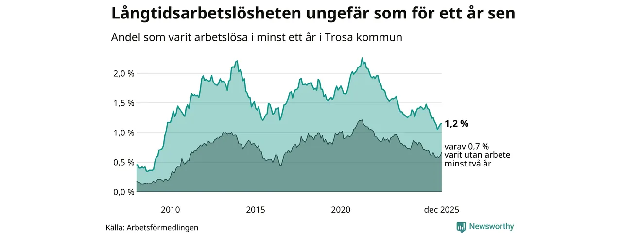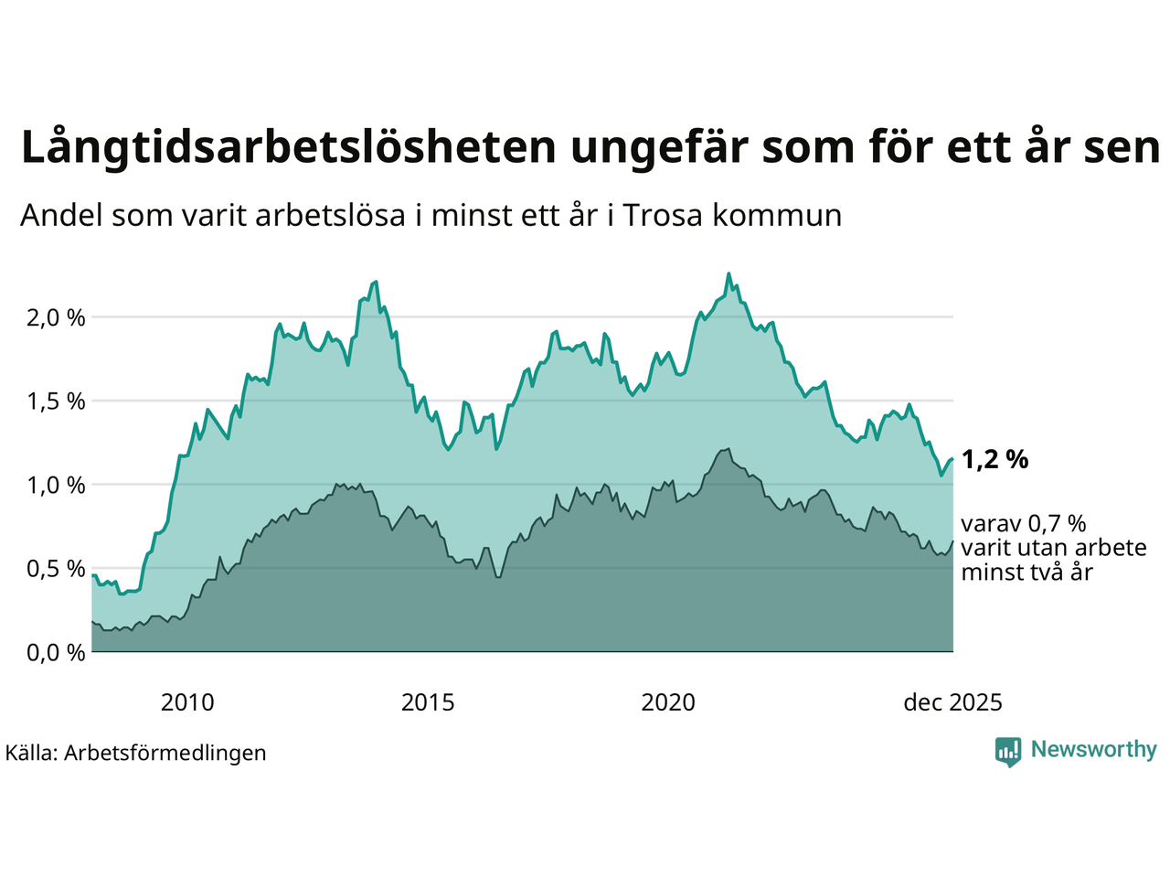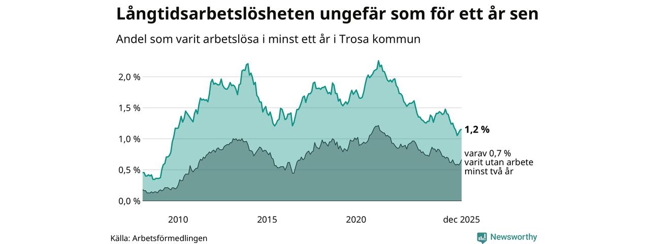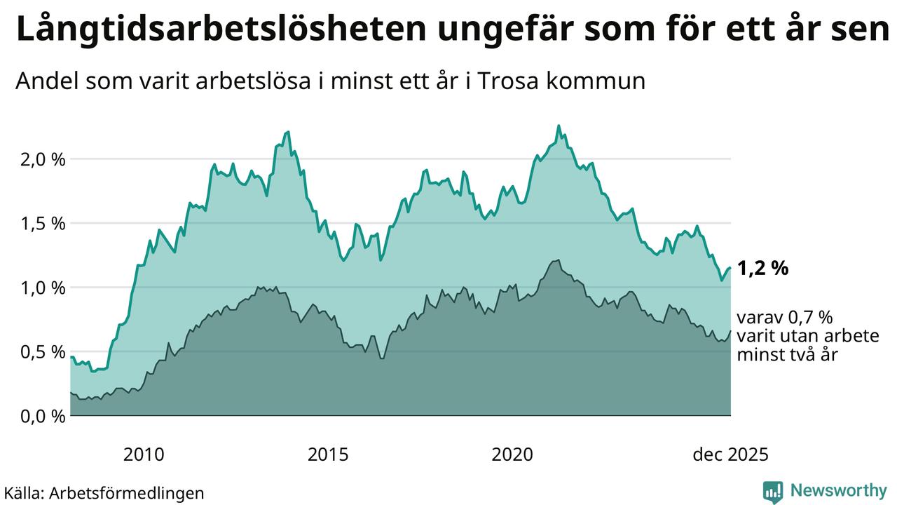 I december hade 80 Trosabor varit arbetslösa i minst ett år, vilket är en fler än månaden innan. 80 personer motsvarar 1,2 procent av arbetskraften i kommunen – andelen långtidsarbetslösa är ungefär på samma nivå som för ett år sedan.