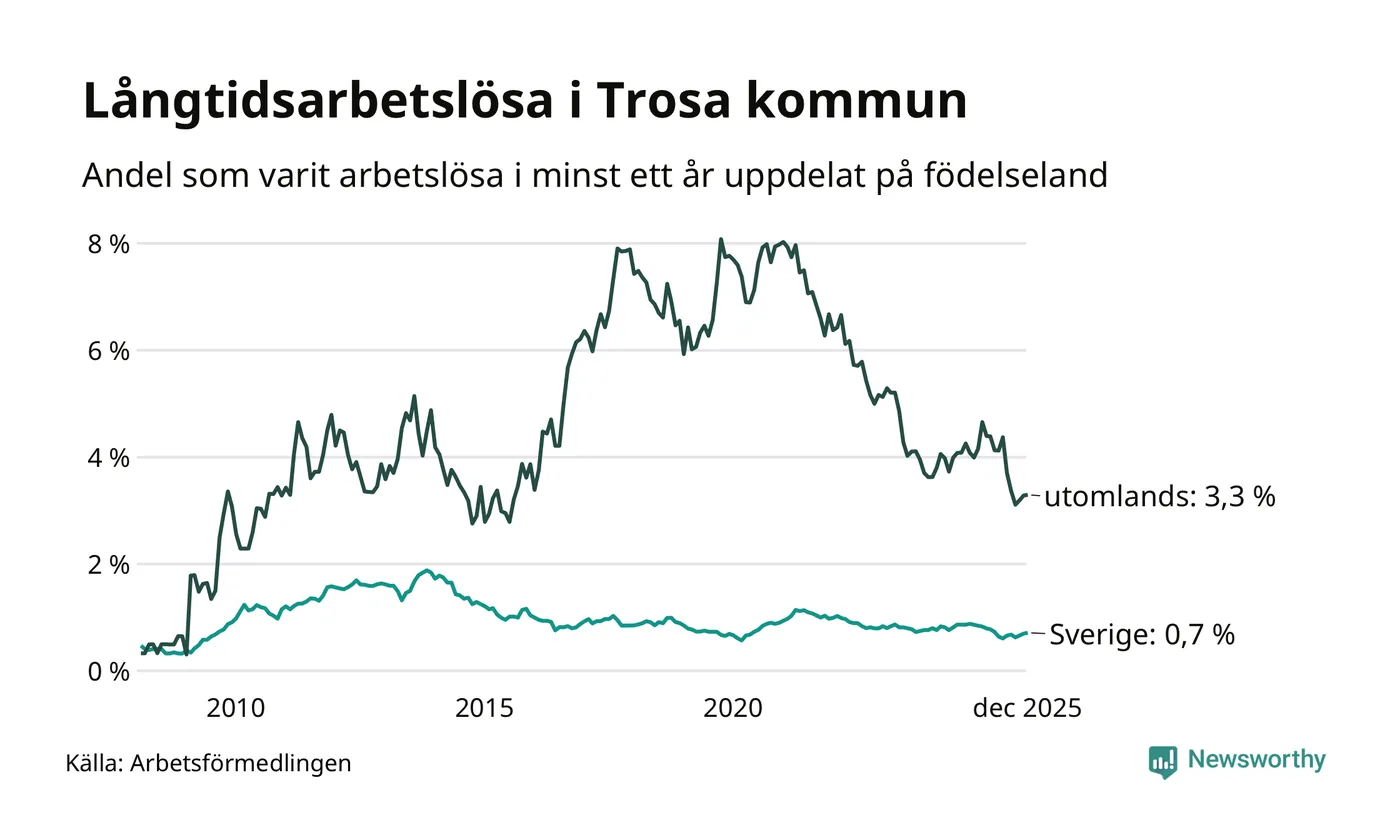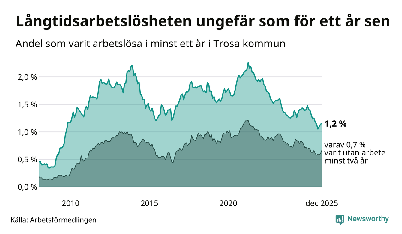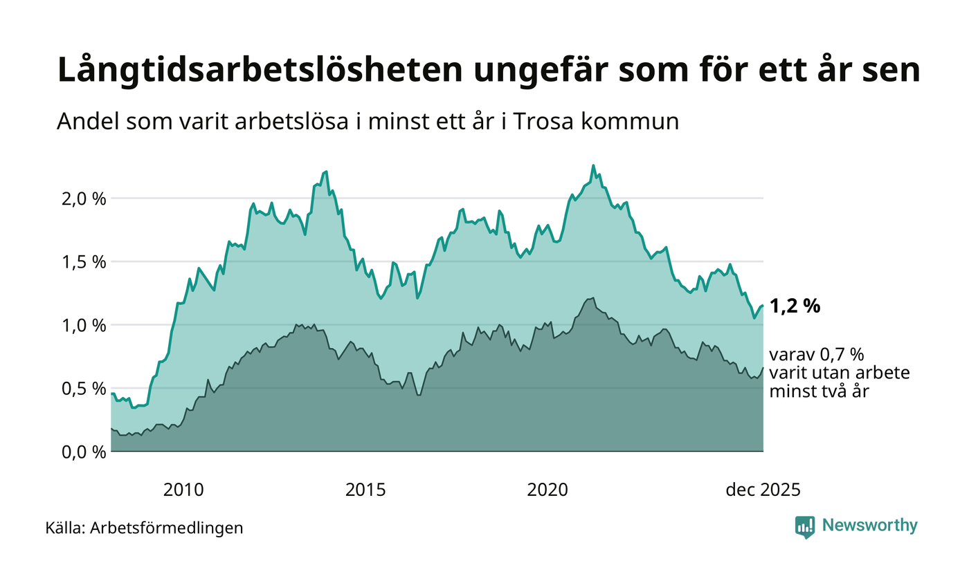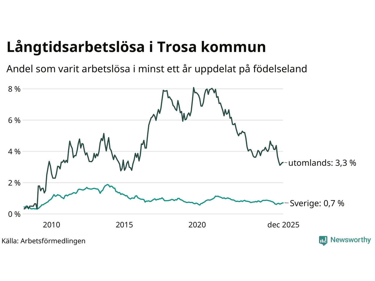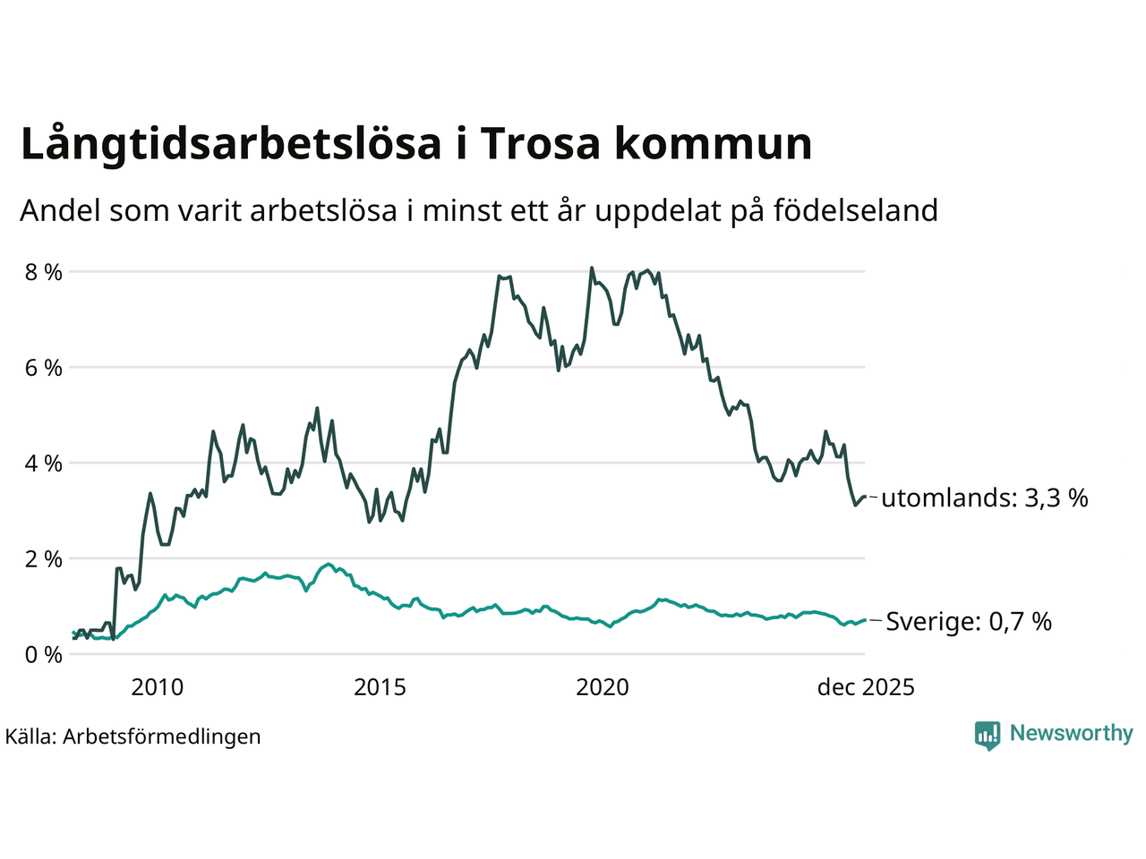 I december hade 80 Trosabor varit arbetslösa i minst ett år, vilket är en fler än månaden innan. 80 personer motsvarar 1,2 procent av arbetskraften i kommunen – andelen långtidsarbetslösa är ungefär på samma nivå som för ett år sedan.