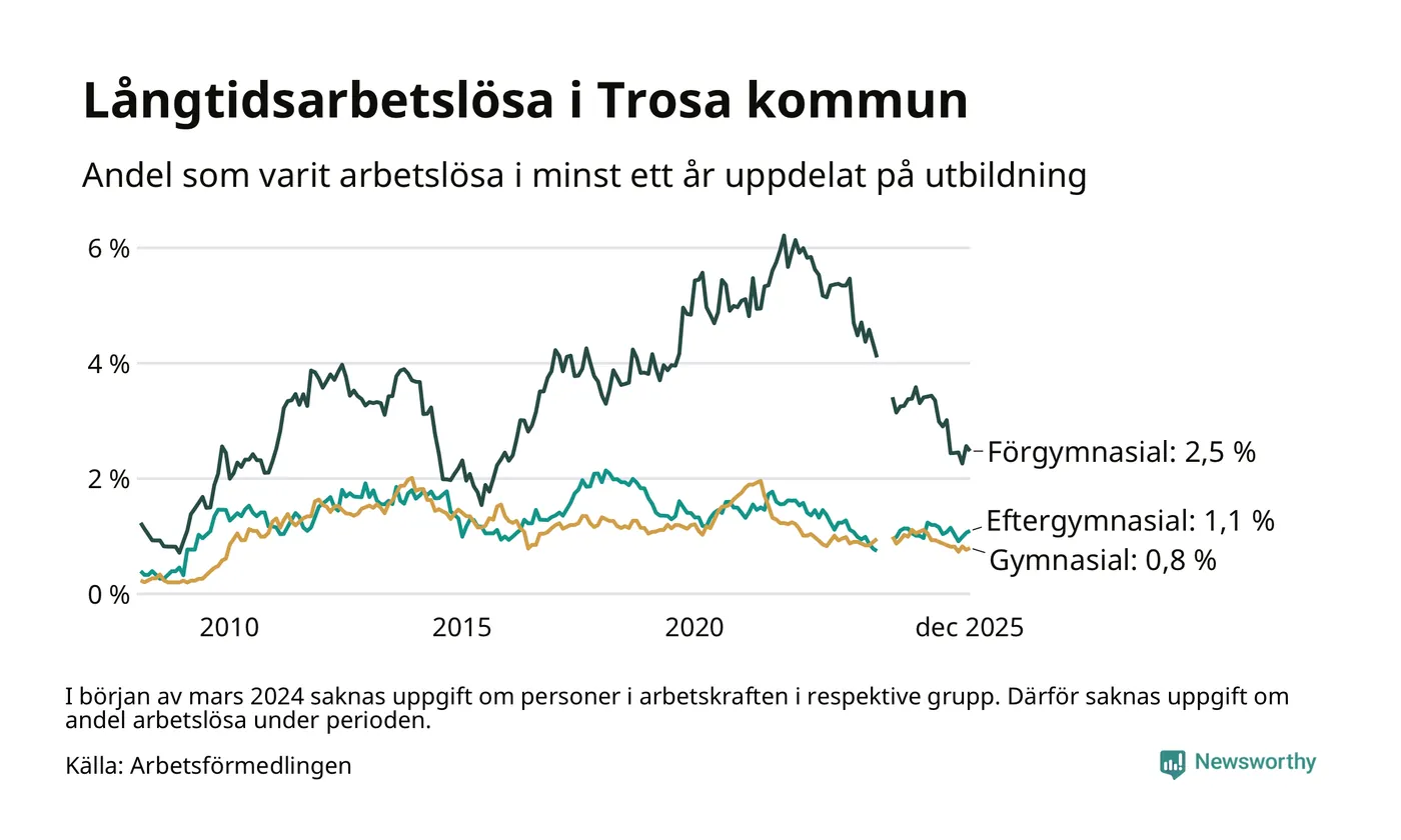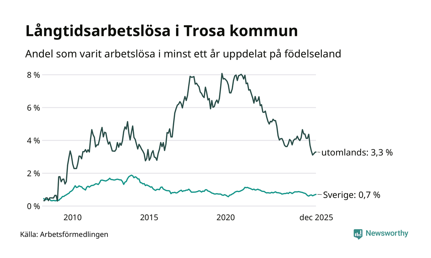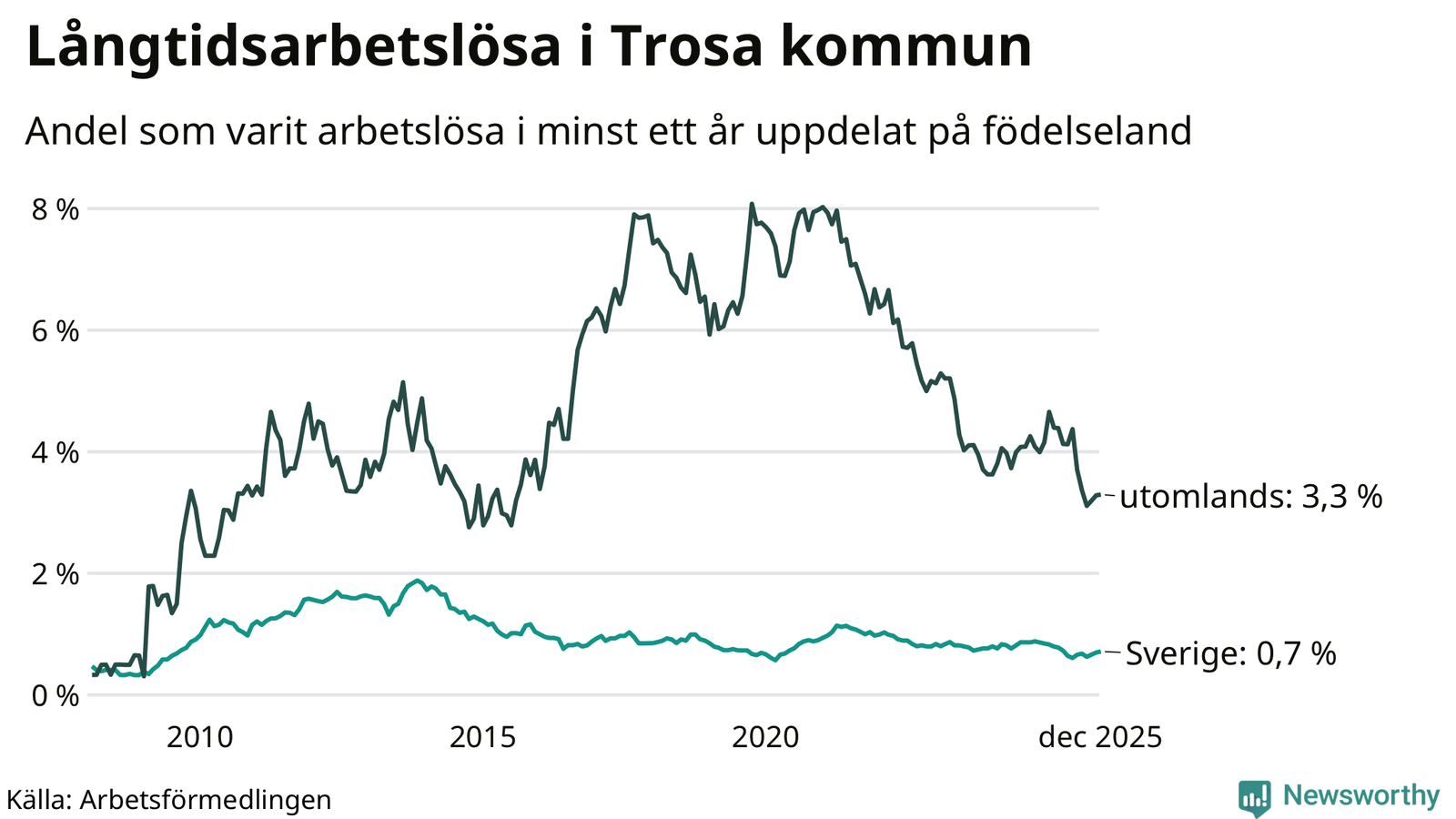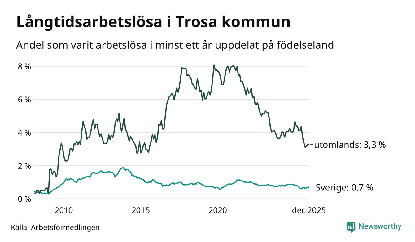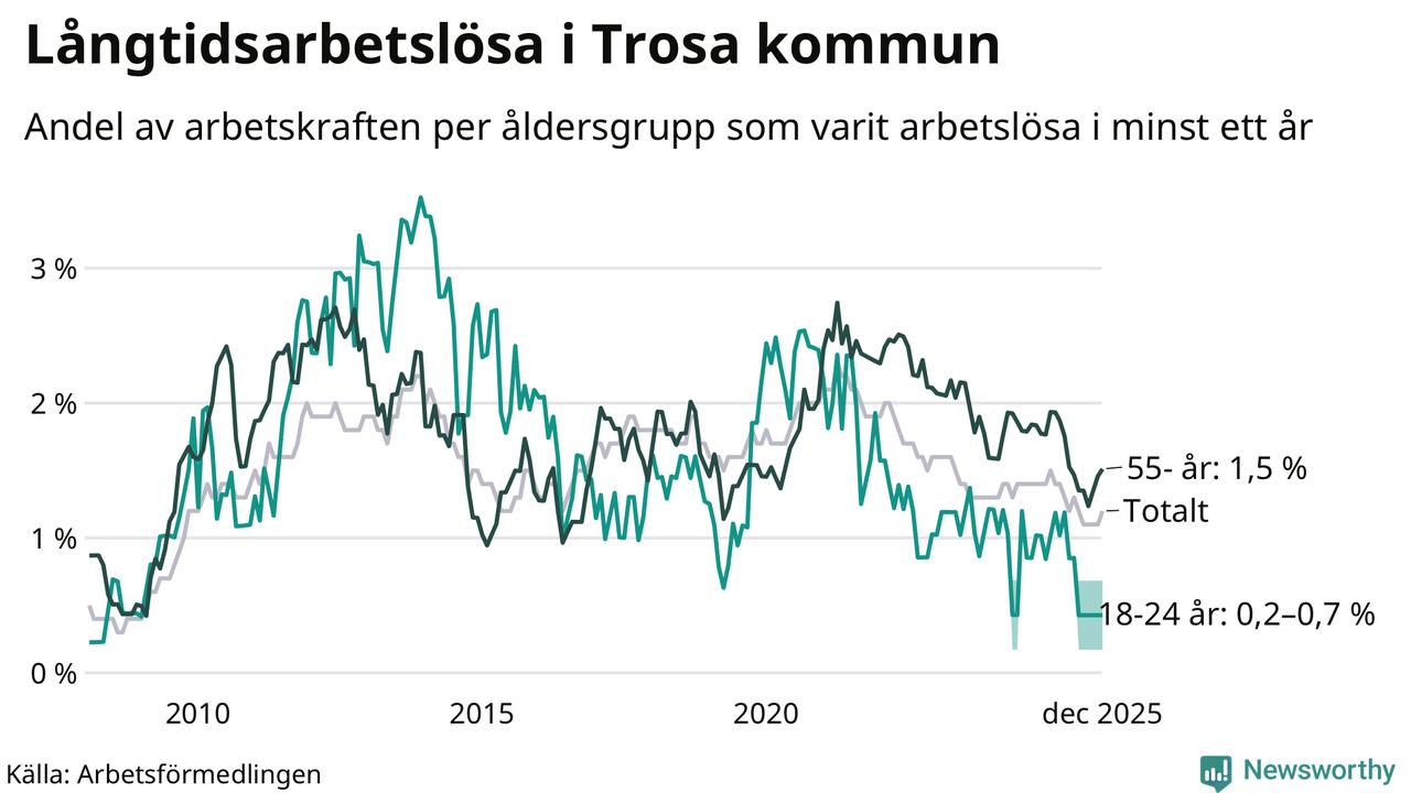 I december hade 80 Trosabor varit arbetslösa i minst ett år, vilket är en fler än månaden innan. 80 personer motsvarar 1,2 procent av arbetskraften i kommunen – andelen långtidsarbetslösa är ungefär på samma nivå som för ett år sedan.