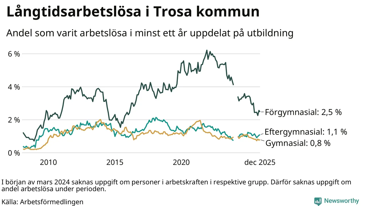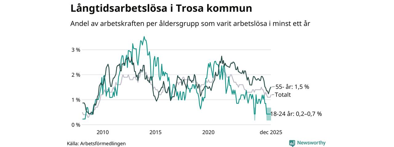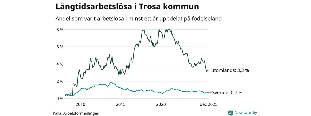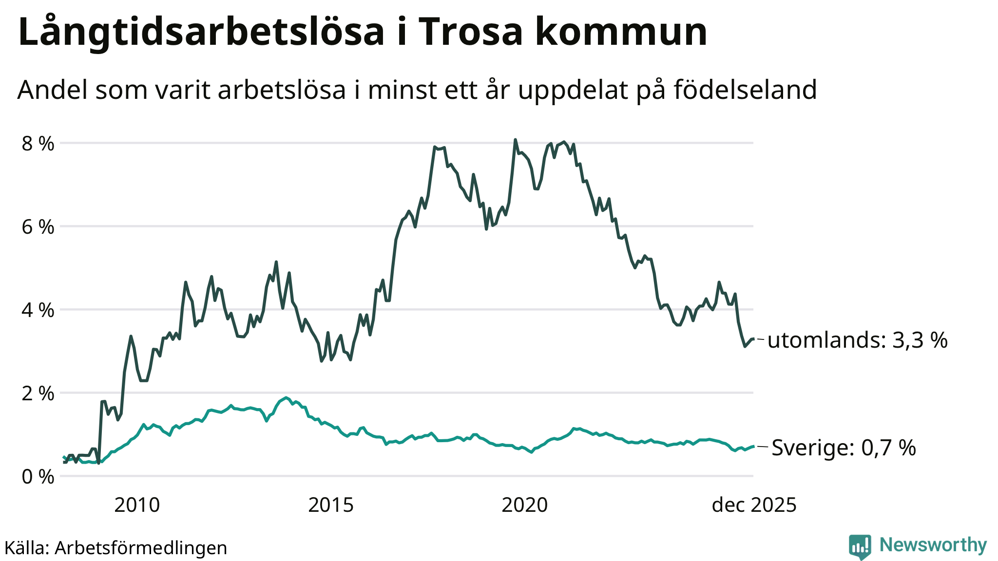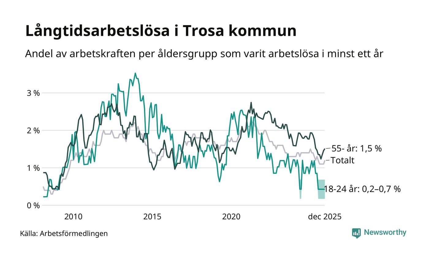 I december hade 80 Trosabor varit arbetslösa i minst ett år, vilket är en fler än månaden innan. 80 personer motsvarar 1,2 procent av arbetskraften i kommunen – andelen långtidsarbetslösa är ungefär på samma nivå som för ett år sedan.