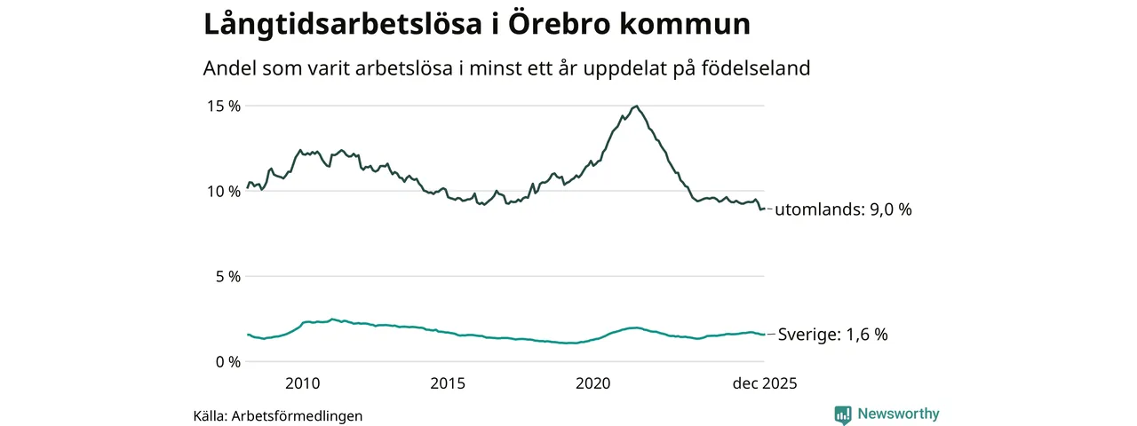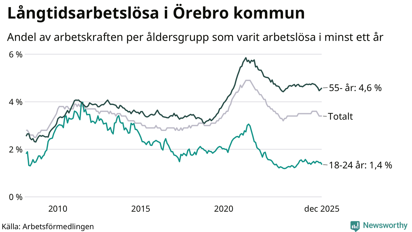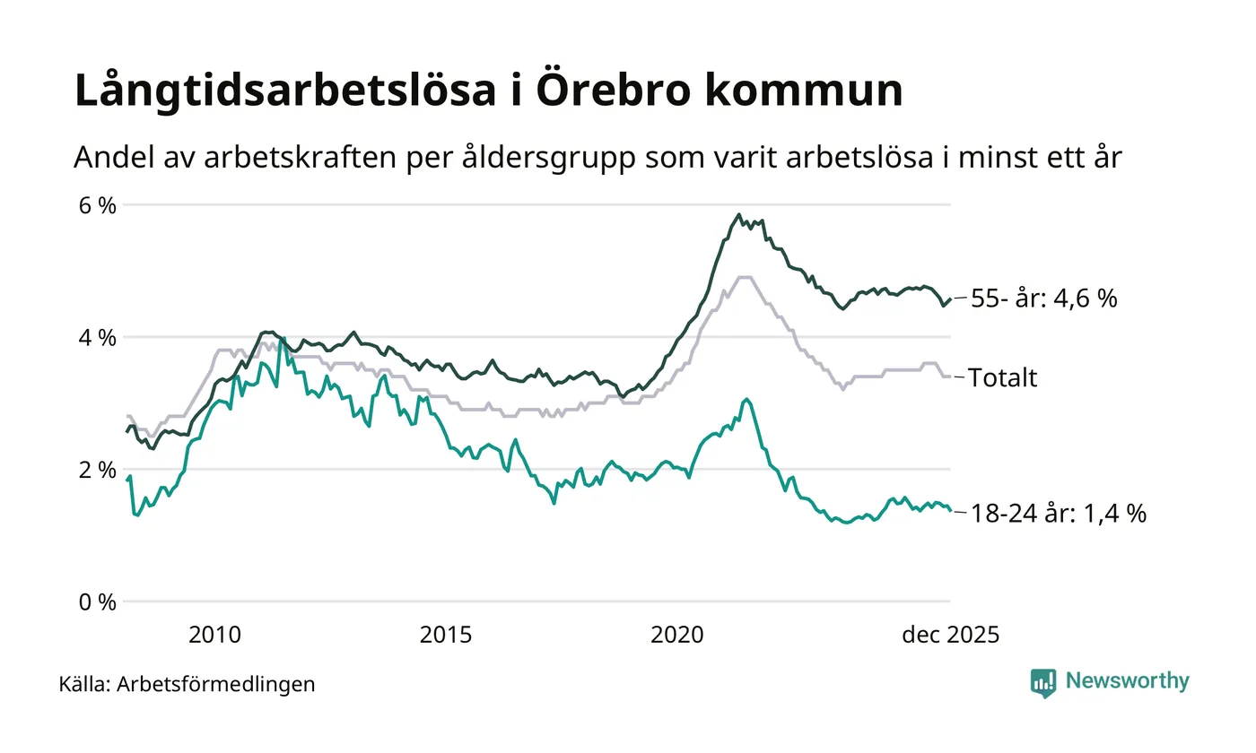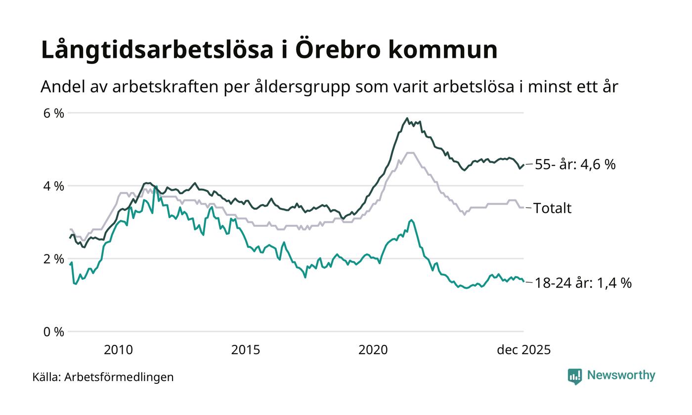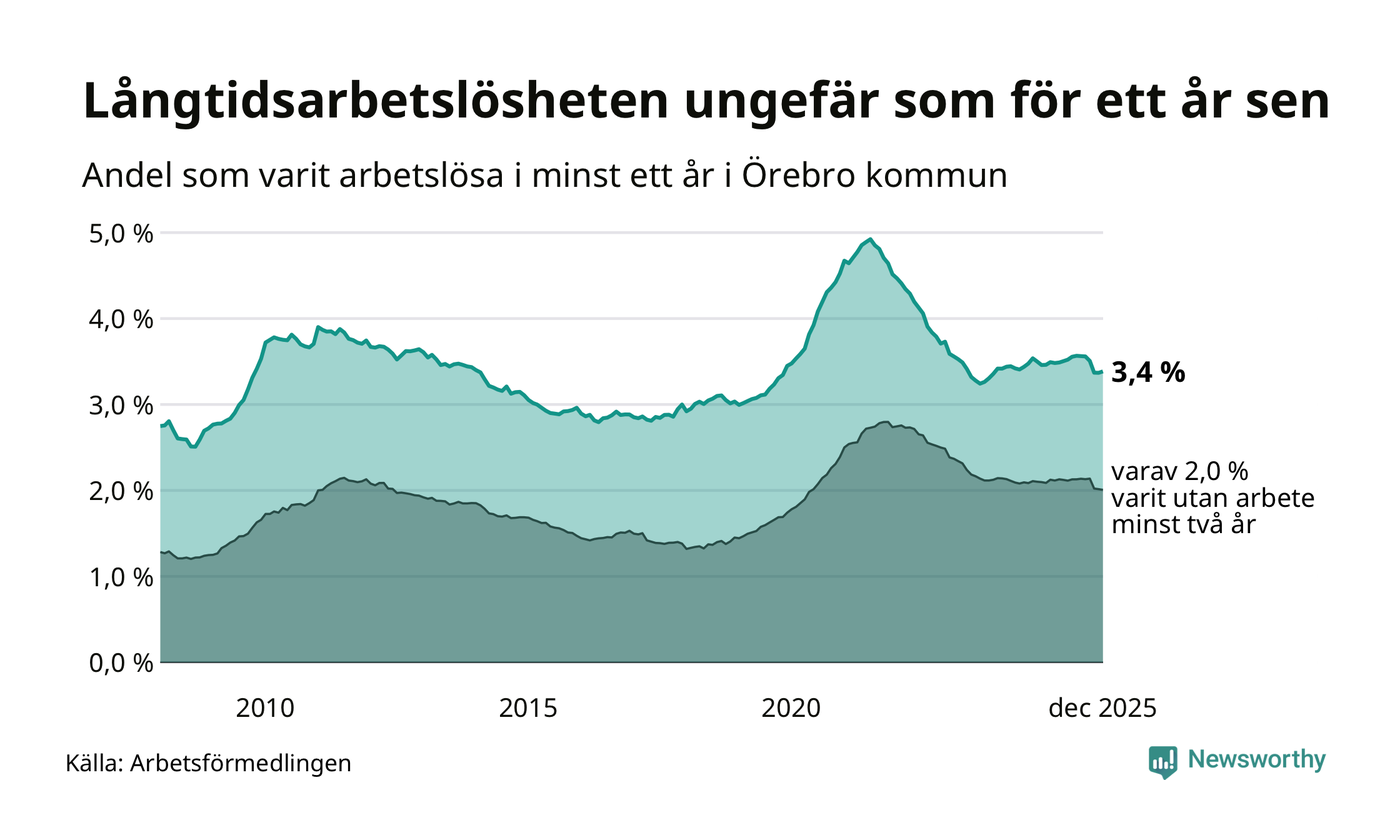 I december hade 2 782 Örebrobor varit arbetslösa i minst ett år, vilket är 15 fler än månaden innan. Det är den första månaden sedan juni 2025 som antalet arbetslösa ökar. 2 782 personer motsvarar 3,4 procent av arbetskraften i kommunen – andelen långtidsarbetslösa är ungefär på samma nivå som för ett år sedan.