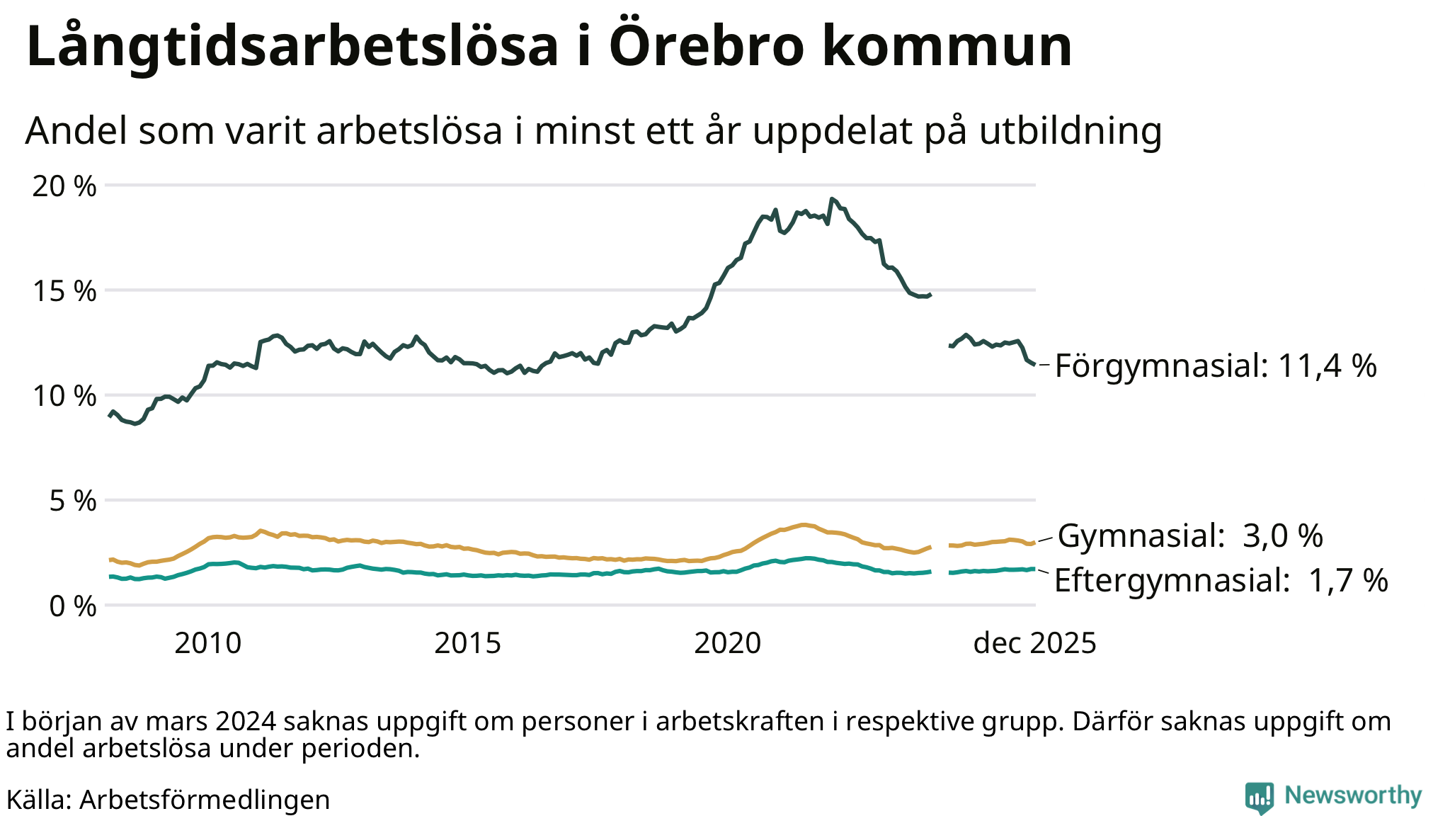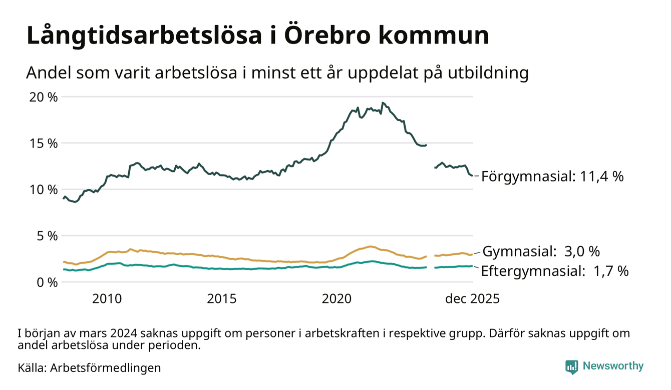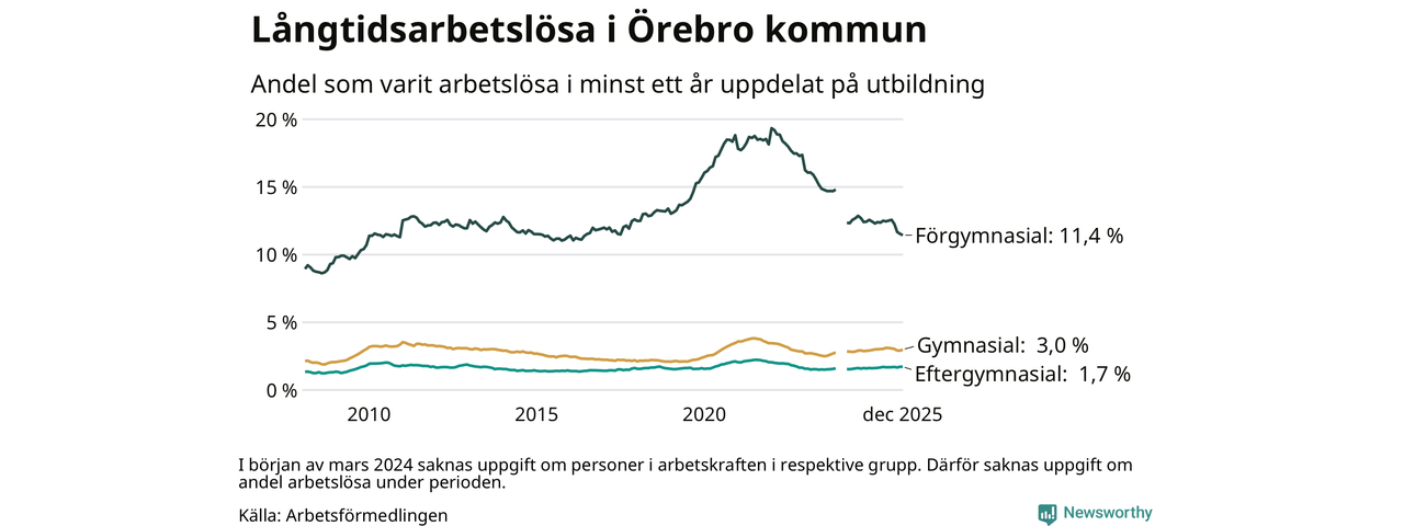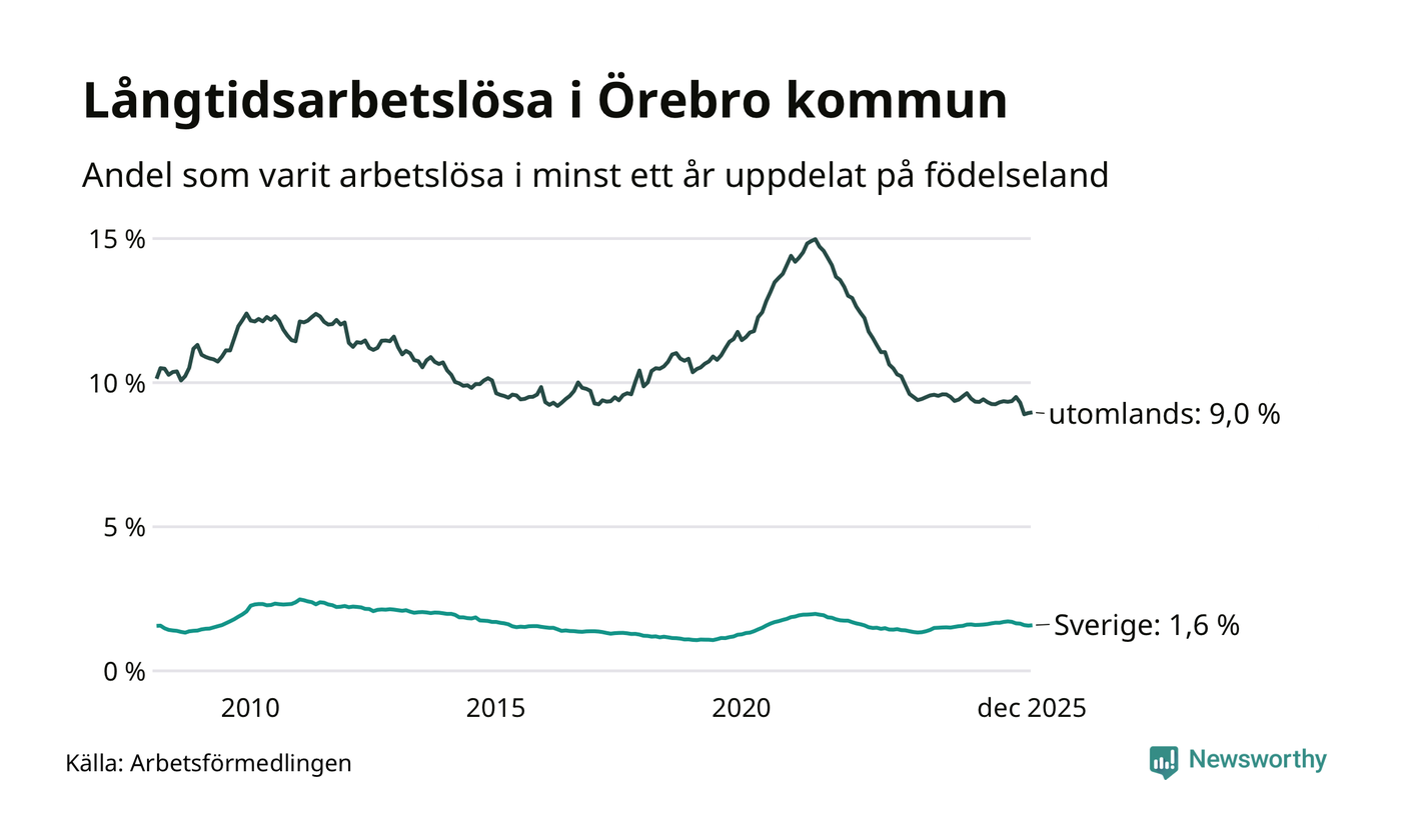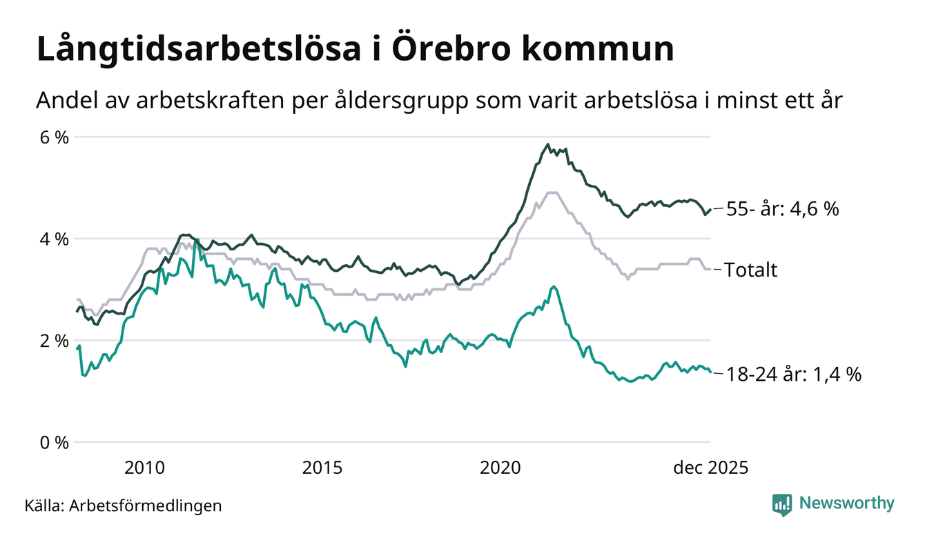 I december hade 2 782 Örebrobor varit arbetslösa i minst ett år, vilket är 15 fler än månaden innan. Det är den första månaden sedan juni 2025 som antalet arbetslösa ökar. 2 782 personer motsvarar 3,4 procent av arbetskraften i kommunen – andelen långtidsarbetslösa är ungefär på samma nivå som för ett år sedan.