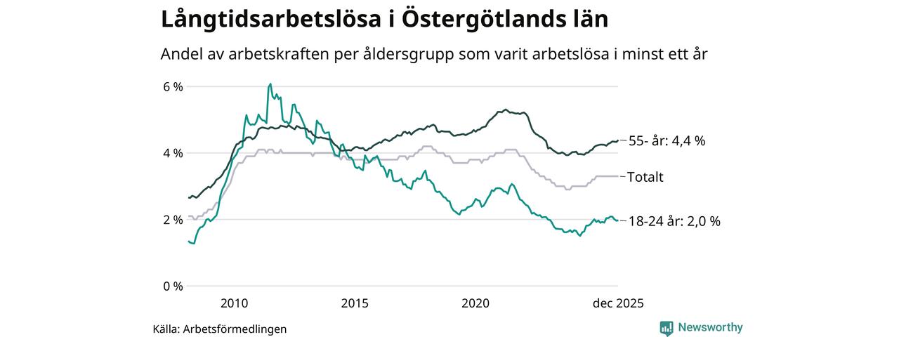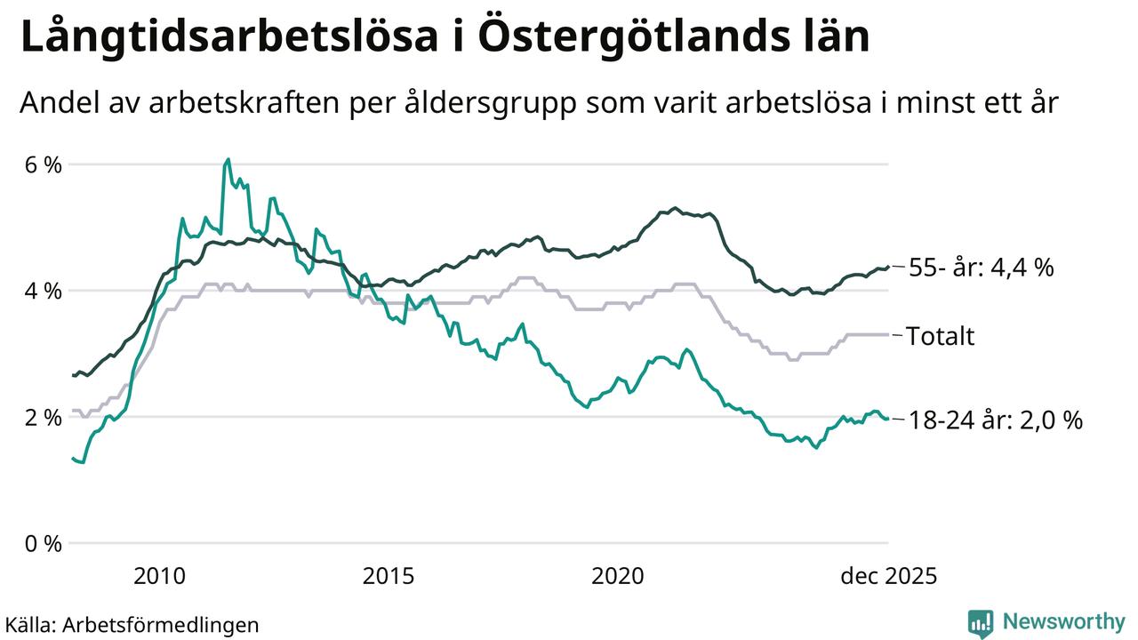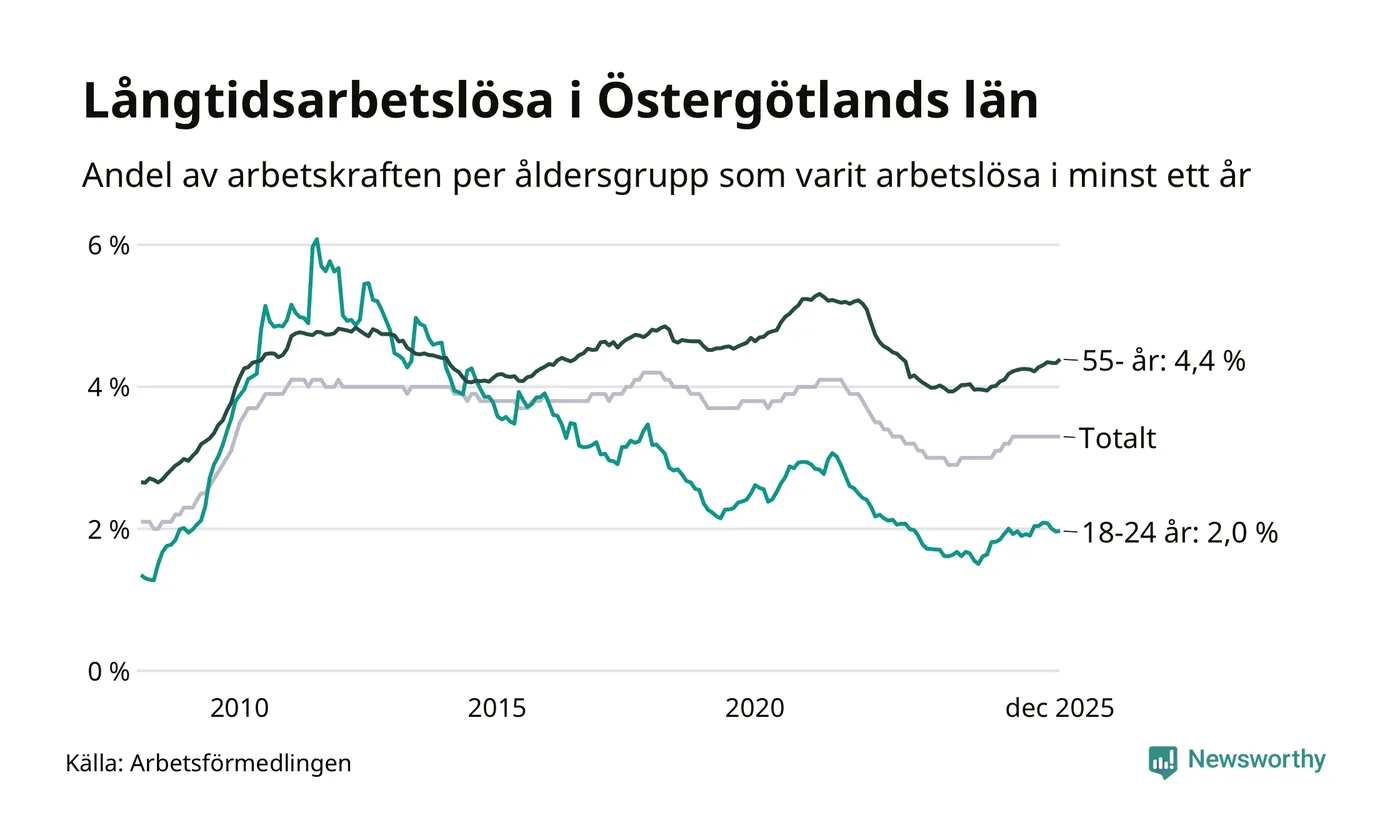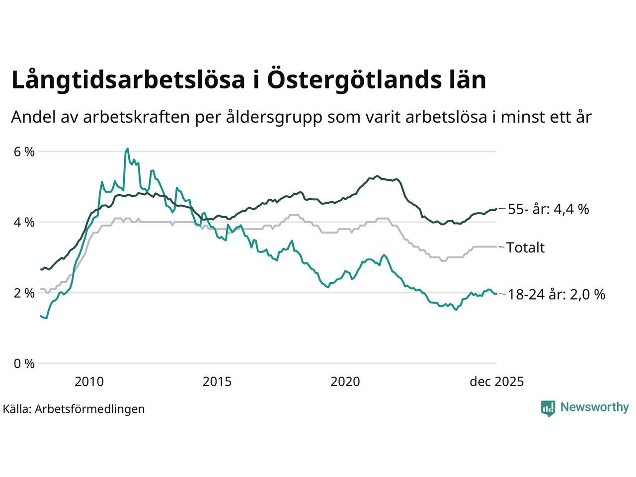 Av de 7 724 personerna som varit arbetslösa i mer än ett år i Östergötlands län är 2 200 personer mellan 55 och 651 år och mellan 511 och 511 är mellan 18 och 24 år. För den äldre gruppen är andelen arbetslösa 4,4 procent medan den i den yngre gruppen är 2,0 procent. Även i riket som helhet är långtidsarbetslösheten högre i gruppen äldre.