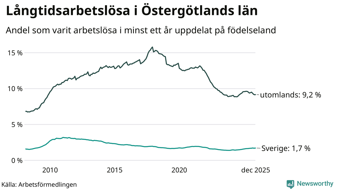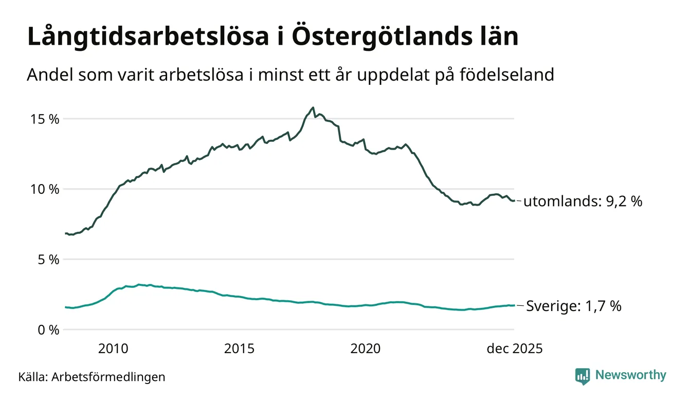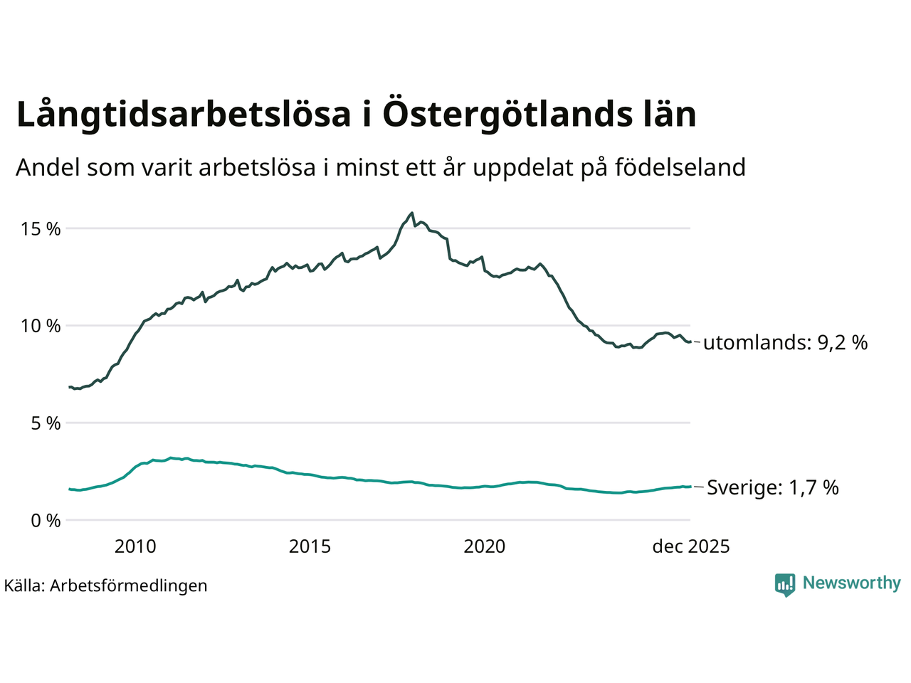 3 193 av de långtidsarbetslösa i Östergötland är födda i Sverige och mellan 4 532 och 4 535 är födda utomlands. Det innebär att långtidsarbetslösheten bland Sverigefödda är 1,7 procent, medan den ligger på 9,2 procent för utlandsfödda.