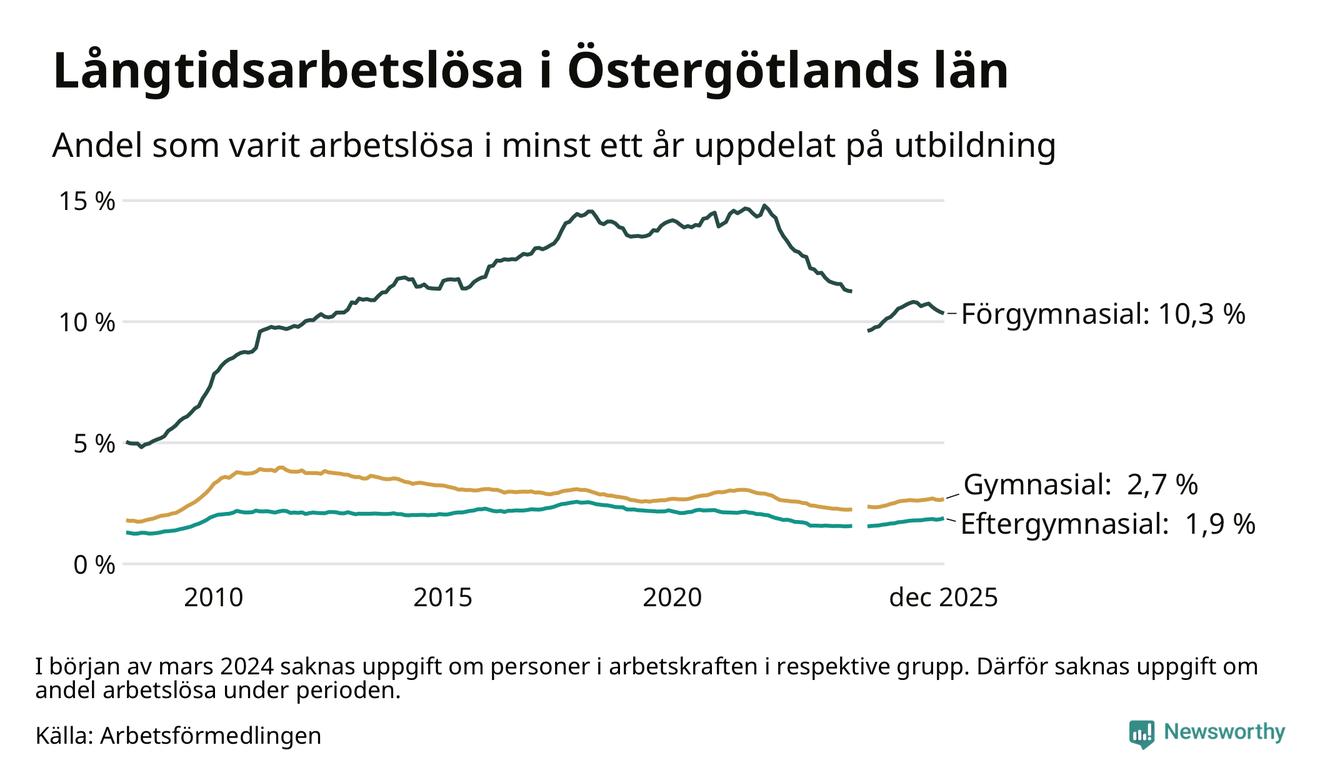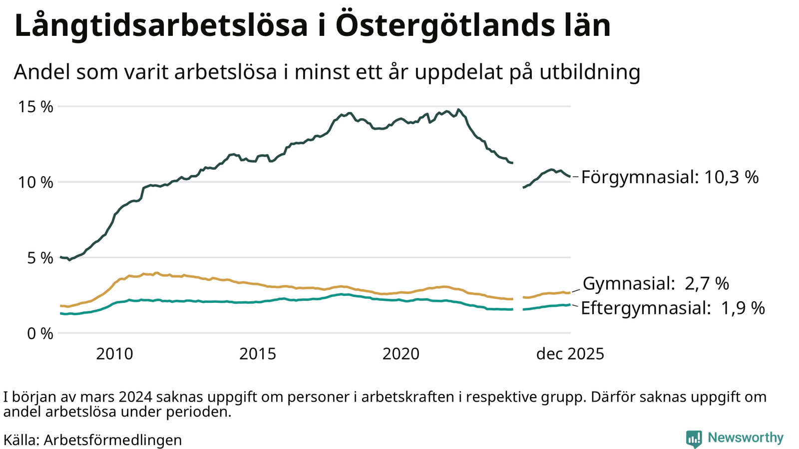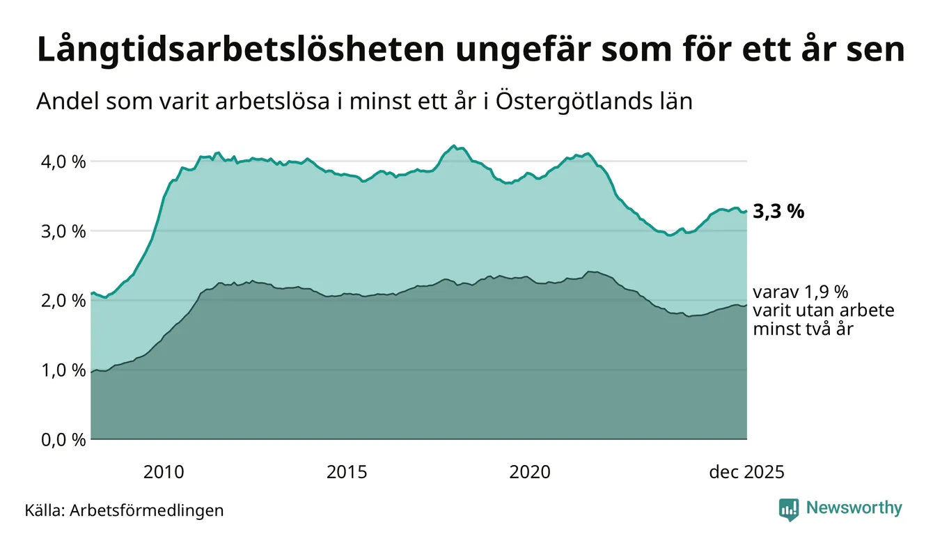 I december hade 7 724 Östgötabor varit arbetslösa i minst ett år, vilket är 59 fler än månaden innan. 7 724 personer motsvarar 3,3 procent av arbetskraften i länet – andelen långtidsarbetslösa är ungefär på samma nivå som för ett år sedan.