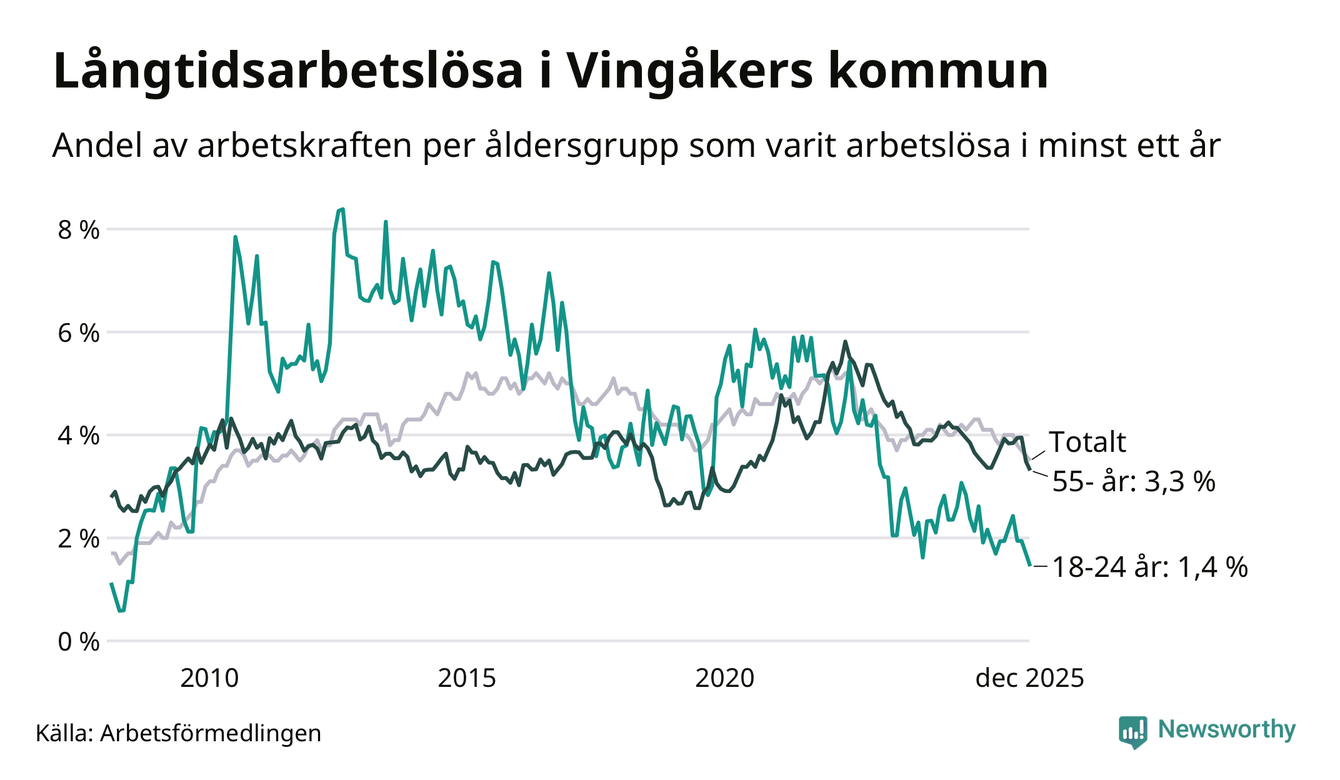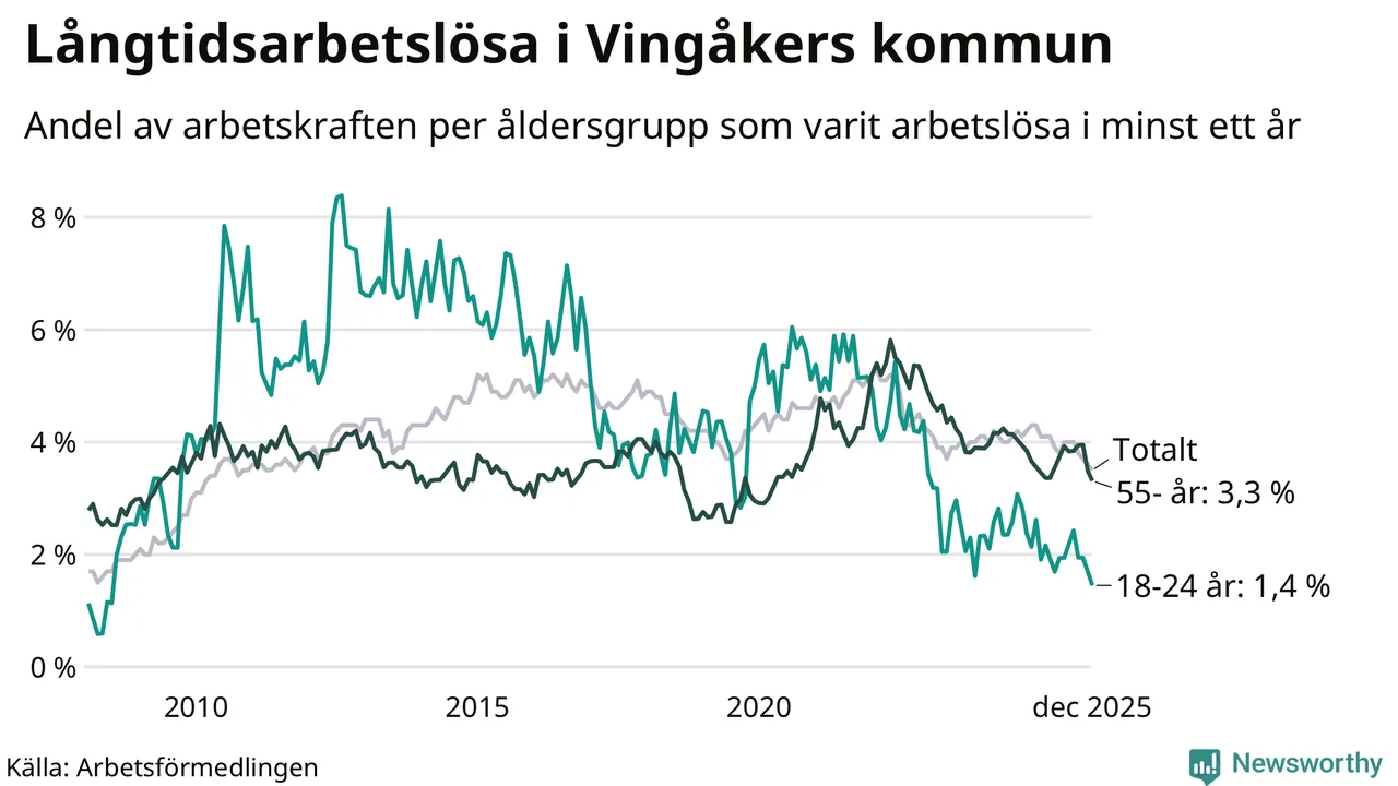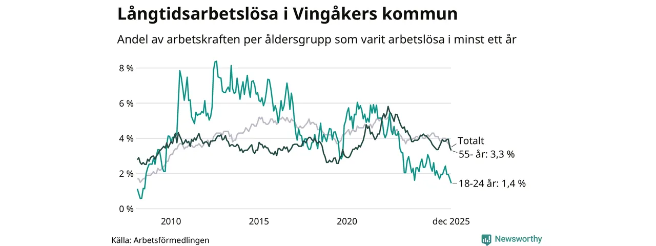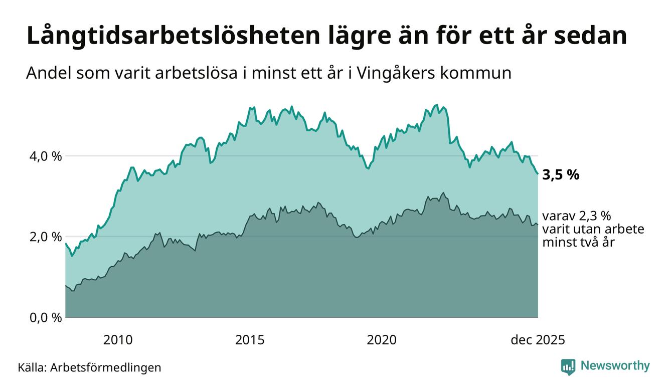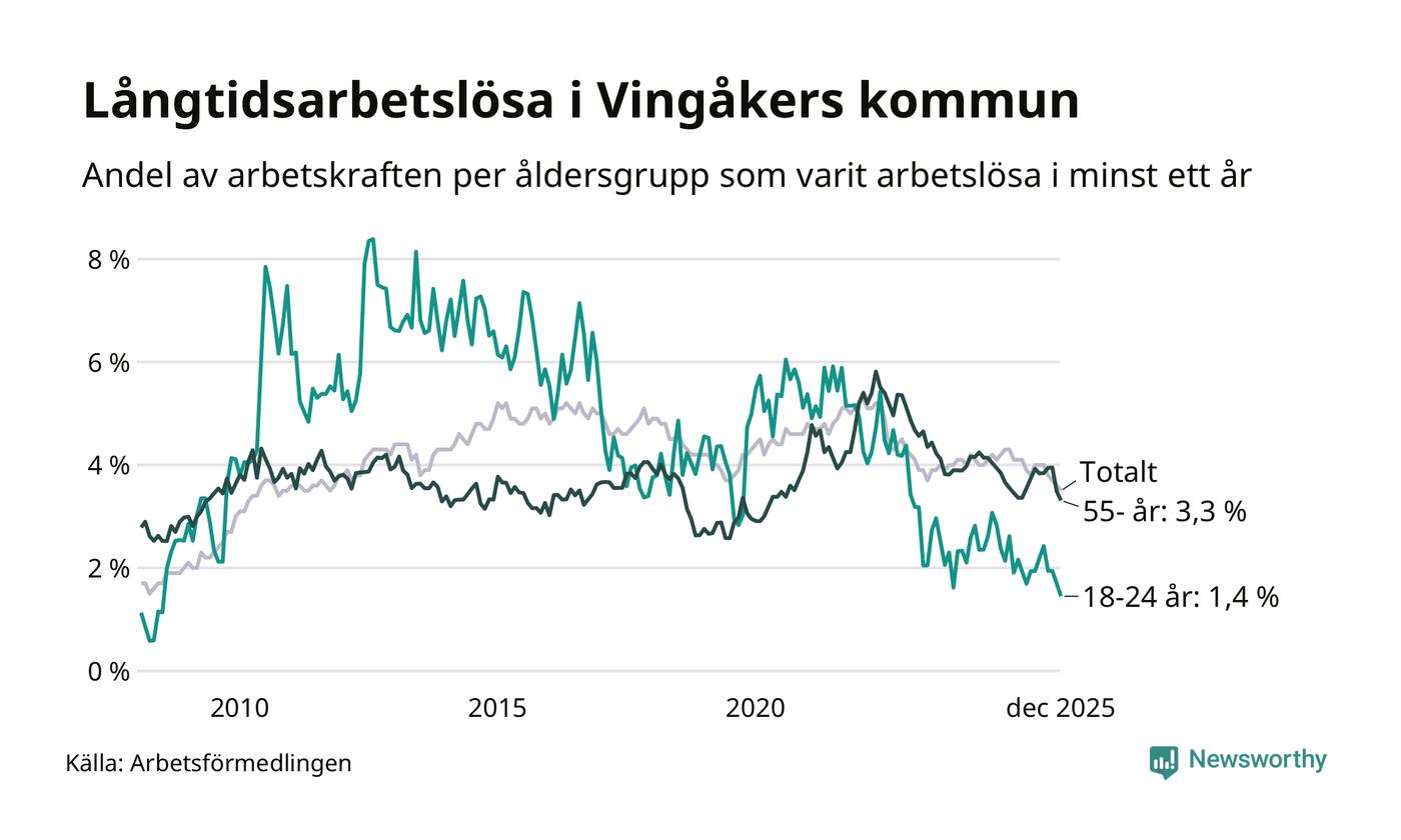 I december hade 138 Vingåkersbor varit arbetslösa i minst ett år, vilket är tre färre än månaden innan. Det är den sjätte månaden i rad med minskande antal långtidsarbetslösa. 138 personer motsvarar 3,5 procent av arbetskraften i kommunen – andelen långtidsarbetslösa är 0,8 procentenheter lägre än samma månad för ett år sedan.