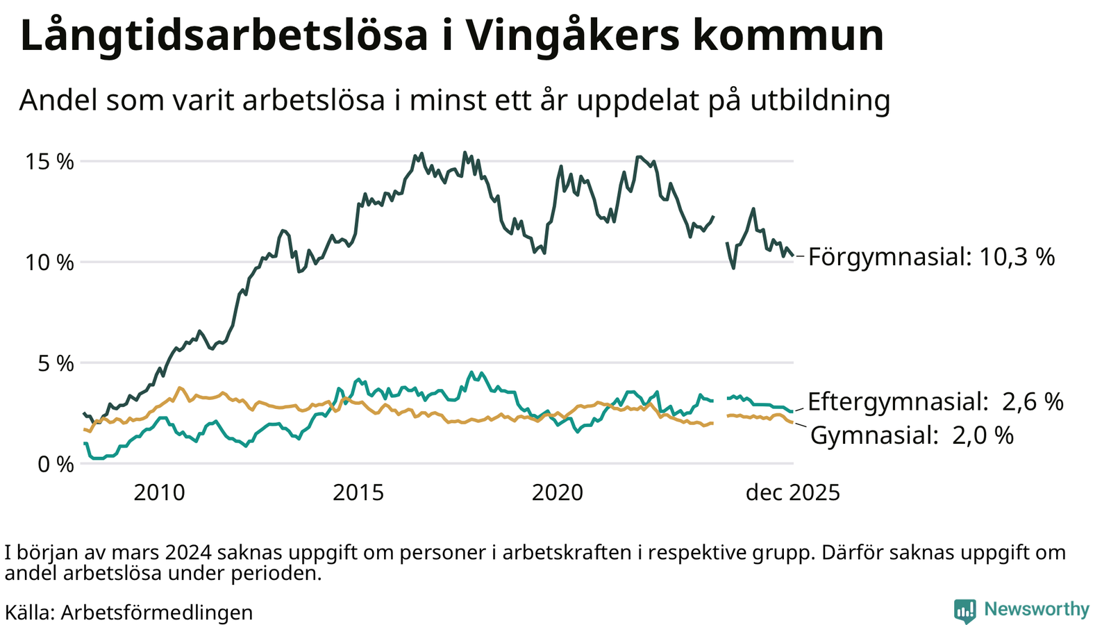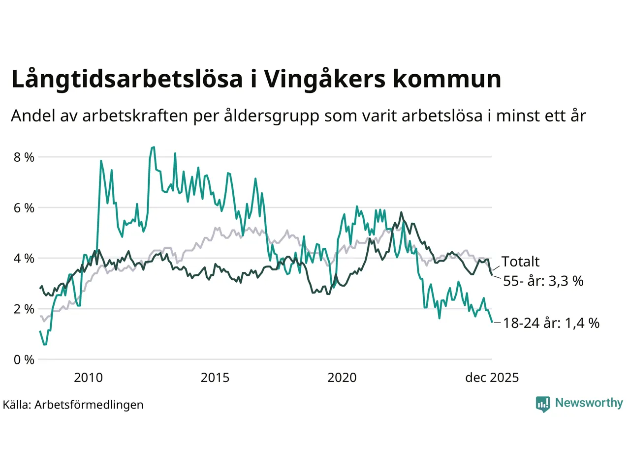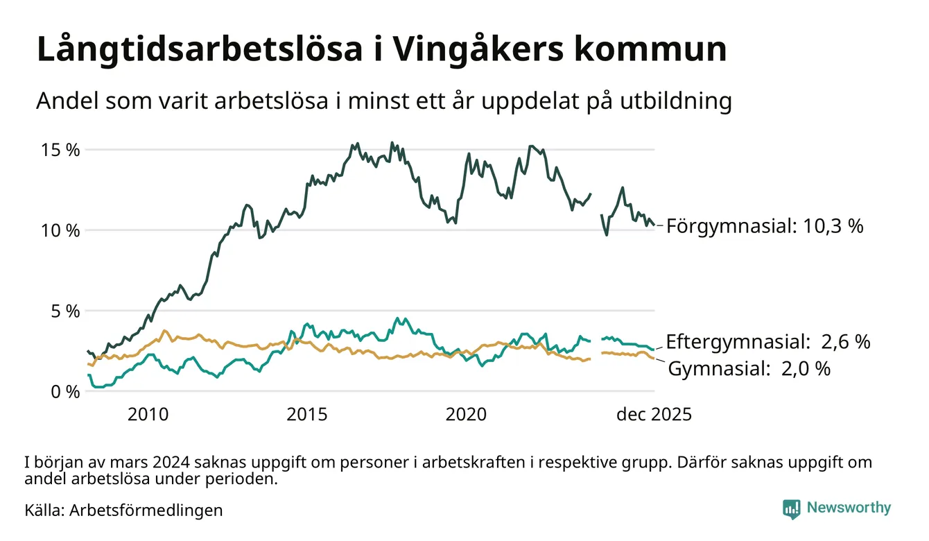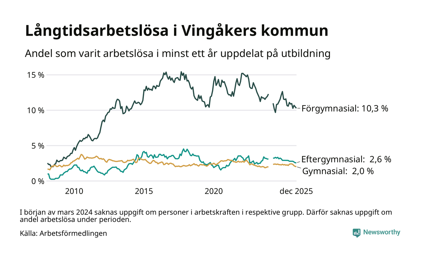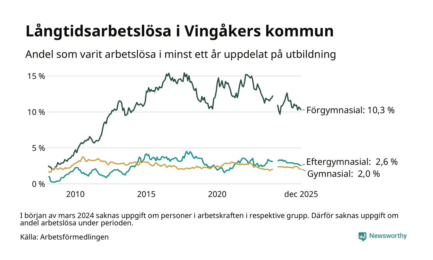 I december hade 138 Vingåkersbor varit arbetslösa i minst ett år, vilket är tre färre än månaden innan. Det är den sjätte månaden i rad med minskande antal långtidsarbetslösa. 138 personer motsvarar 3,5 procent av arbetskraften i kommunen – andelen långtidsarbetslösa är 0,8 procentenheter lägre än samma månad för ett år sedan.