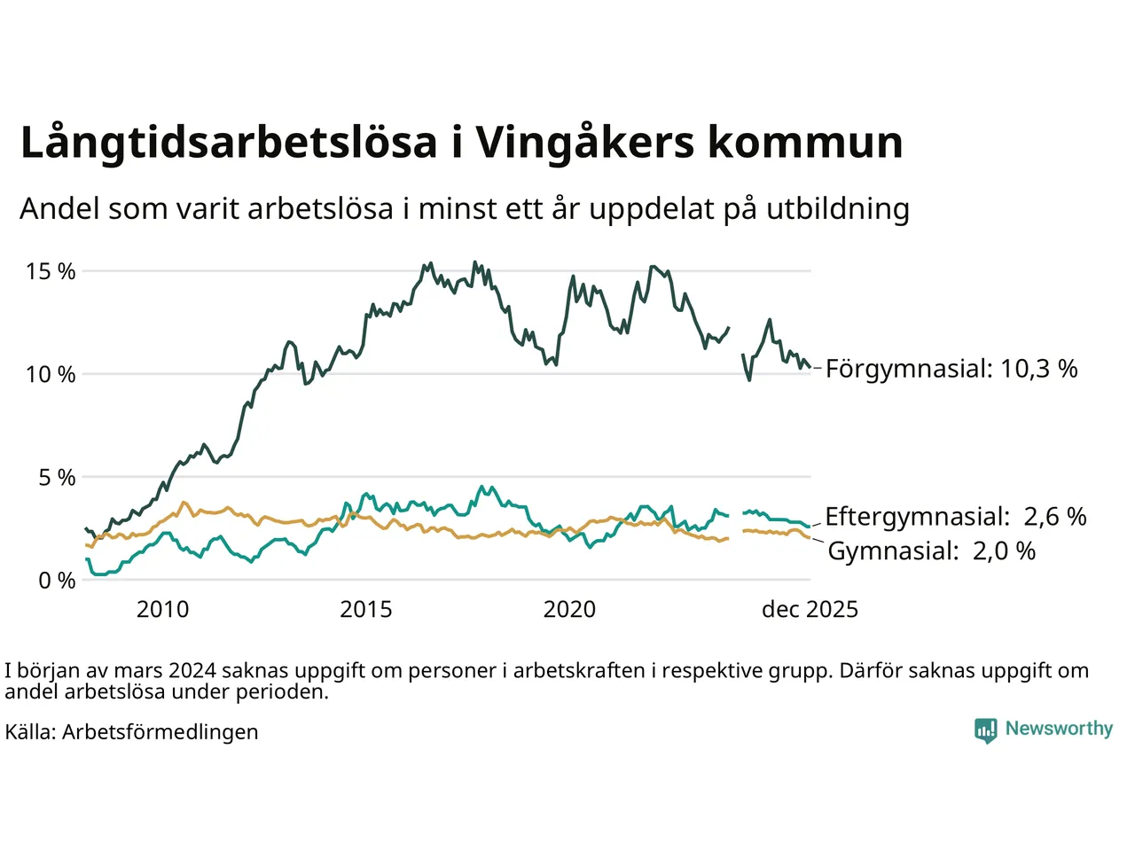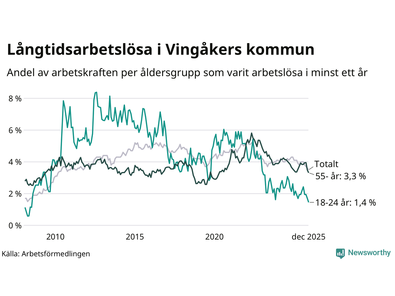 | Andel arbetslösa i minst ett år | 3,5 % | 3,9 % | 2,9 % |