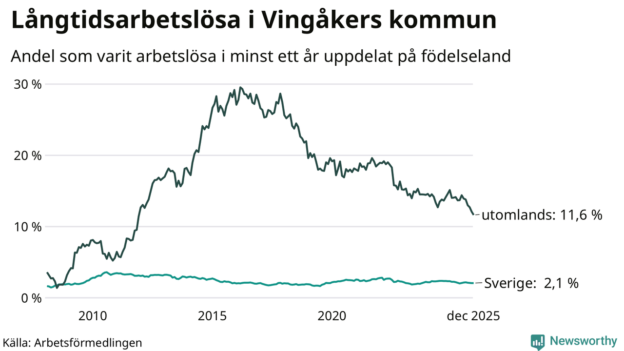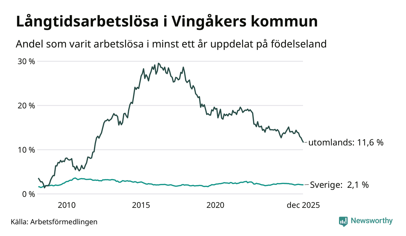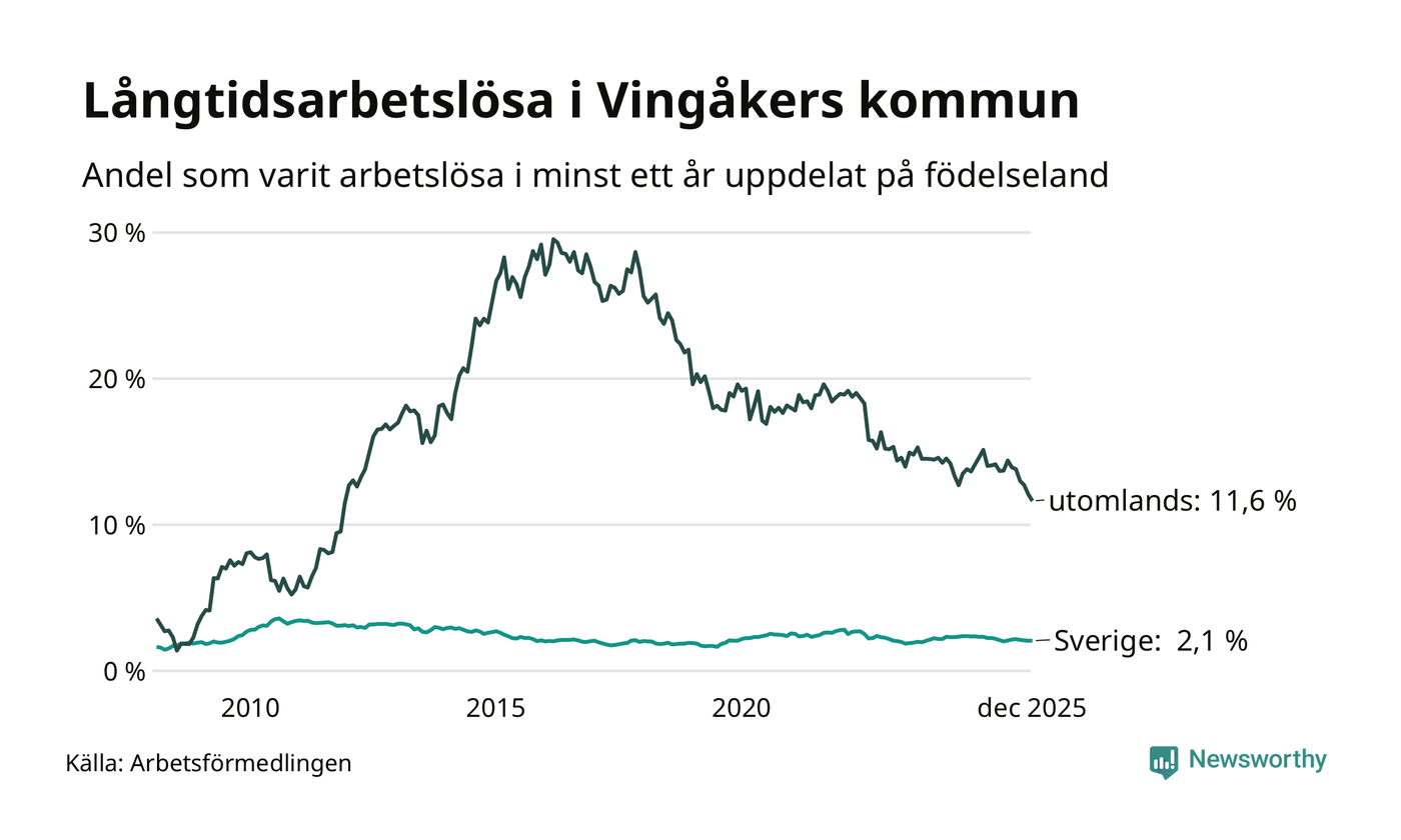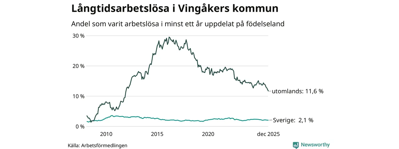 68 av de långtidsarbetslösa i Vingåker är födda i Sverige, medan 70 är födda utomlands. Det innebär att långtidsarbetslösheten bland Sverigefödda är 2,1 procent, medan den är sex gånger så hög – 11,6 procent – bland födda utomlands. Även i riket som helhet är arbetslösheten högre bland utrikesfödda.