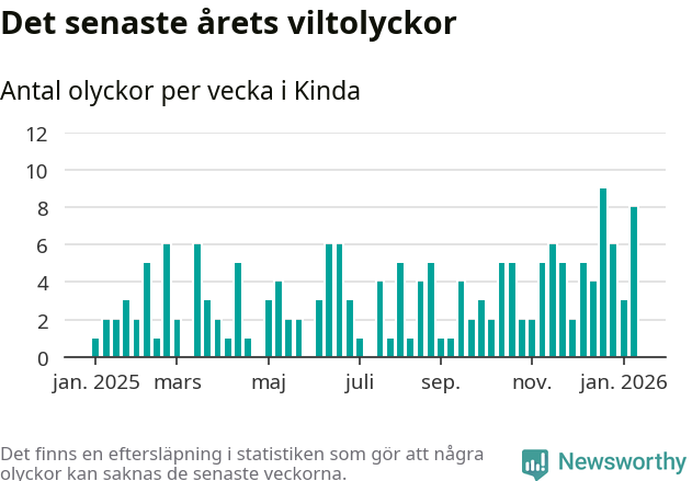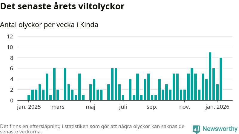 Hittills har åtta viltolyckor rapporterats in i Kinda kommun från vecka 3. Det är en av de högsta siffrorna för en enskild vecka på över tio år.