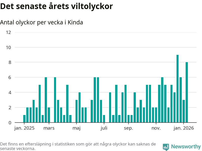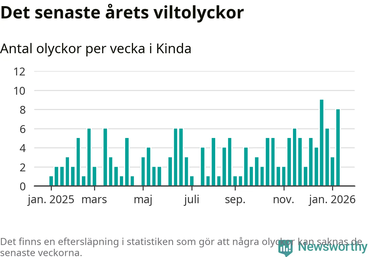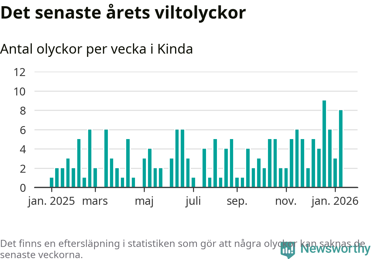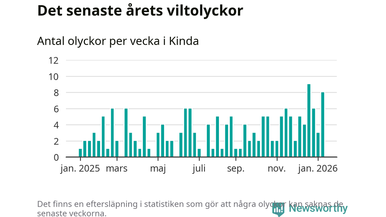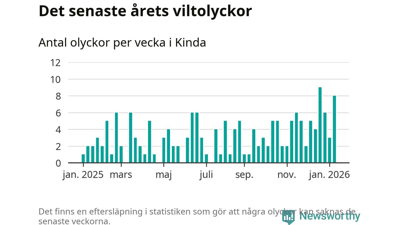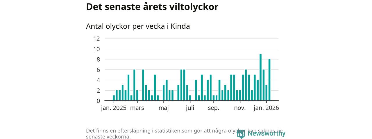Åtta olyckor på en enda vecka är också ovanligt många. Bara 13 gånger tidigare sedan 2015 har det skett så många viltolyckor under en vecka i Kinda kommun.