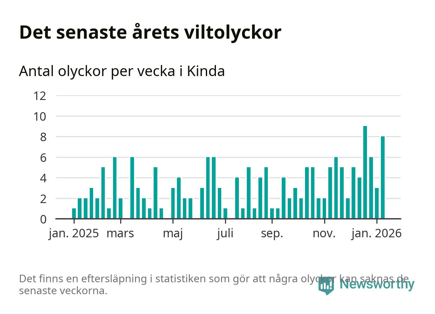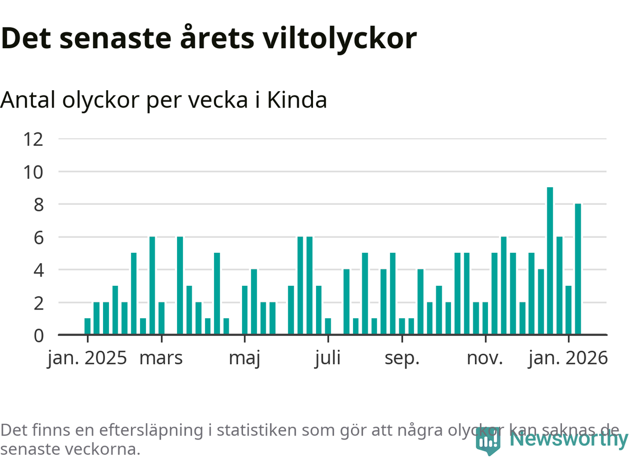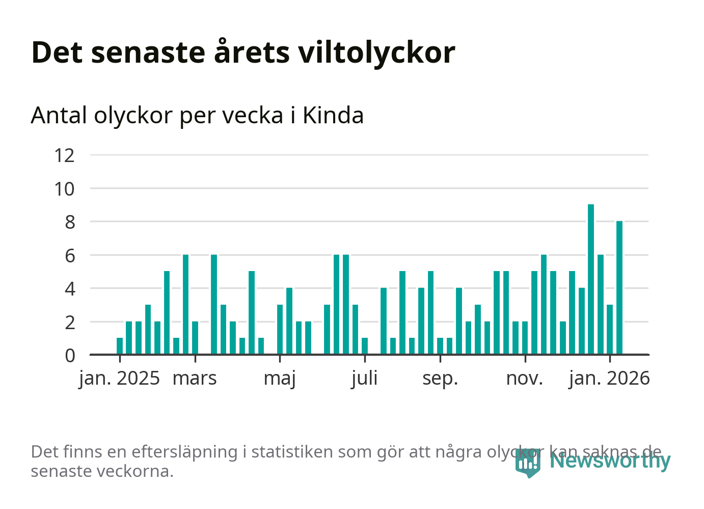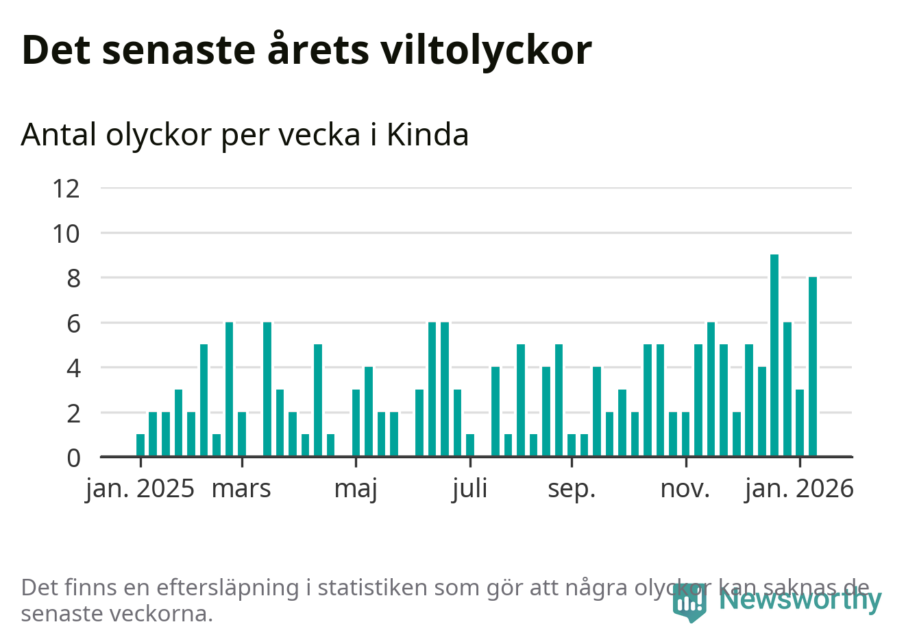 Åtta olyckor på en enda vecka är också ovanligt många. Bara 13 gånger tidigare sedan 2015 har det skett så många viltolyckor under en vecka i Kinda kommun.