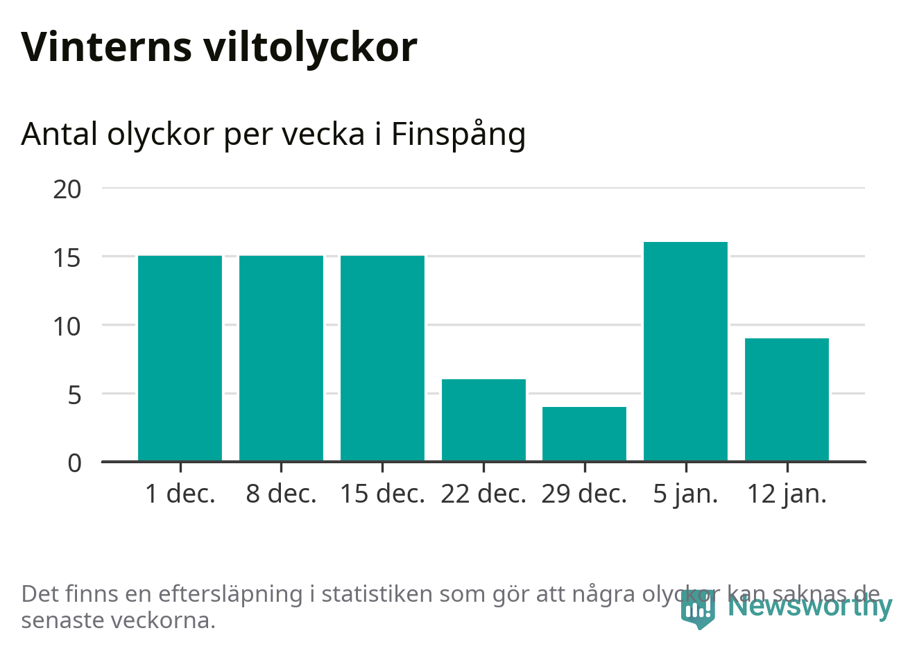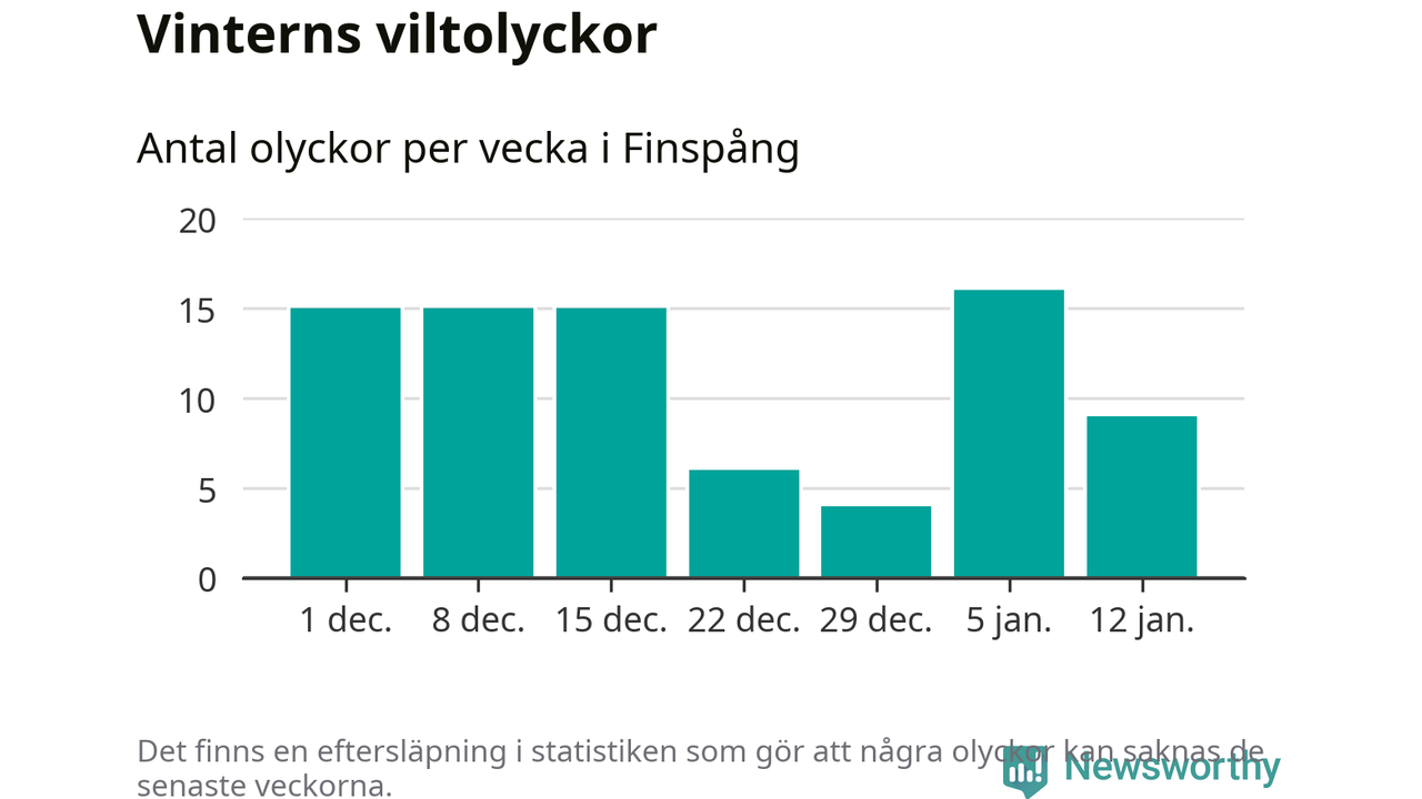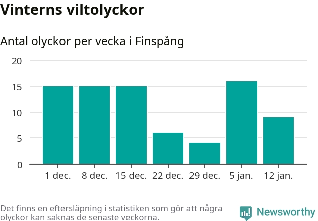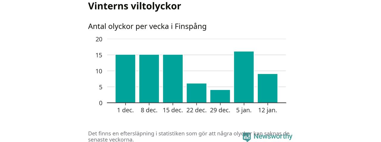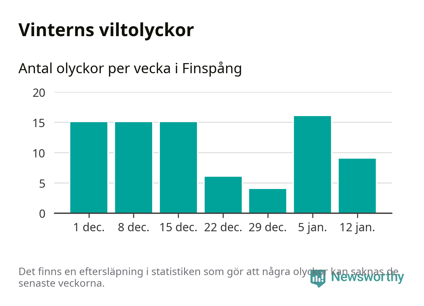 Under vecka 3 rapporterades nio viltolyckor in i Finspångs kommun. Därmed har det inträffat fler viltolyckor hittills den här vintern, än det brukar göra en hel genomsnittlig vinter.