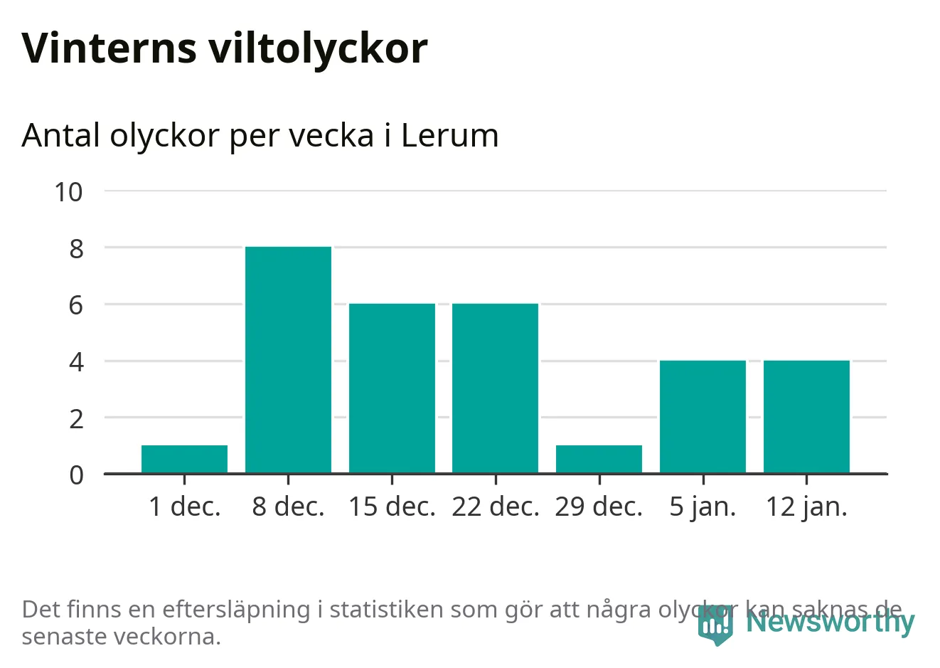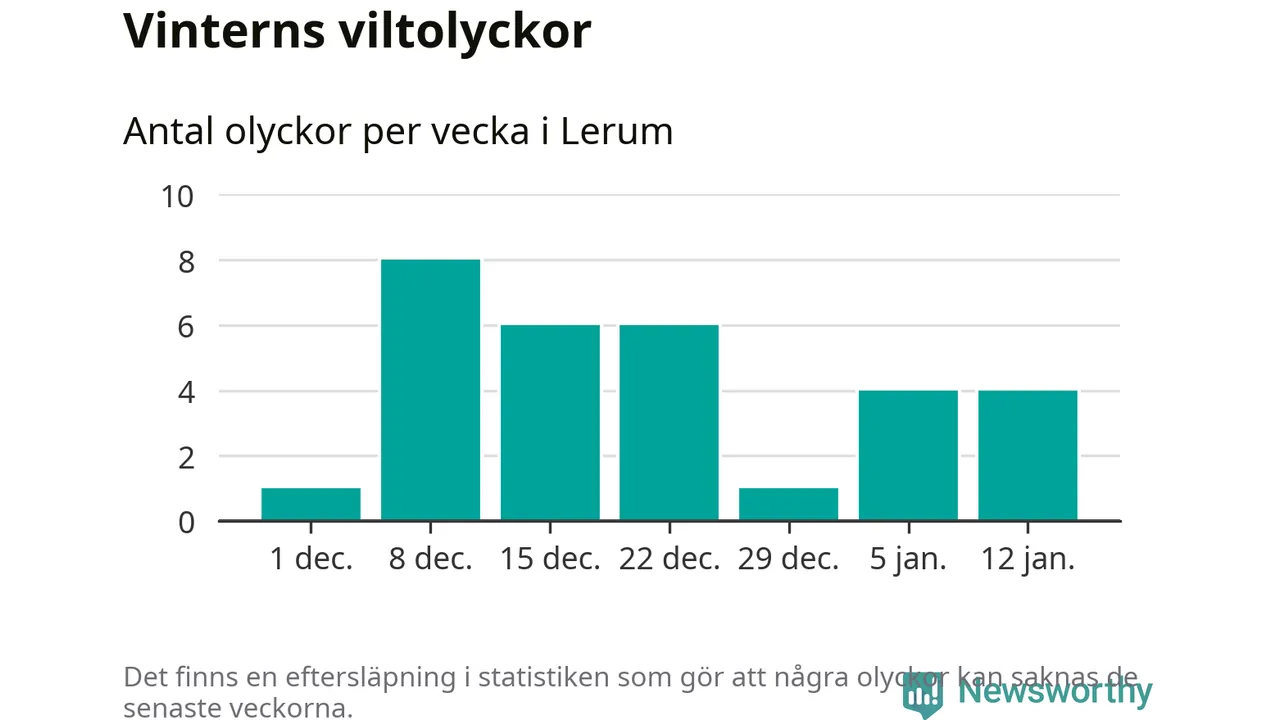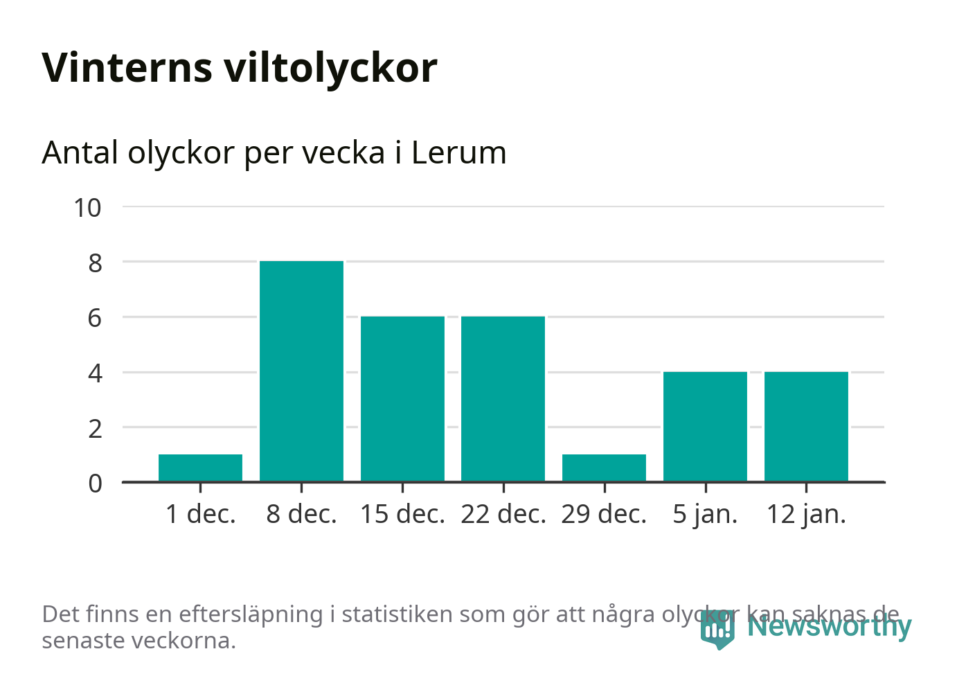 Under vecka 3 rapporterades fyra viltolyckor in i Lerums kommun. Därmed har det inträffat fler viltolyckor hittills den här vintern, än det brukar göra en hel genomsnittlig vinter.