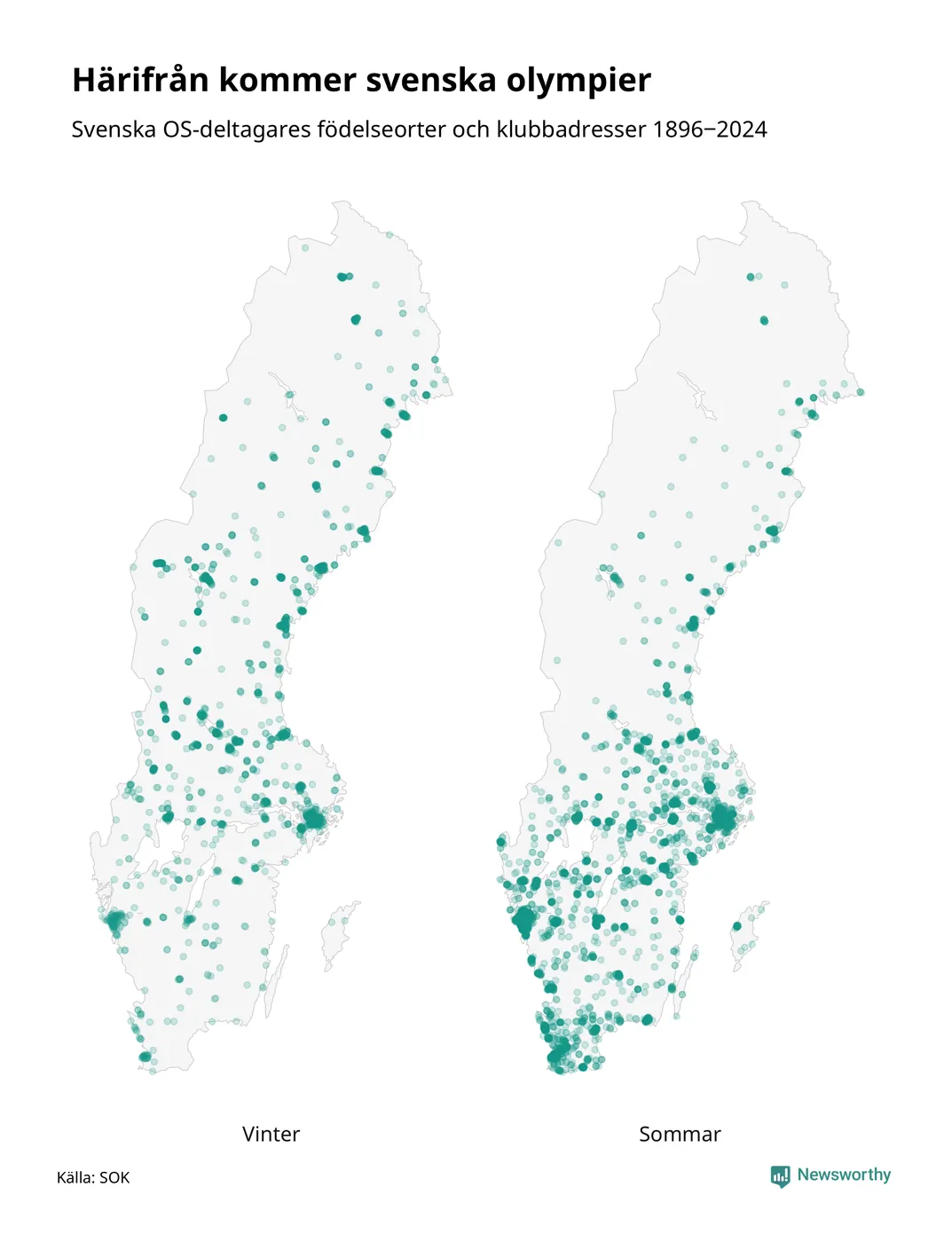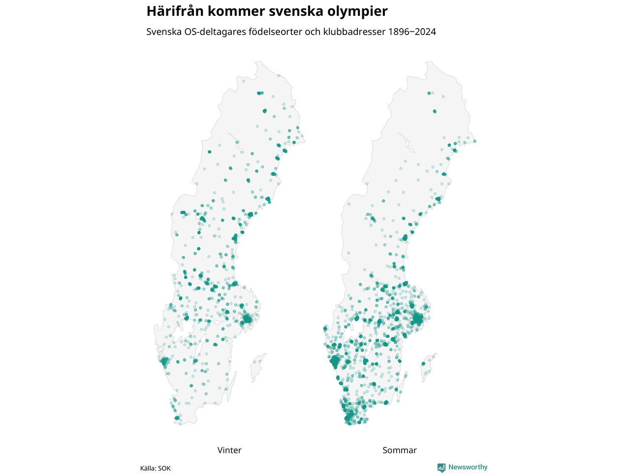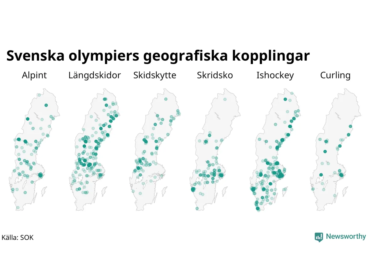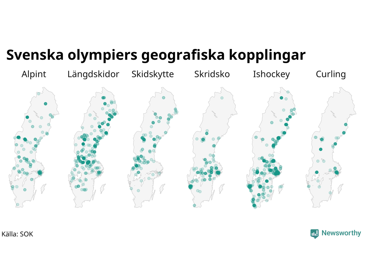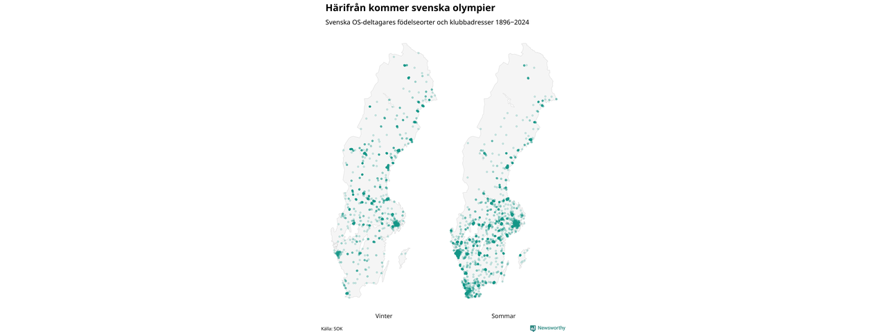 Men hur många av alla svenska olympier har koppling till Katrineholm? Newsworthy har gått igenom samtliga svenska OS-deltagare och, baserat på födelseort och klubbtillhörighet vid de aktuella spelen, kopplat dem till 283 svenska kommuner.