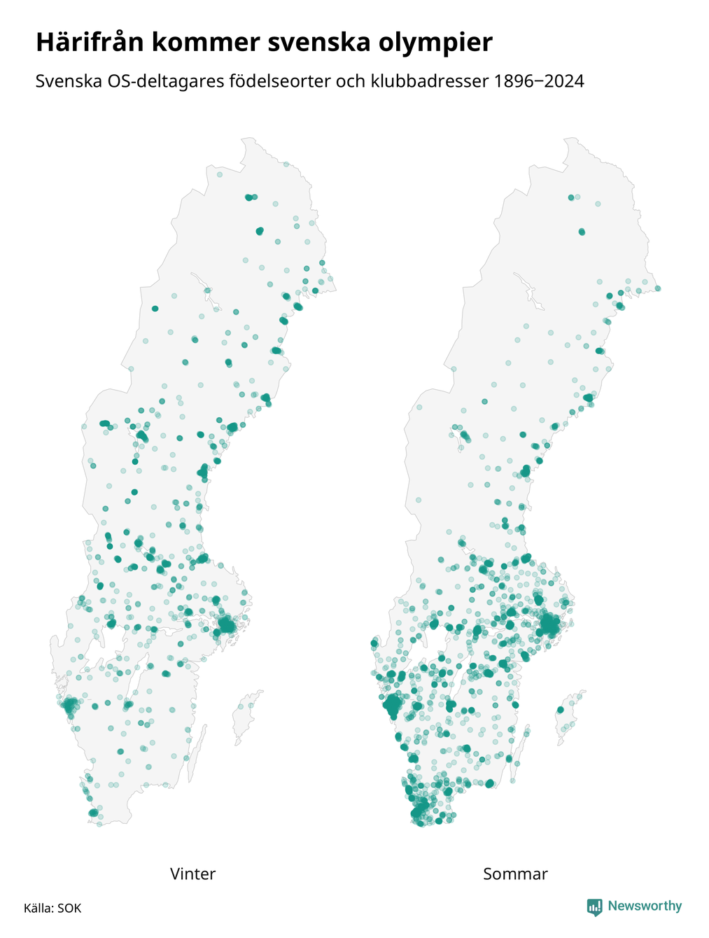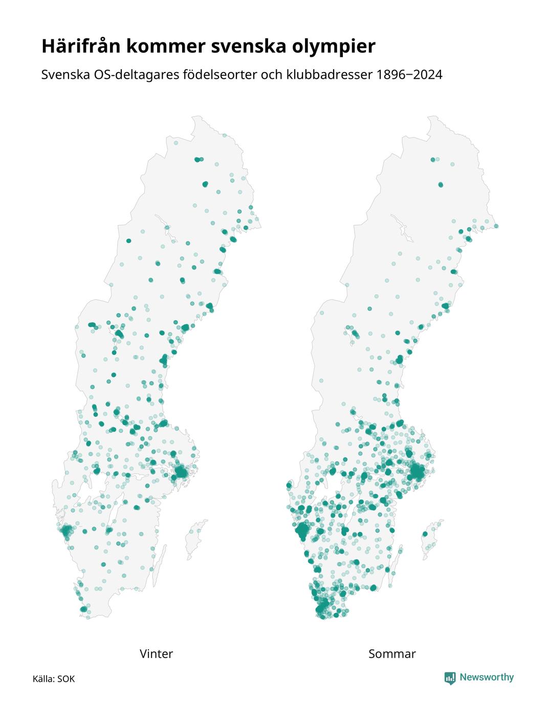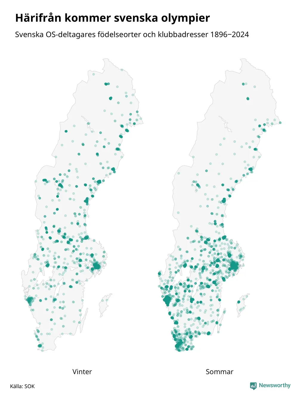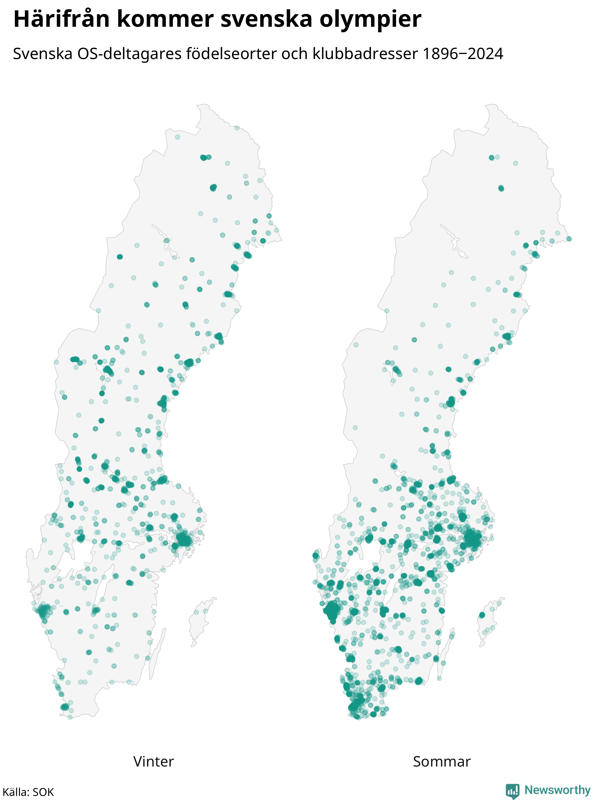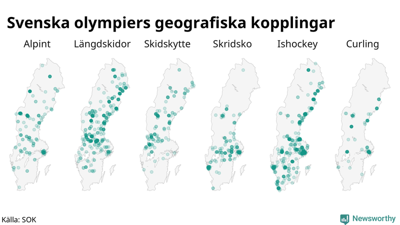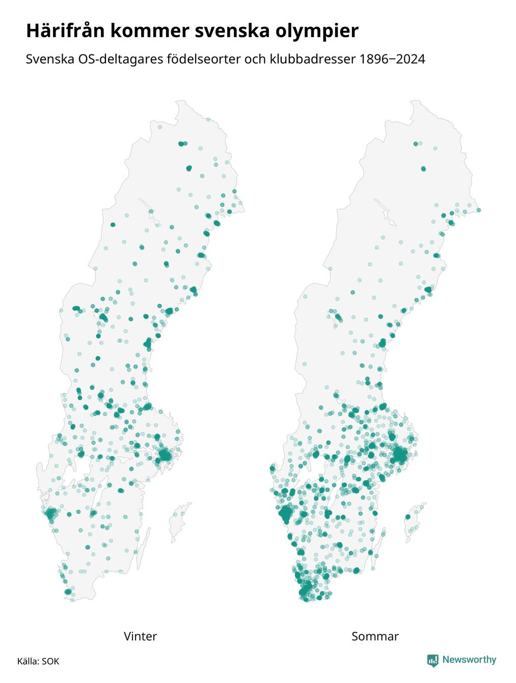 Men hur många av alla svenska olympier har koppling till Katrineholm? Newsworthy har gått igenom samtliga svenska OS-deltagare och, baserat på födelseort och klubbtillhörighet vid de aktuella spelen, kopplat dem till 283 svenska kommuner.