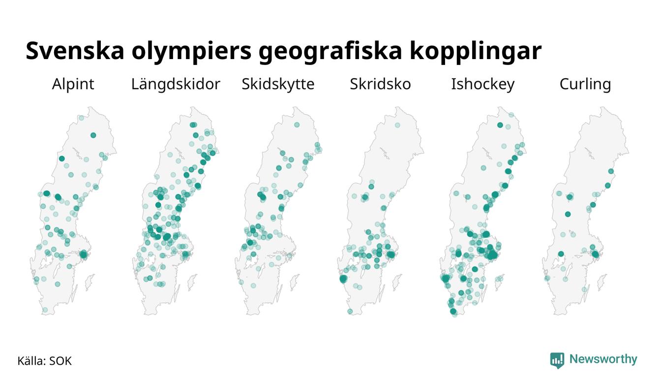 Ishockeyspelarna har störst spridning (de är också många): Emma Eliasson, som var med och tog silver i Turin 2006, är född i Karesuando. Patric Kjellberg, som fanns med i guldlaget i Lillehammer 1994, är född i Trelleborg. Längdskidåkarna finns främst från norra Värmland och Dalarna och uppåt. De alpina kopplingarna är – föga förvånande – flest i fjällkommunerna.