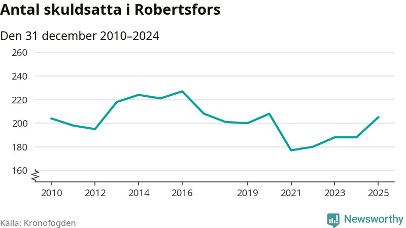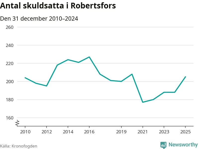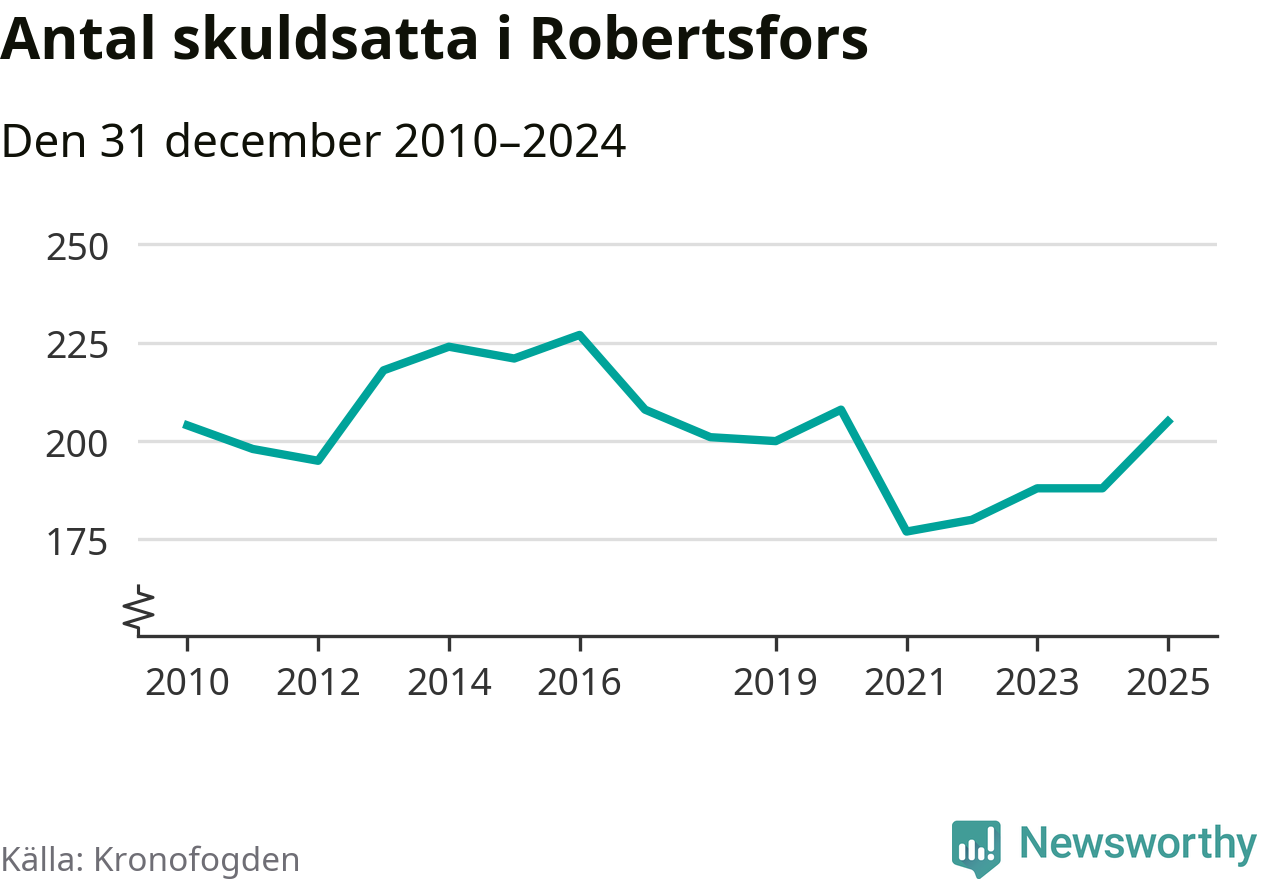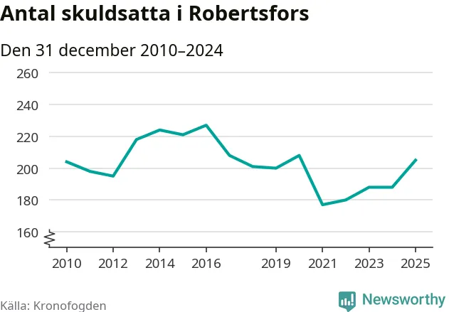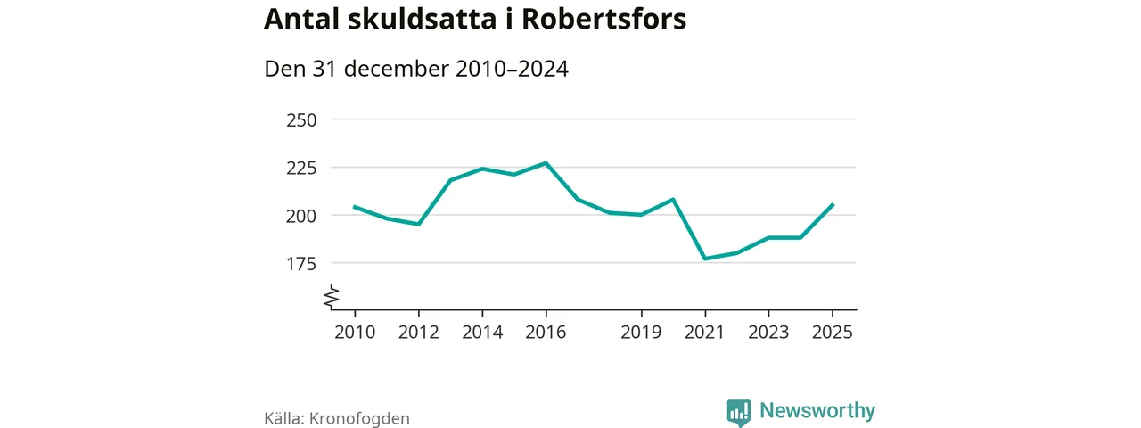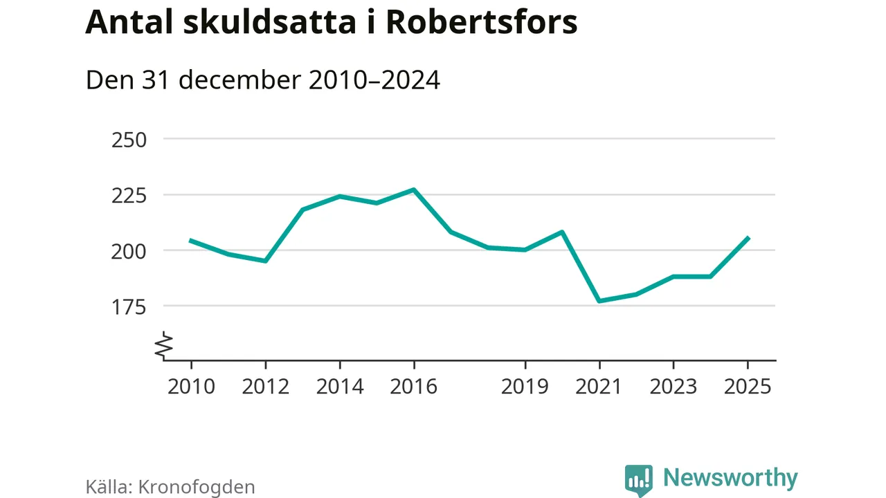 Antalet Robertsforsbor hos Kronofogden ökade i fjol. Vid årskiftet var 205 invånare i kommunen skyldiga totalt 56 miljoner kronor. Det är en ökning med 17 personer – eller 9 procent – jämfört med året innan. Det är det högsta antalet sedan 2020.