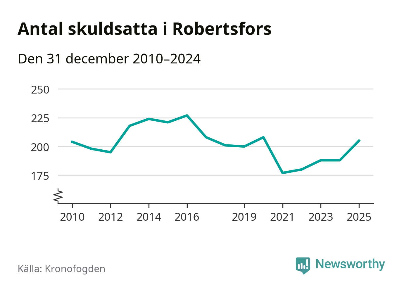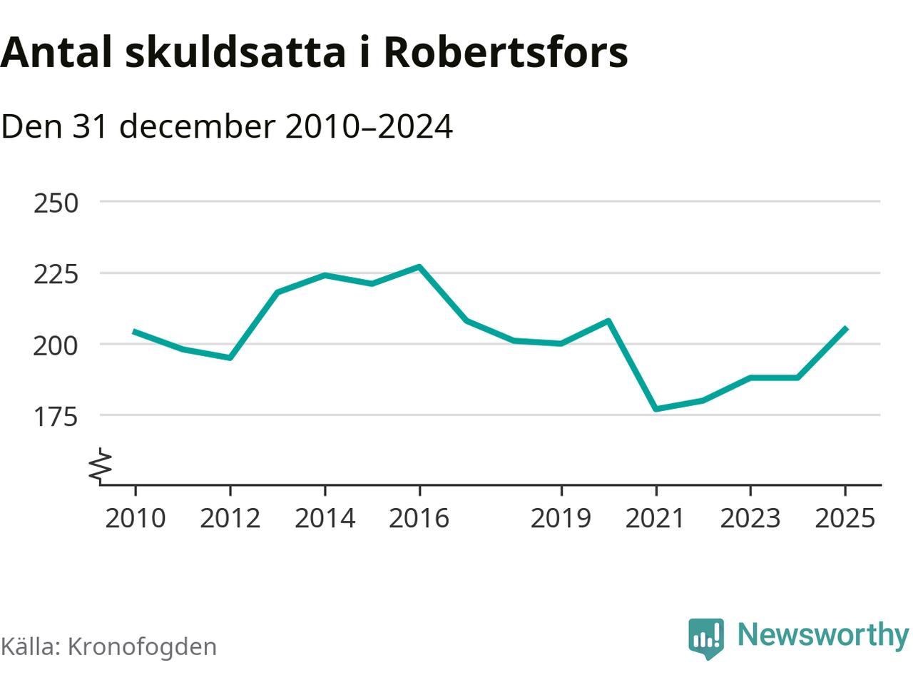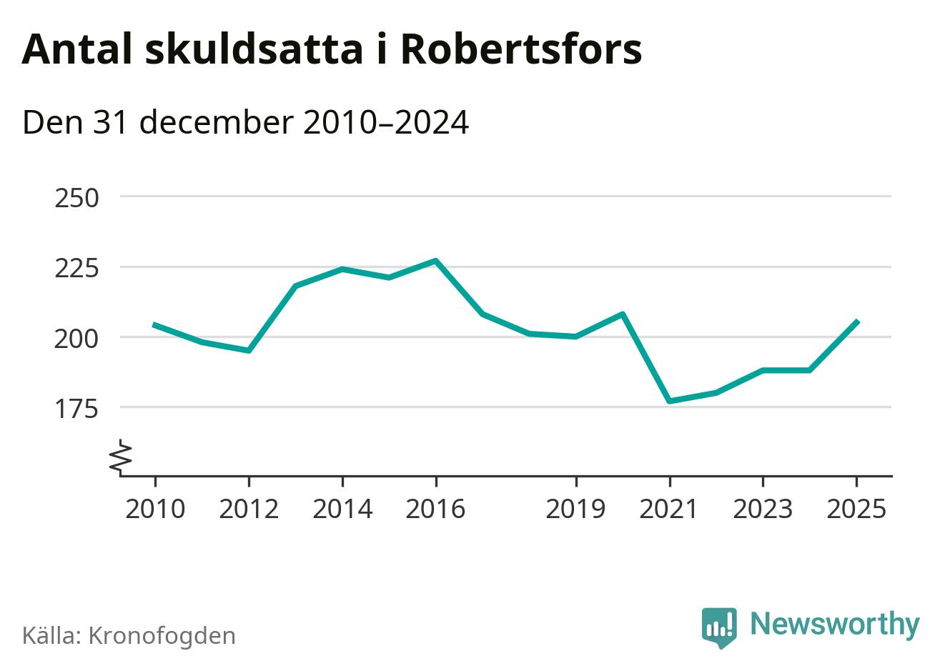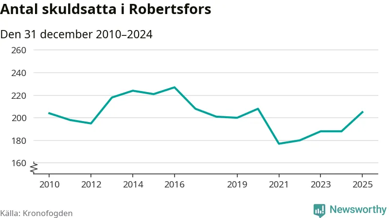Antalet Robertsforsbor hos Kronofogden ökade i fjol. Vid årskiftet var 205 invånare i kommunen skyldiga totalt 56 miljoner kronor. Det är en ökning med 17 personer – eller 9 procent – jämfört med året innan. Det är det högsta antalet sedan 2020.
