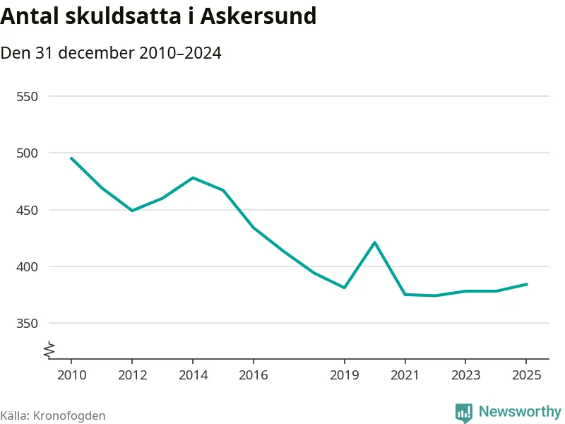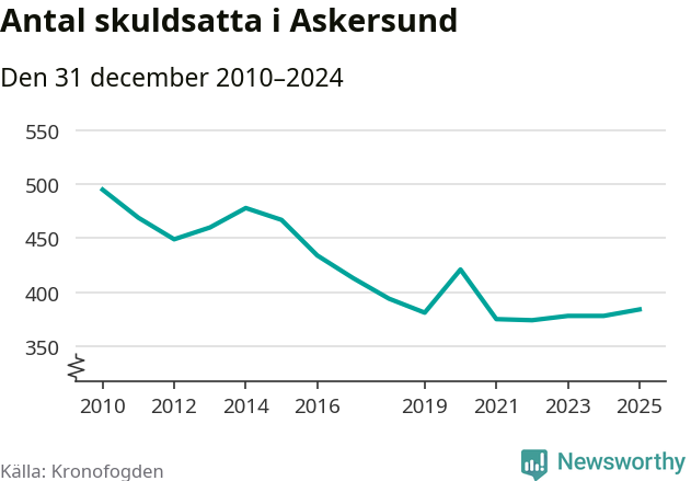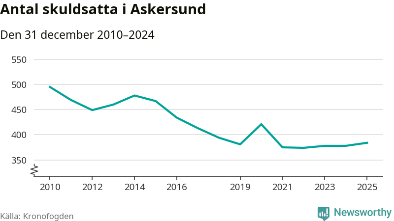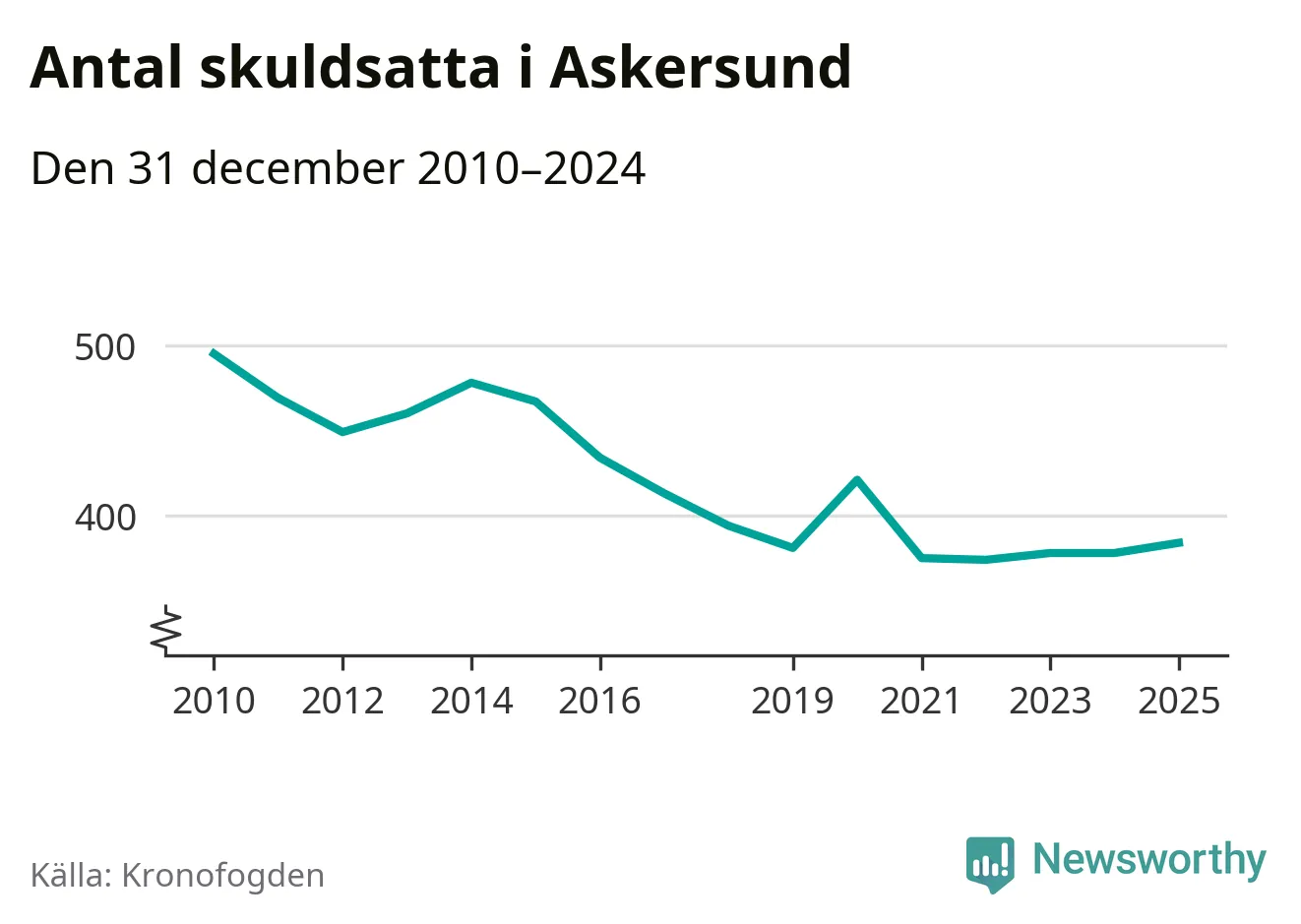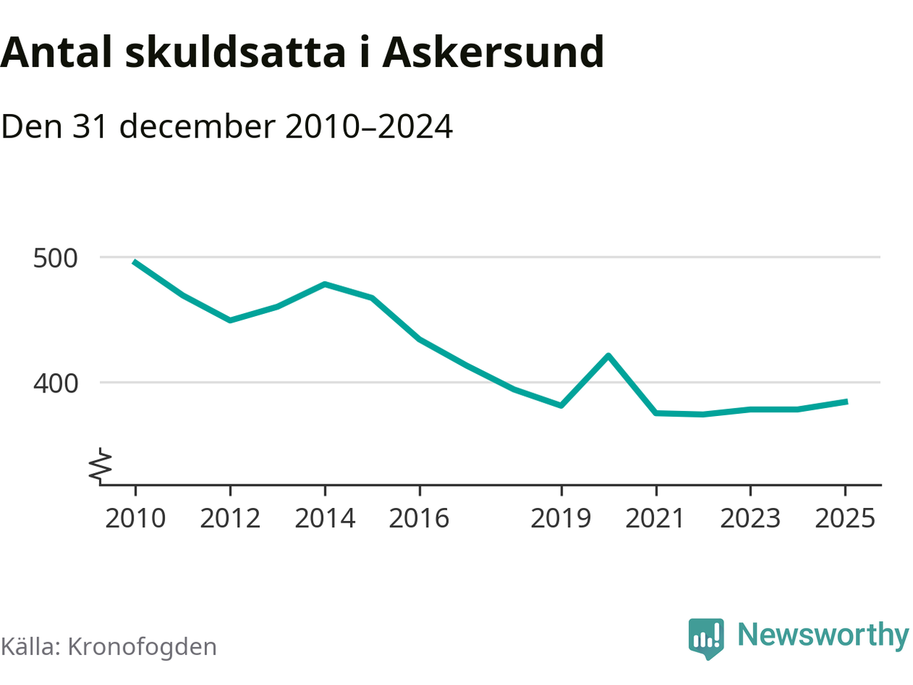Antalet Askersunds­bor hos Kronofogden ökade i fjol. Vid årskiftet var 384 invånare i kommunen skyldiga totalt 140,5 miljoner kronor. Det är en ökning med sex personer jämfört med året innan. Det är det högsta antalet sedan 2020.
