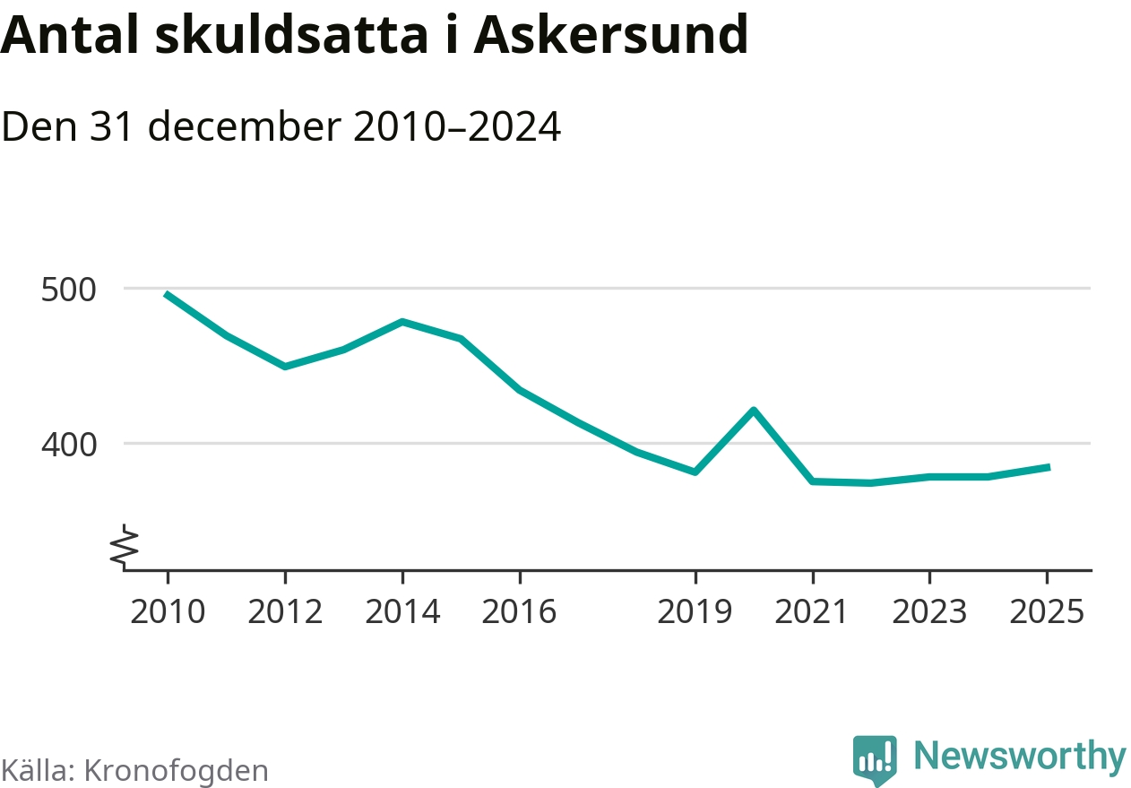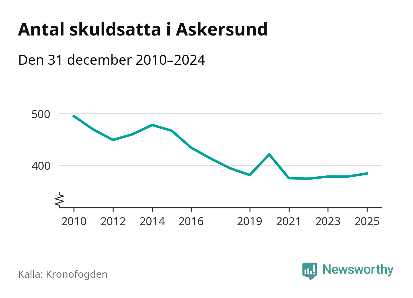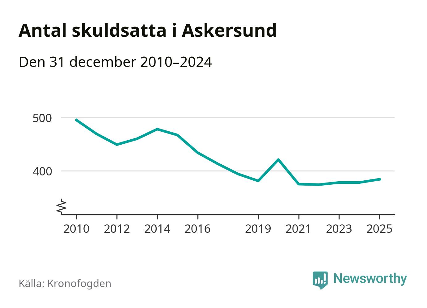 Antalet Askersunds­bor hos Kronofogden ökade i fjol. Vid årskiftet var 384 invånare i kommunen skyldiga totalt 140,5 miljoner kronor. Det är en ökning med sex personer jämfört med året innan. Det är det högsta antalet sedan 2020.