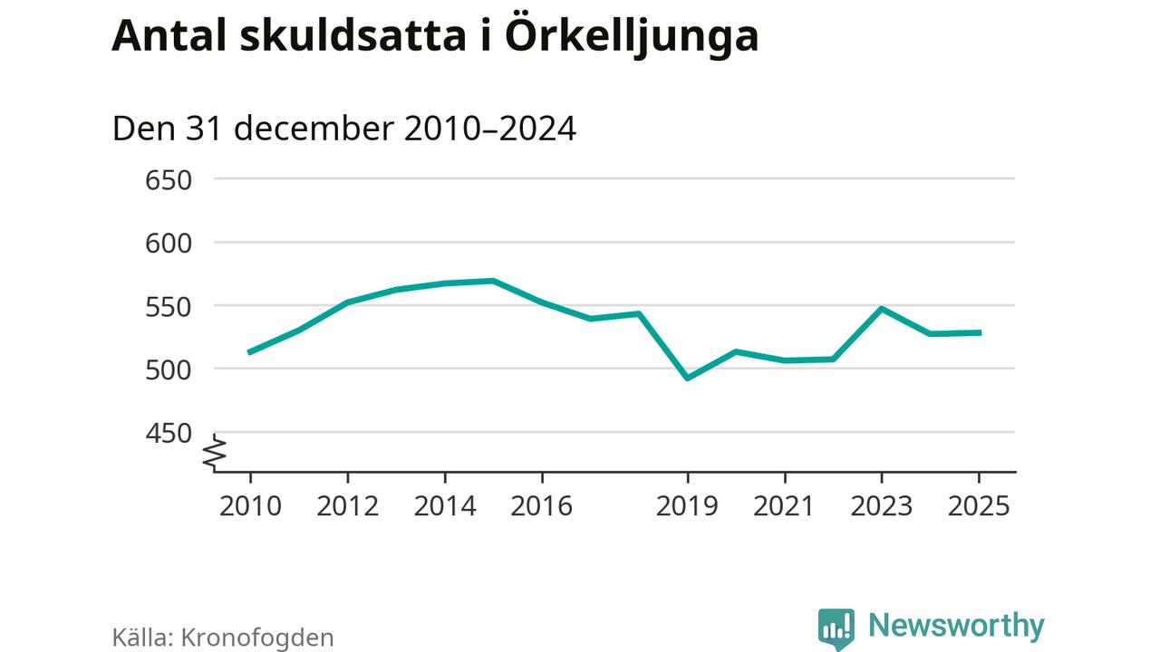 Vid årskiftet var 6 procent av alla Örkelljungabor över 18 år registrerade hos Kronofogden. Störst andel skuldsatta i länet finns i Perstorp (9 procent), medan den lägsta andelen finns i Lomma (1 procent).