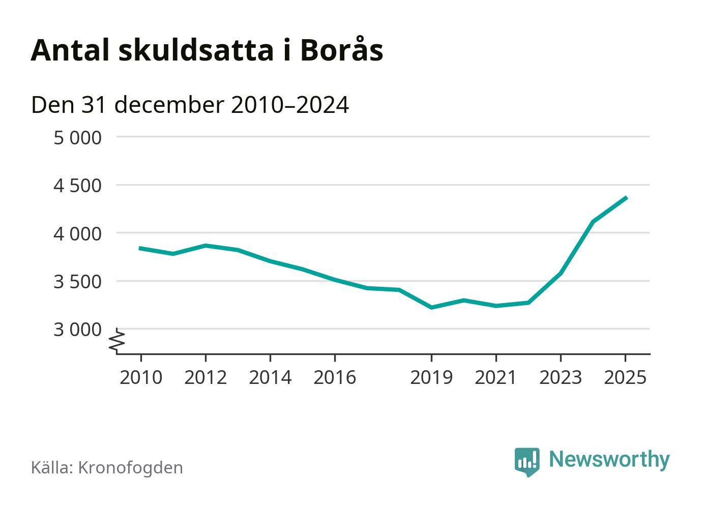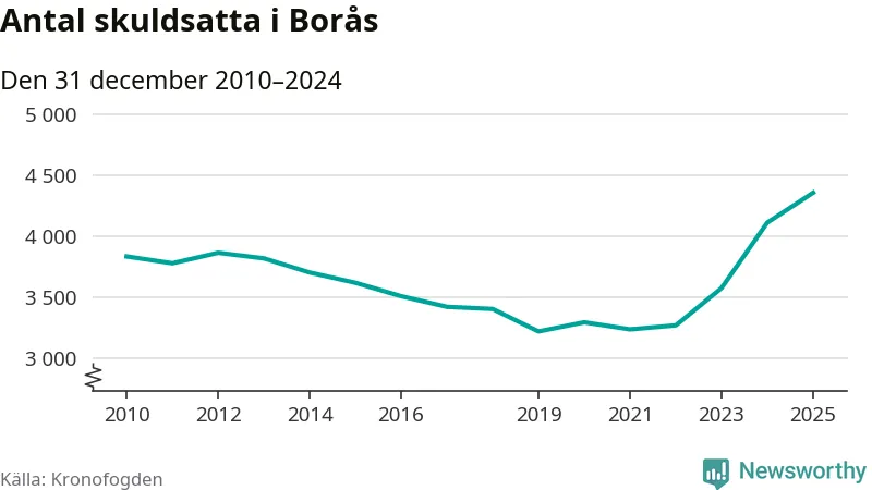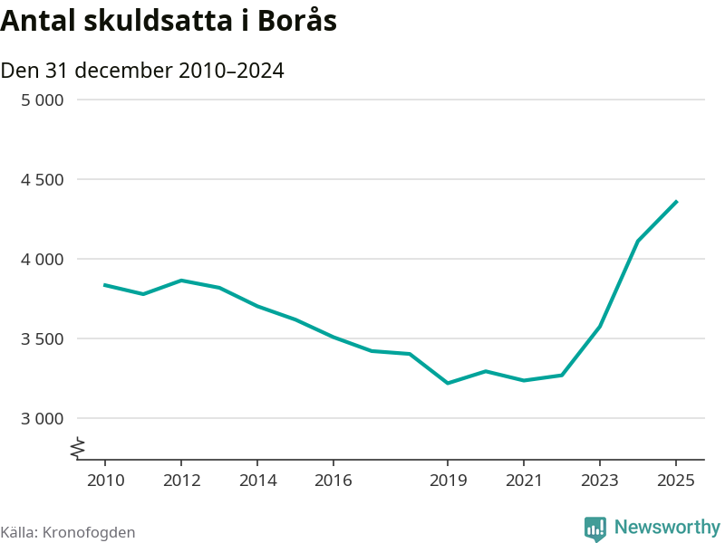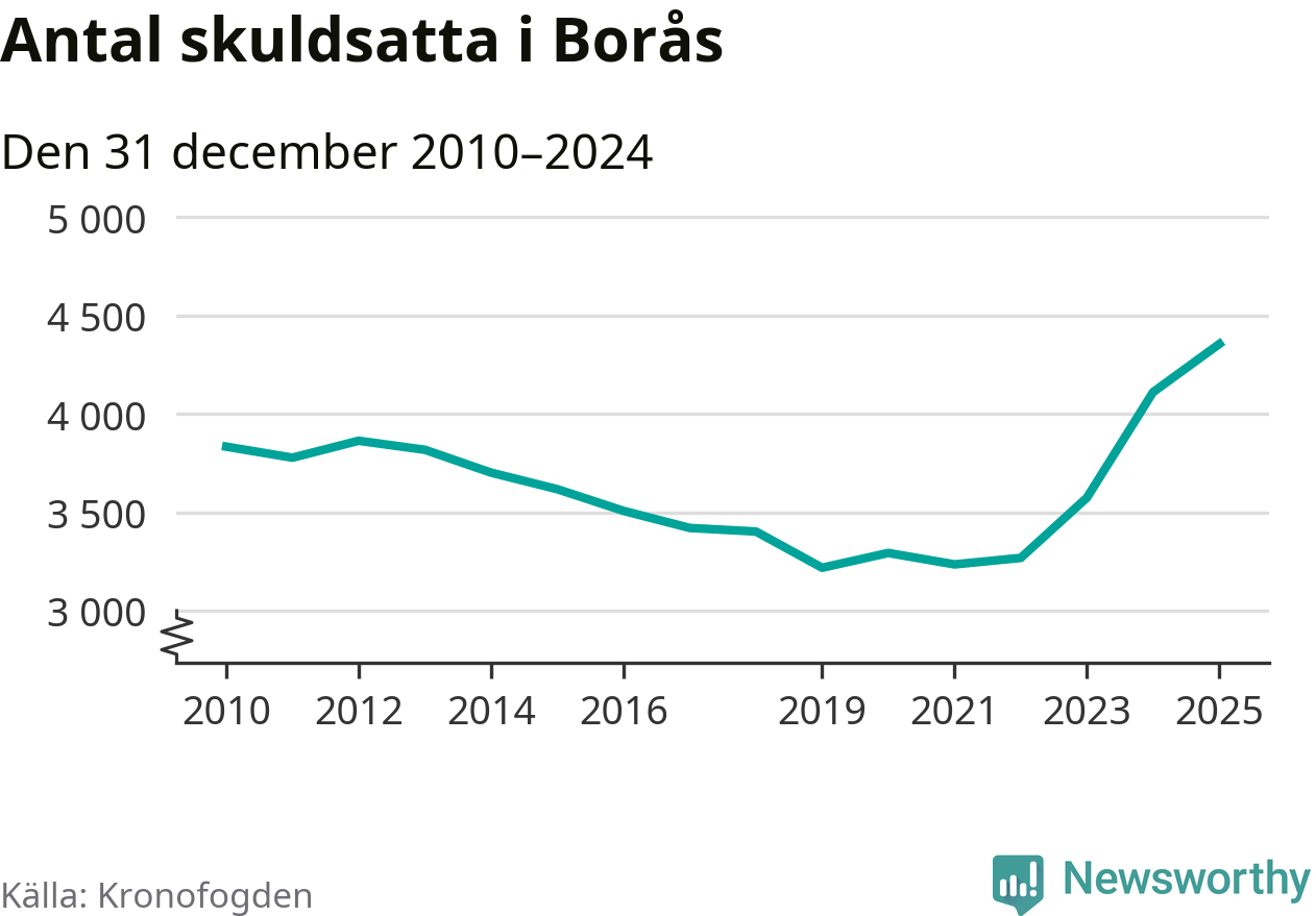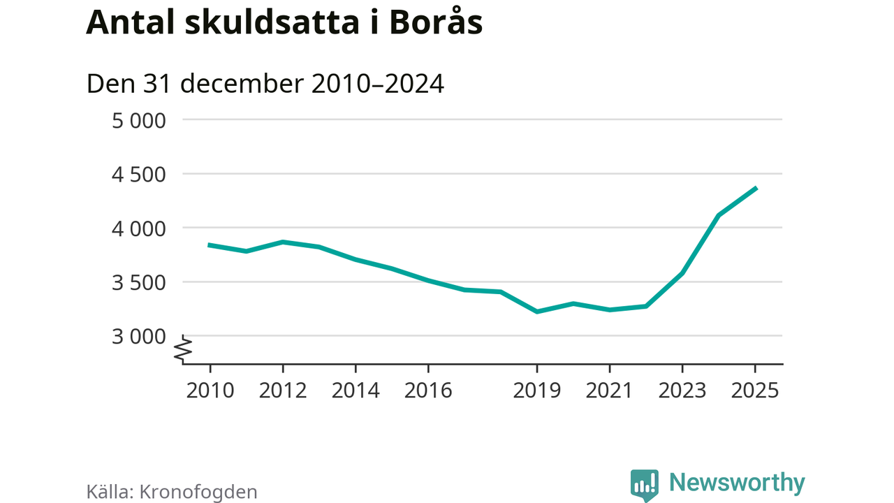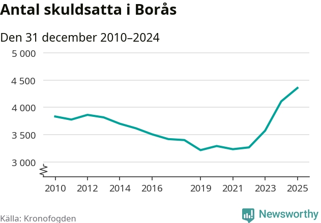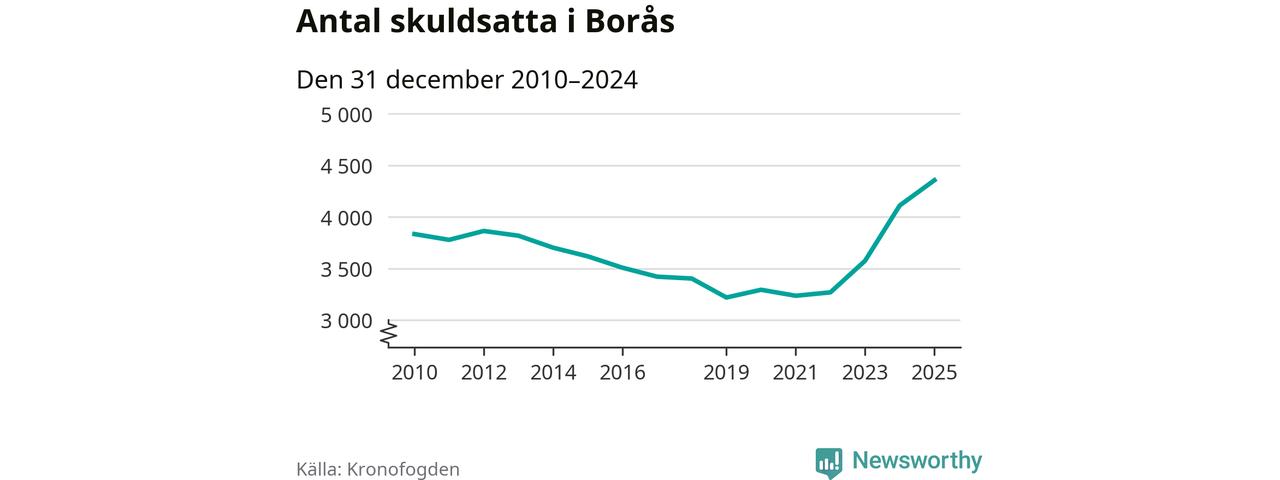 Inte sedan åtminstone 2010 har så många boråsare hamnat hos Kronofogden. Vid årskiftet var 4 355 invånare i kommunen skyldiga totalt 1,3 miljarder kronor. Det är en ökning med 245 personer – eller 6 procent – jämfört med året innan.