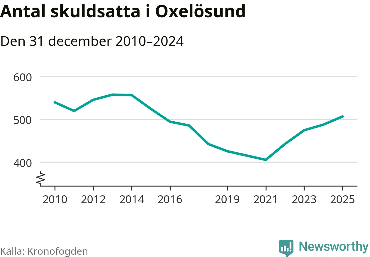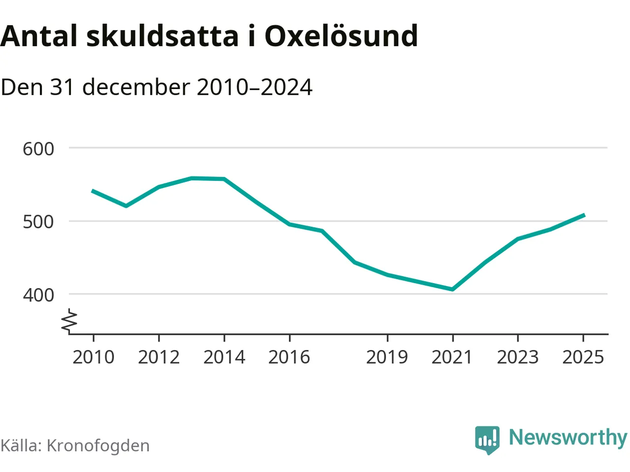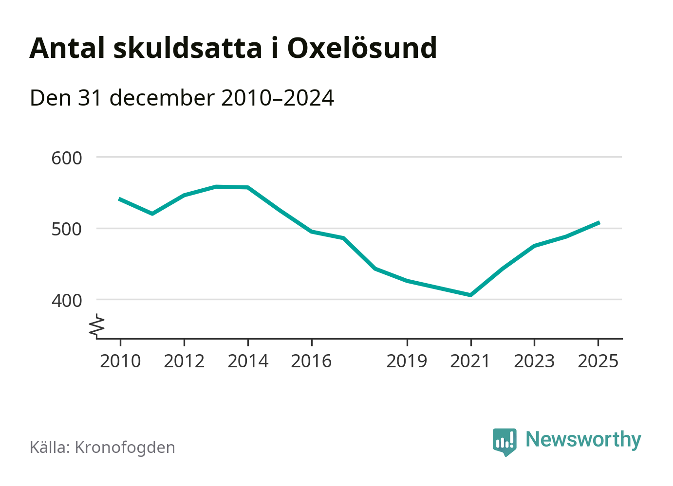 Allt fler Oxelösunds­bor hamnar hos Kronofogden. Vid årskiftet var 507 invånare i kommunen skyldiga totalt 152,9 miljoner kronor. Det är en ökning med 19 personer – eller 4 procent – jämfört med året innan. Det är det högsta antalet sedan 2015.